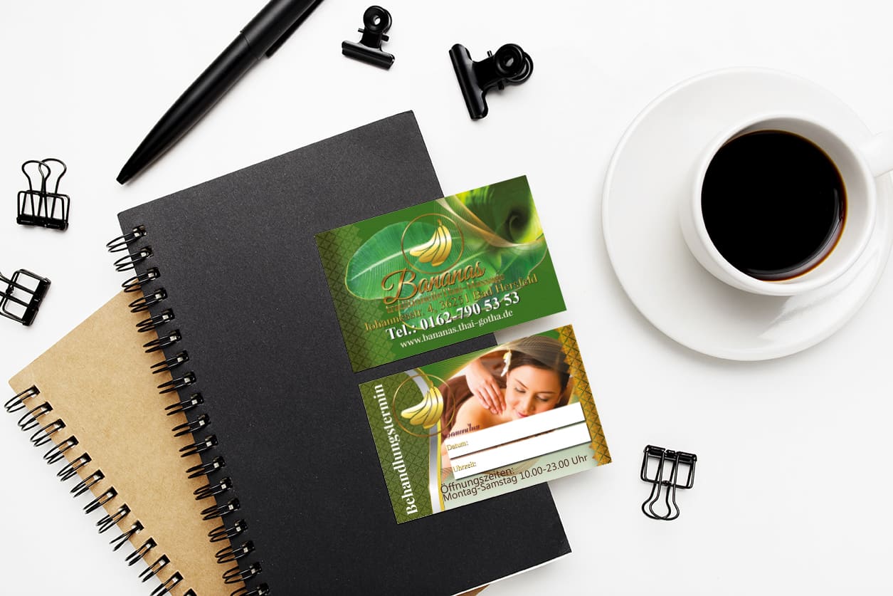 Entdecken Sie das kreative Visitenkarten-Design für Ihr Bio Spa bei Thai-Webmaster DE. Lassen Sie sich von unseren erfahrenen Grafikdesignern inspirieren und erhalten Sie eine maßgeschneiderte Gestaltung!