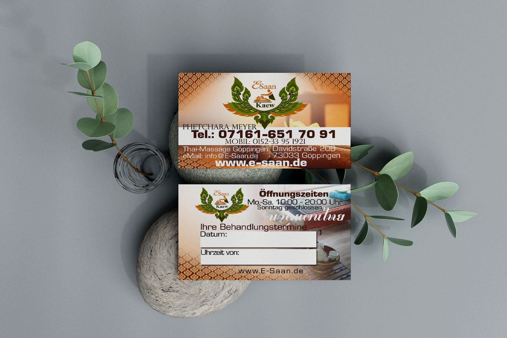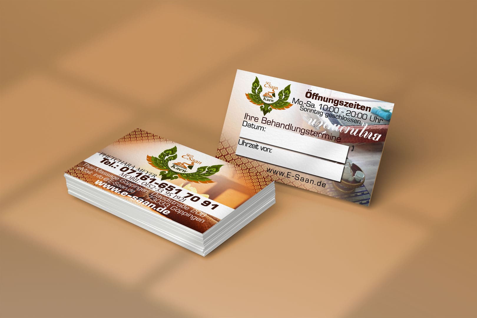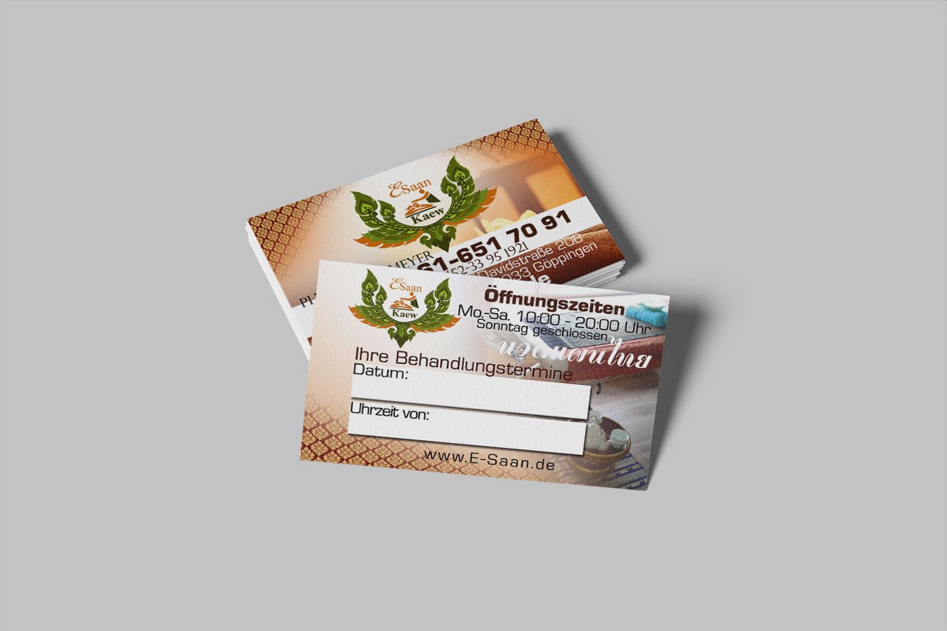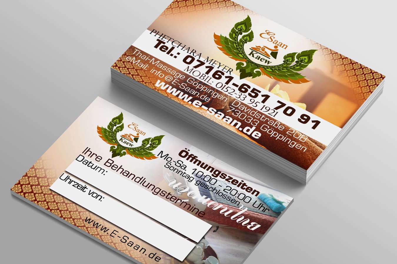 Design E-Saan Thai-Massage in Göppingen Tradition trifft Moderne: Unser Thai Mediendesigner aus Deutschland kreiert individuelle Visitenkarten für Ihre Massagepraxis.