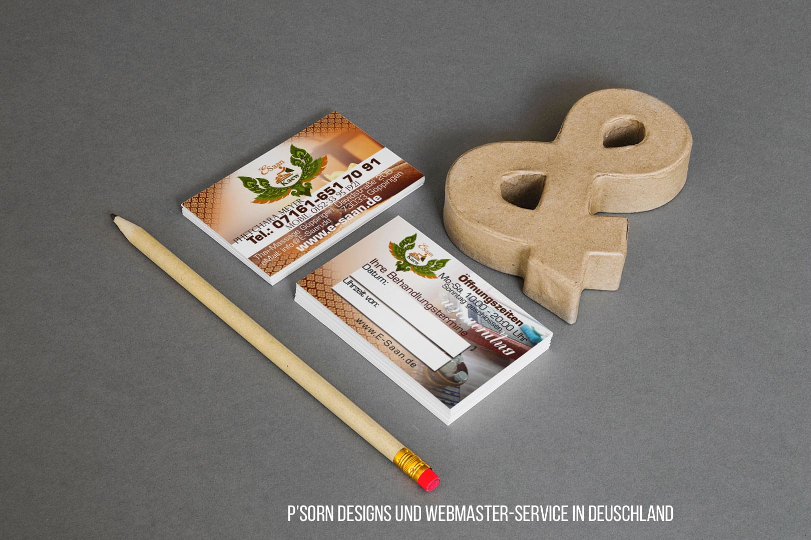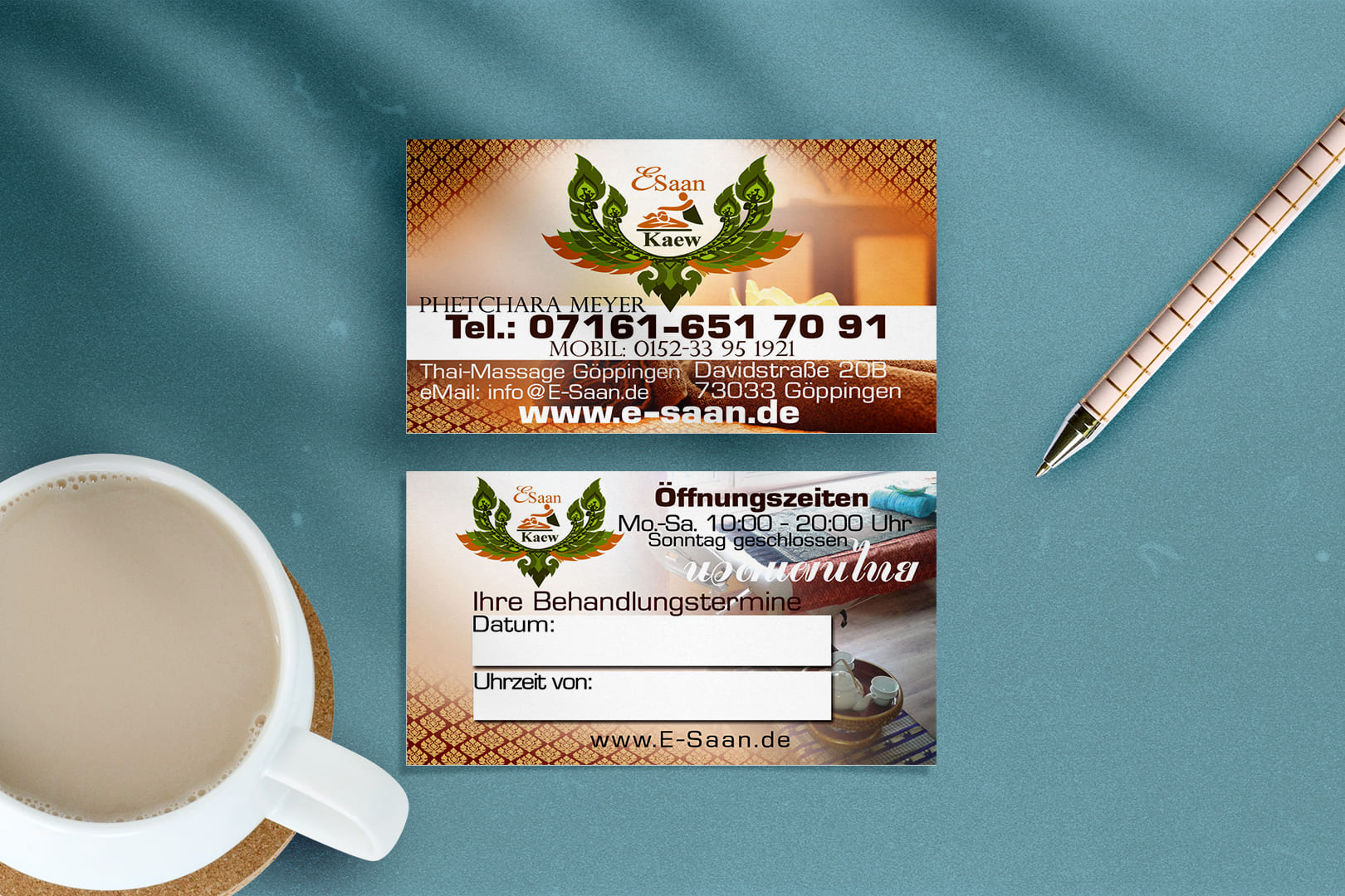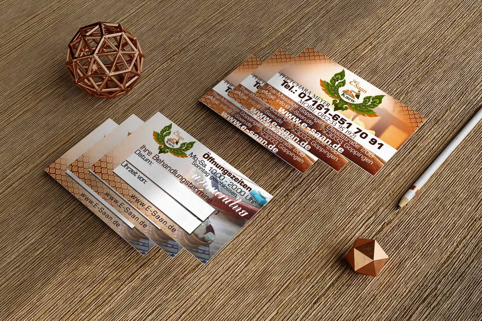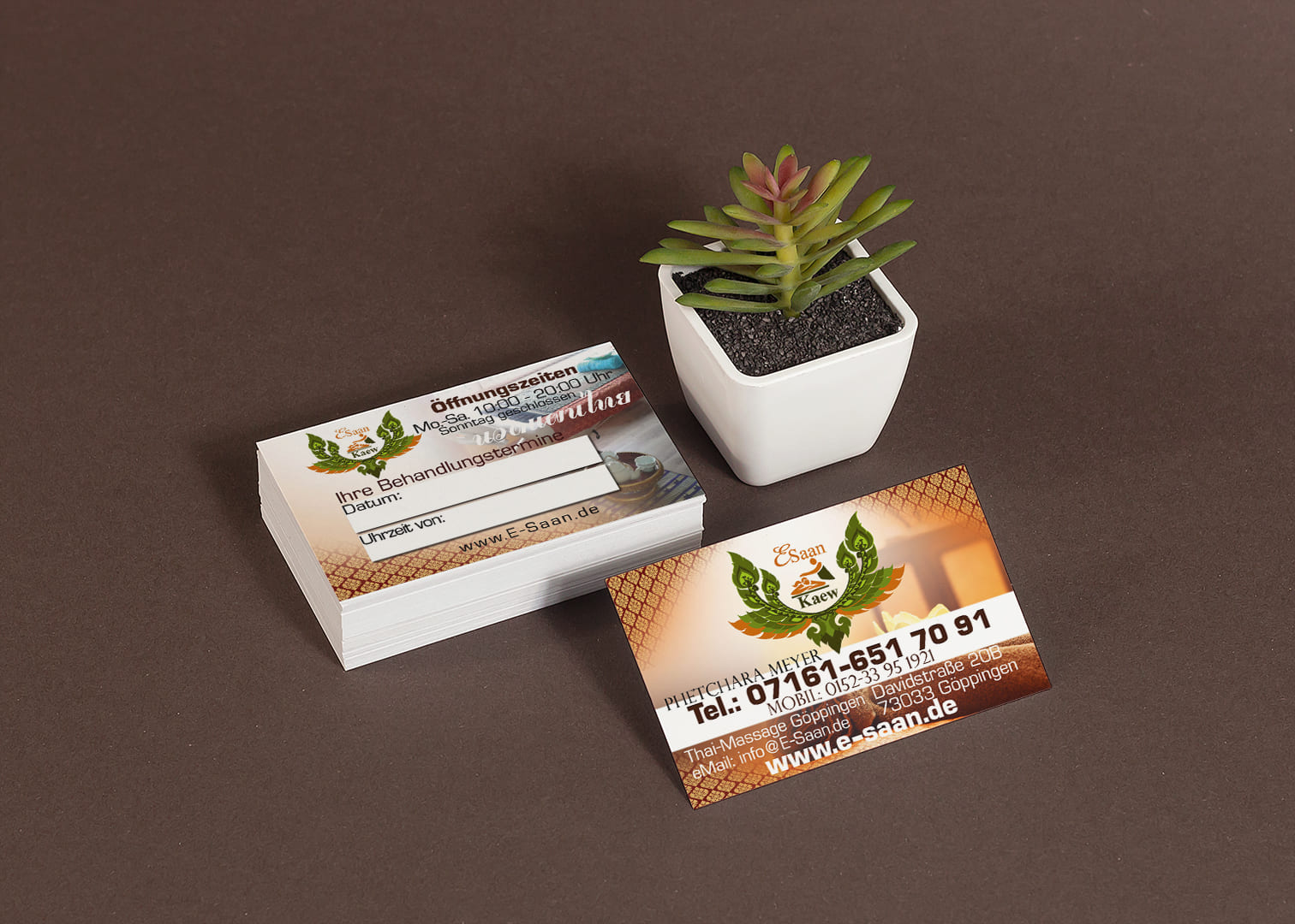Design E-Saan Thai-Massage in Göppingen Tradition trifft Moderne: Unser Thai Mediendesigner aus Deutschland kreiert individuelle Visitenkarten für Ihre Massagepraxis.