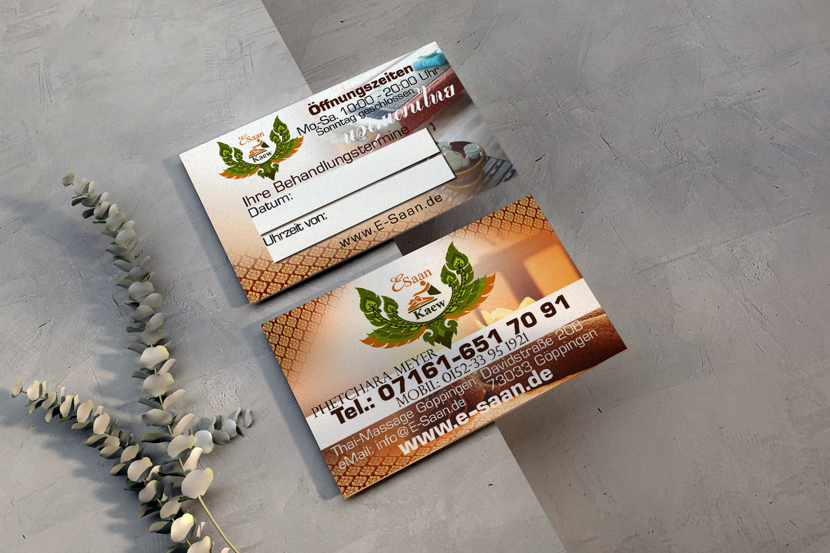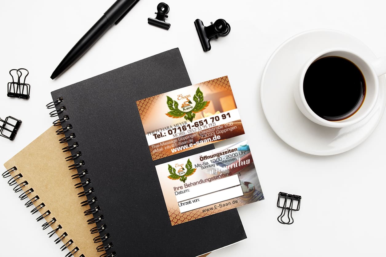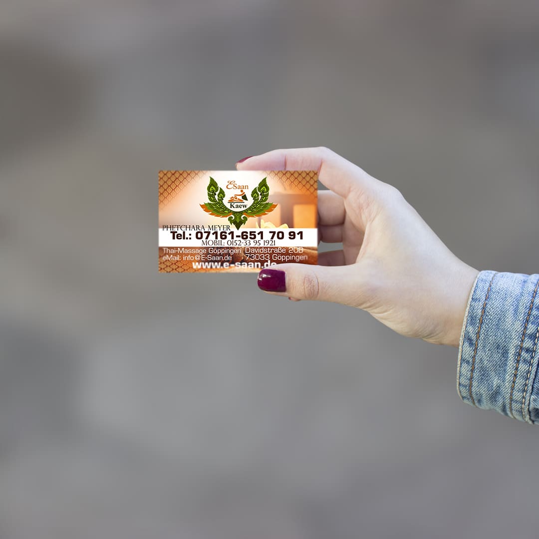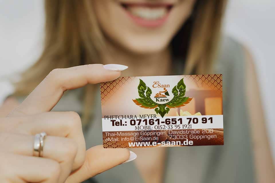 Lassen Sie uns gemeinsam eine eindrucksvolle Visitenkarte gestalten, die Ihre E-Saan Thai-Massage perfekt zur Geltung bringt!