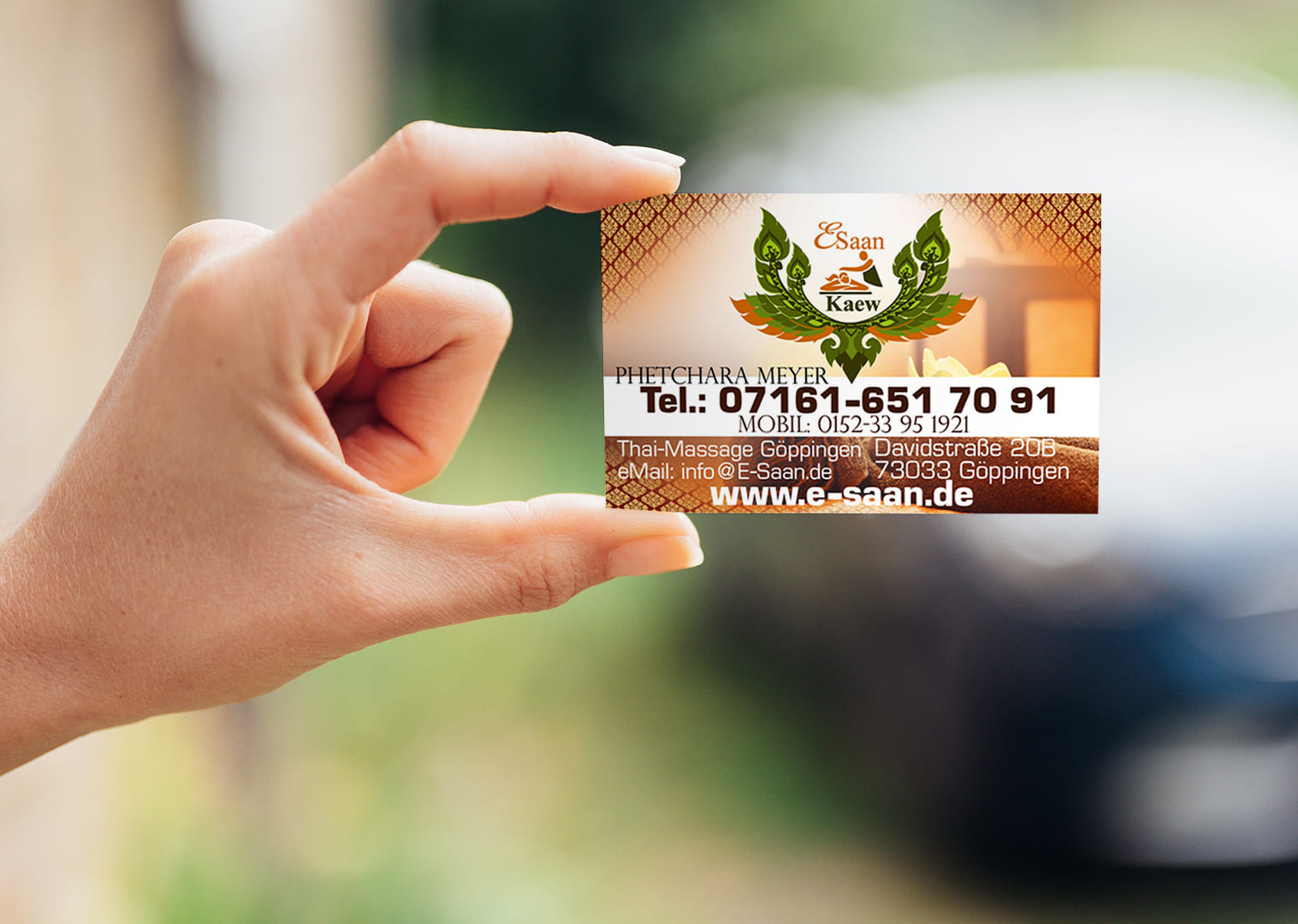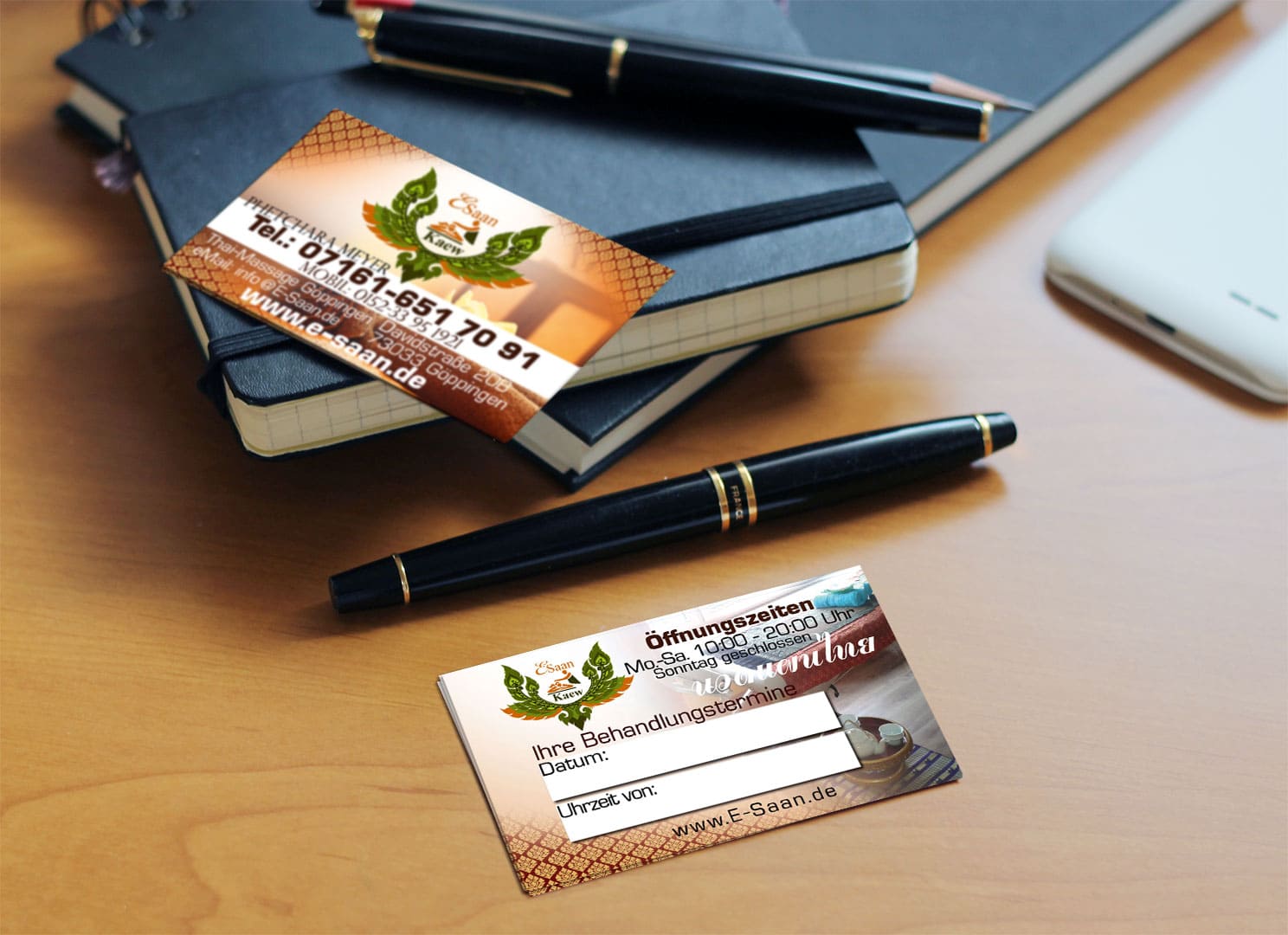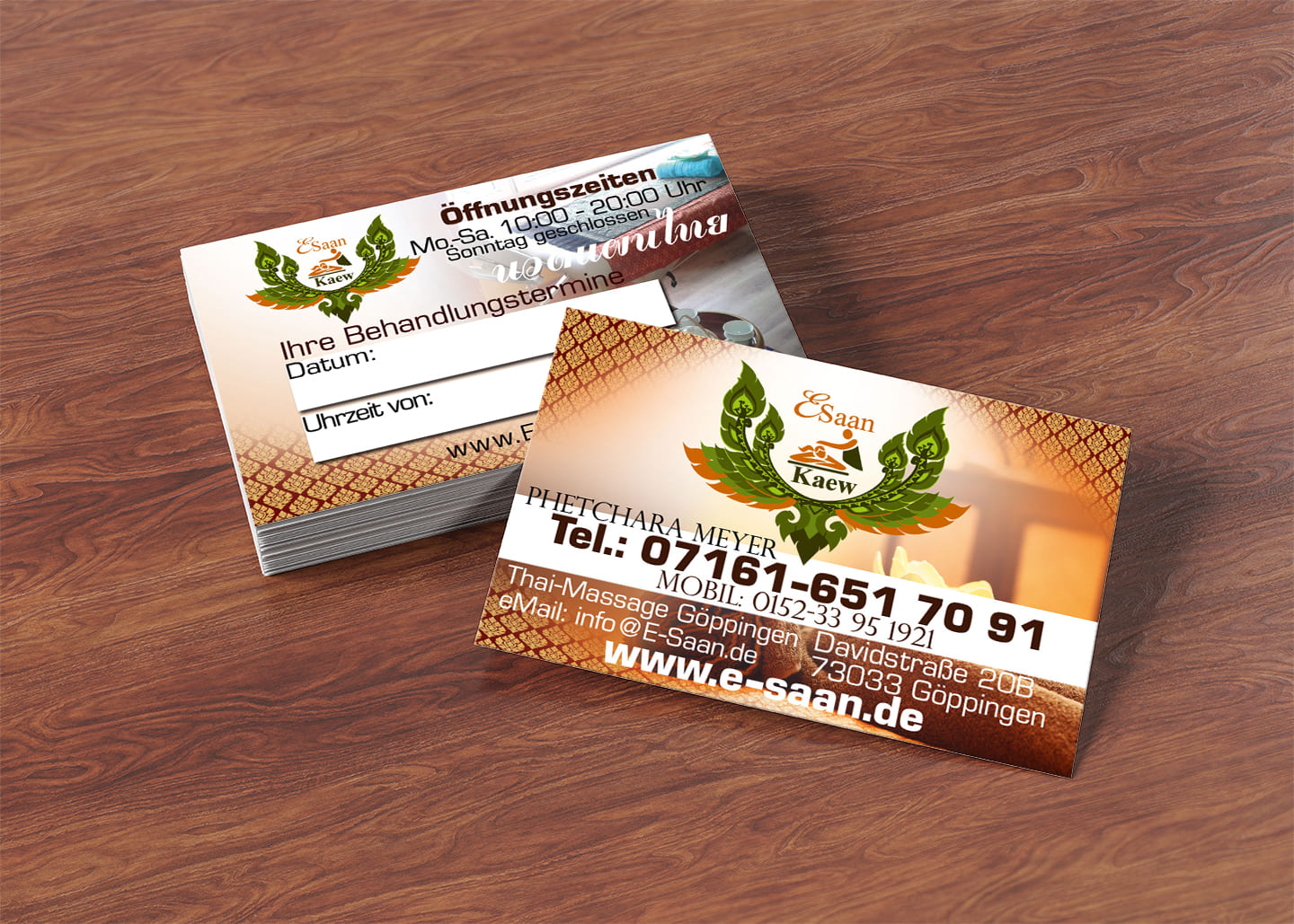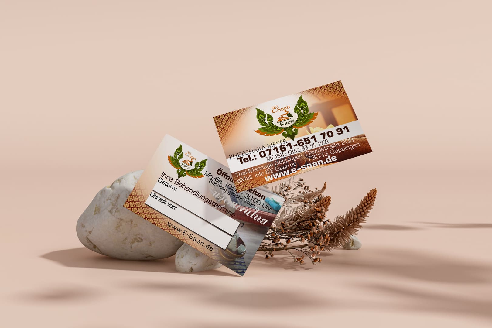 Lassen Sie uns gemeinsam eine eindrucksvolle Visitenkarte gestalten, die Ihre E-Saan Thai-Massage perfekt zur Geltung bringt!