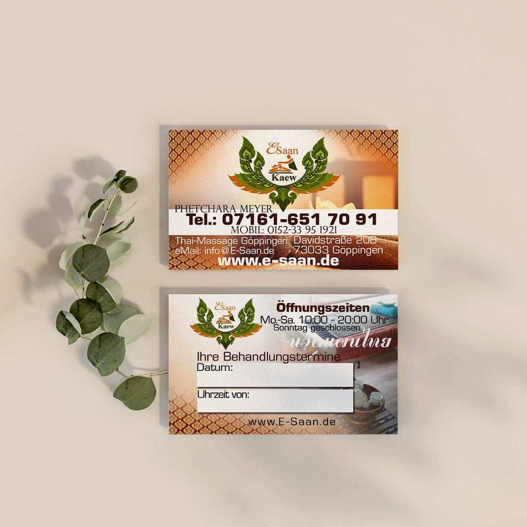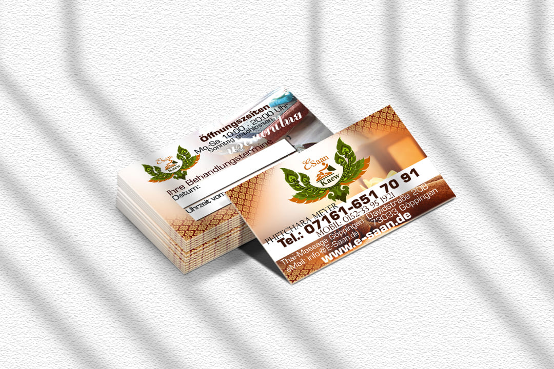 Auf unserer Website präsentieren wir Ihnen ein kreatives Referenzdesign für die Visitenkarte der E-Saan Thai-Massage in Göppingen. Unser Ziel ist es, Sie zu inspirieren und Ihnen die kreativen Möglichkeiten zu zeigen, die unser talentiertes Team zu bieten hat. Jedes Design wird individuell auf Ihre spezifischen Anforderungen abgestimmt.