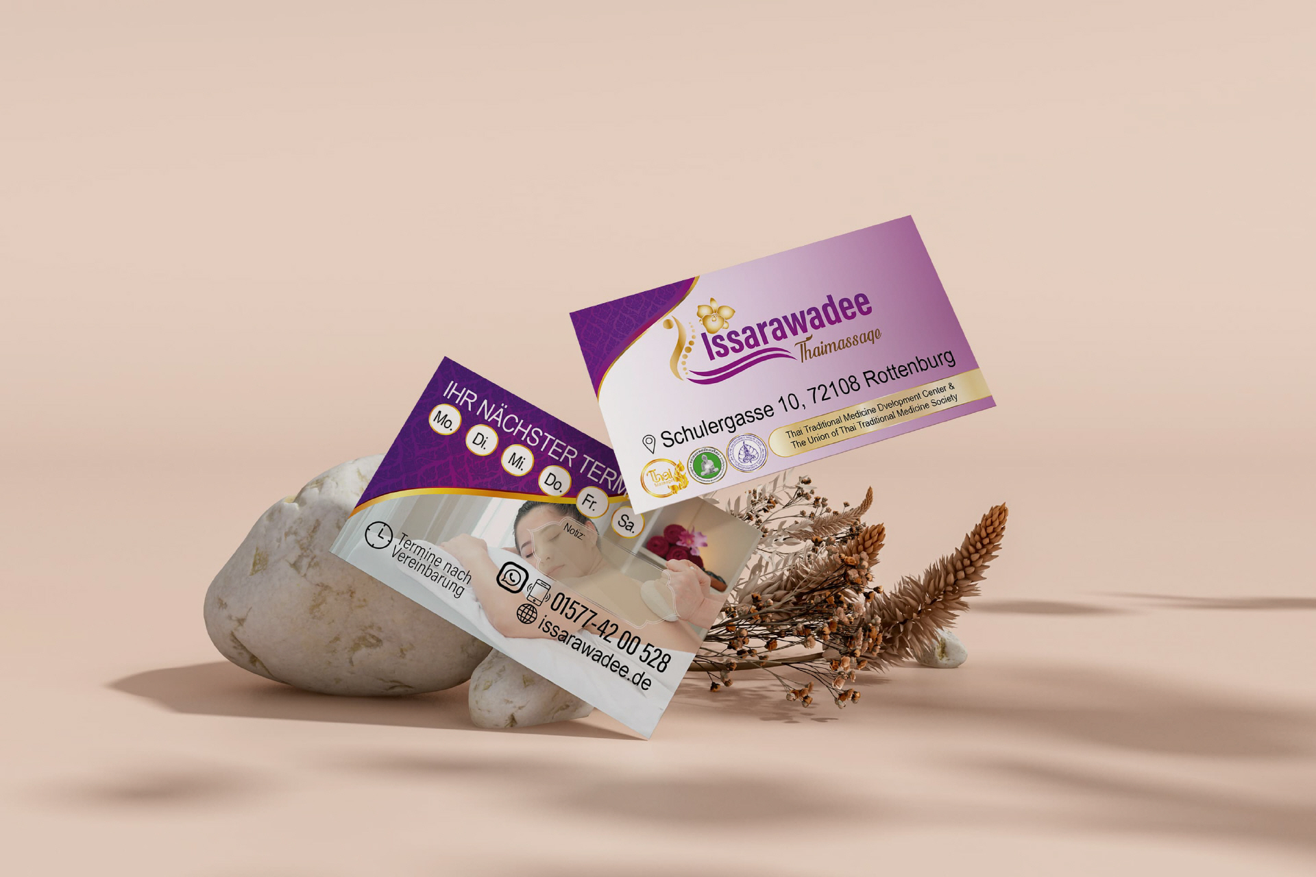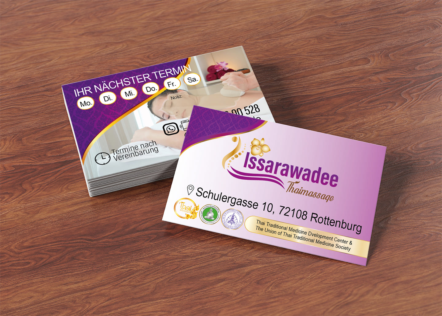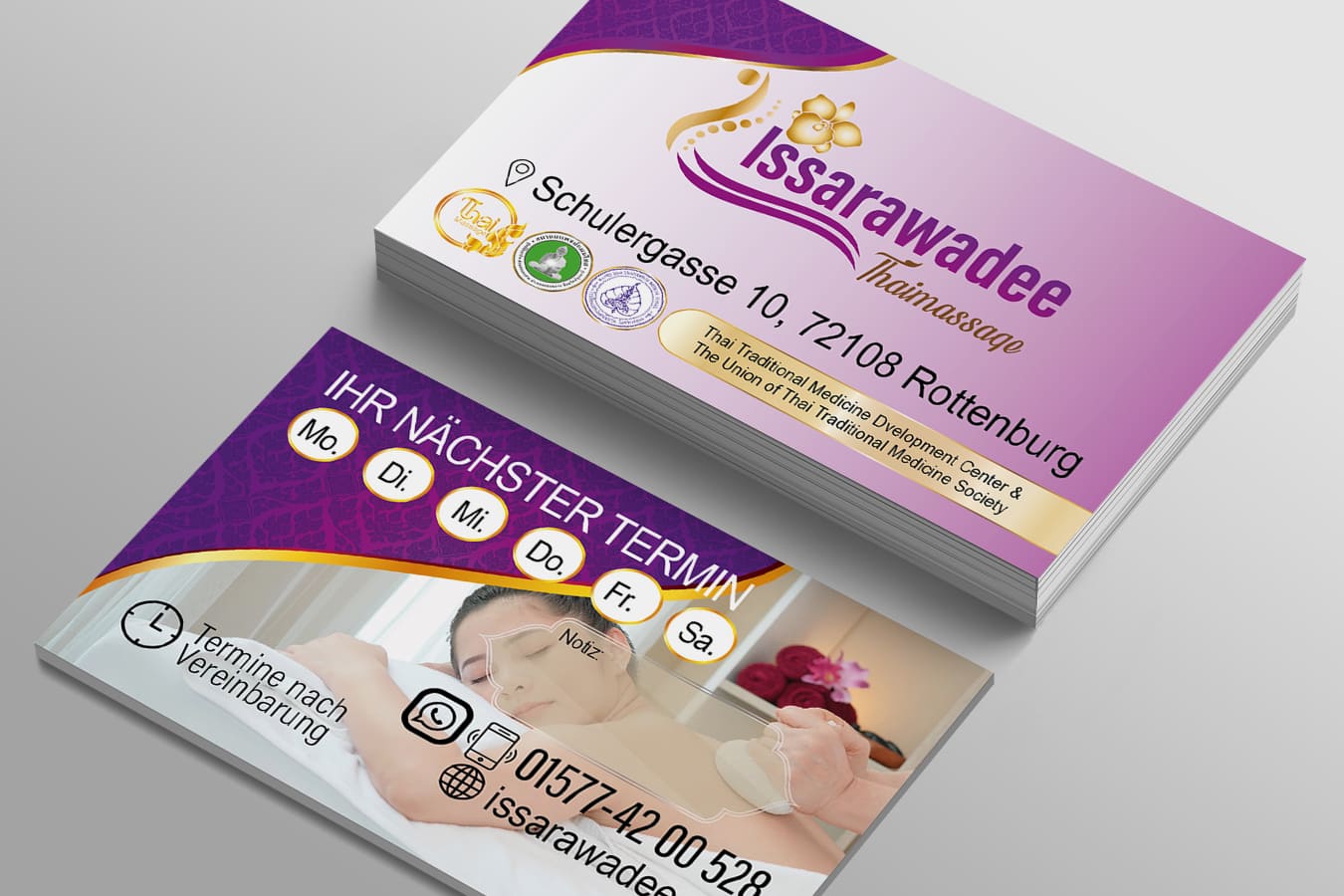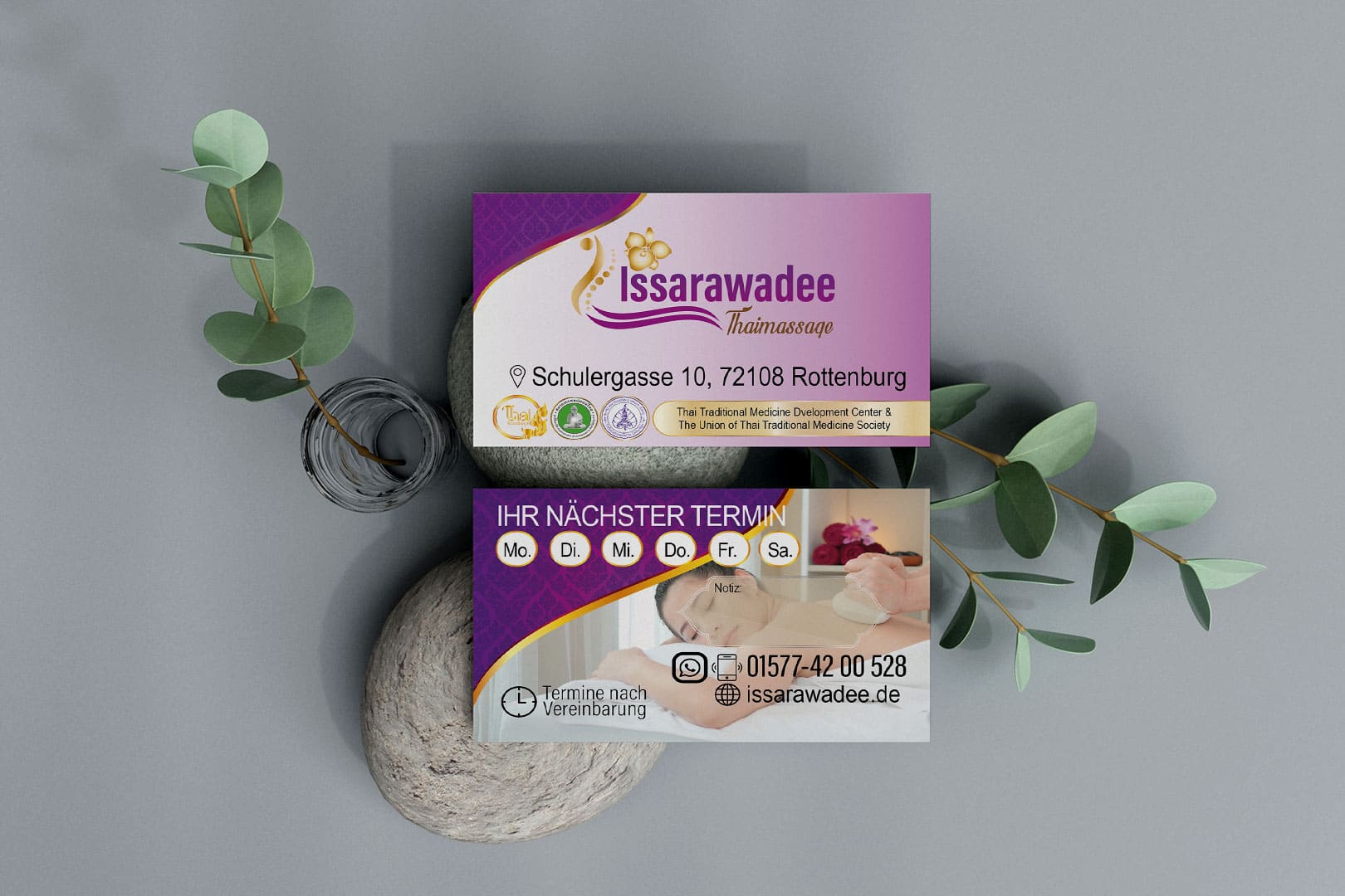 Wir von Thai-Webmaster DE sind Experten in Grafik- und Mediendesign und bieten maßgeschneiderte Visitenkarten für Thai-Massagenpraxen in Deutschland an. Unser kreatives Team hat bereits beeindruckende Designs für die Issarawadee Thai-Massagenpraxis in Rottenburg erstellt, die Sie auf unserer Webseite bewundern können.