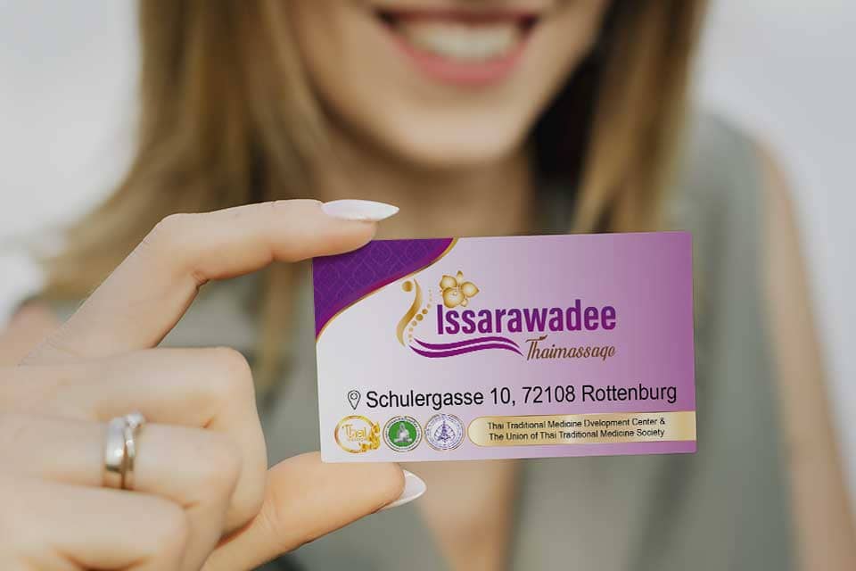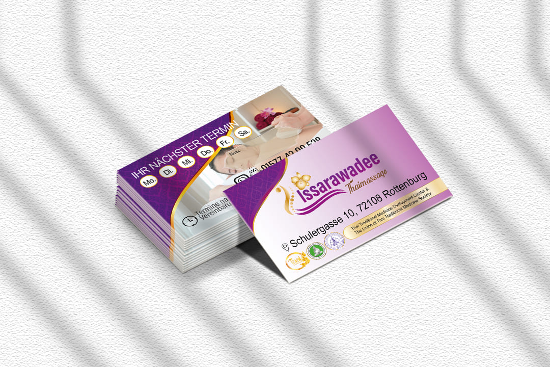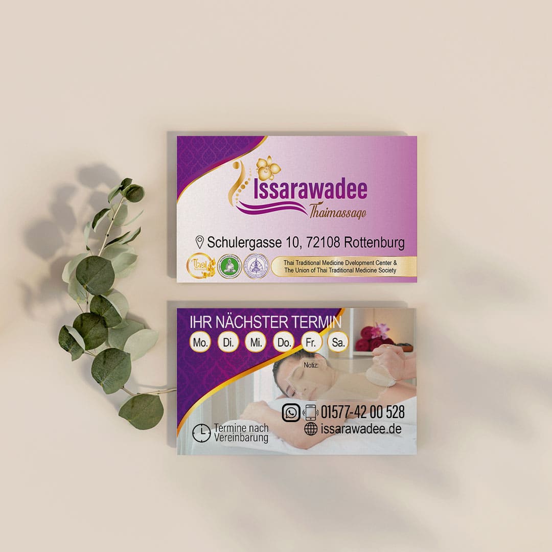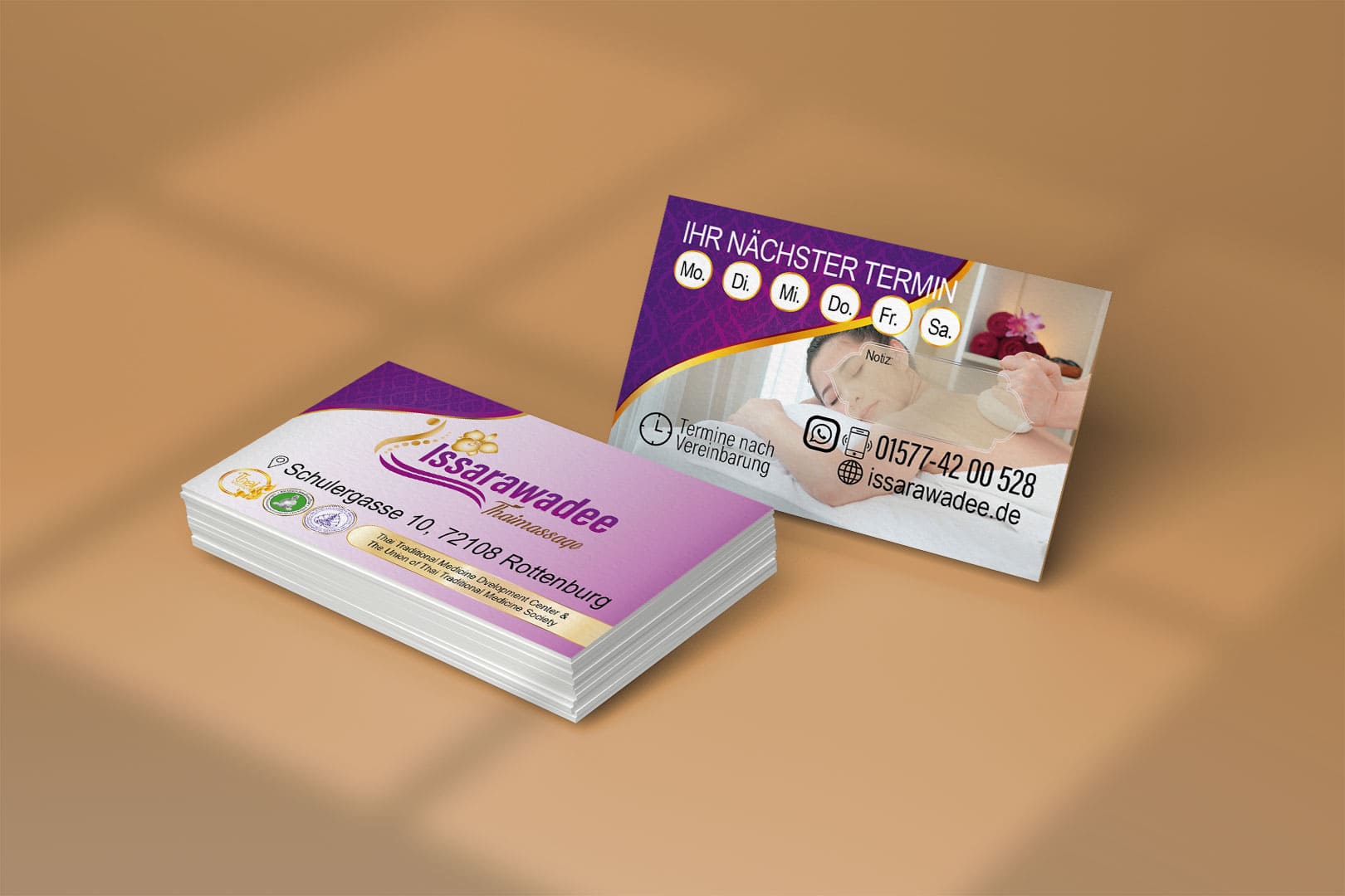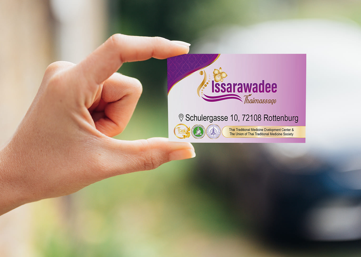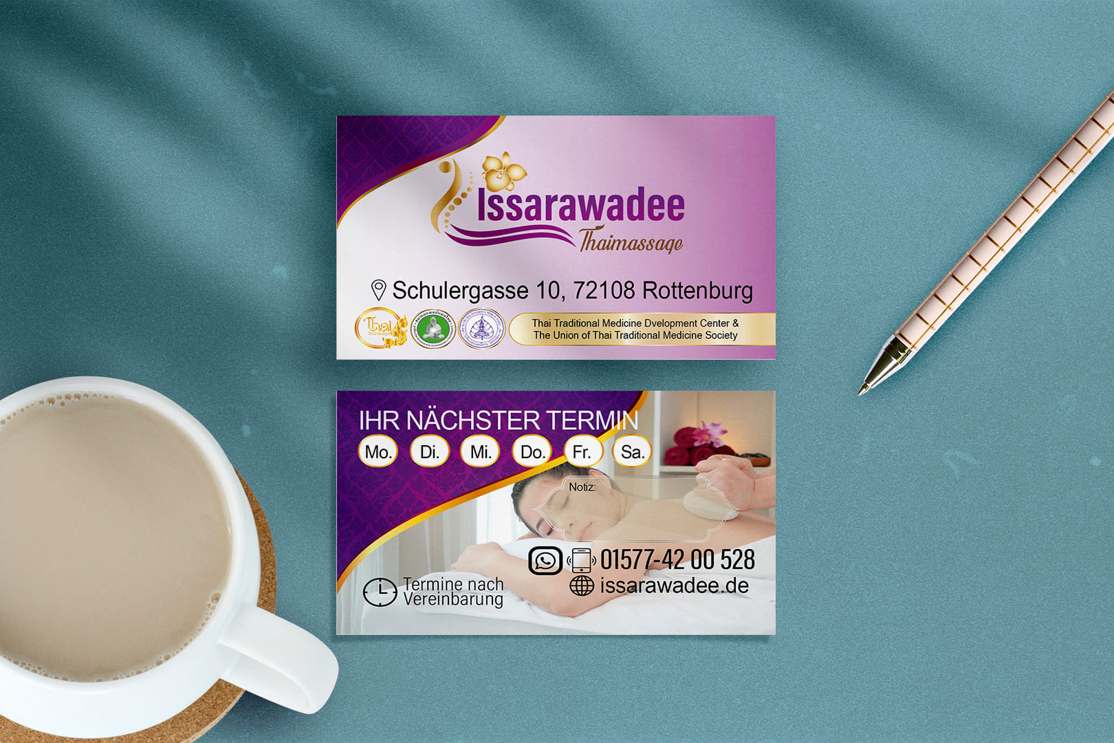 Wir von Thai-Webmaster DE sind Experten in Grafik- und Mediendesign und bieten maßgeschneiderte Visitenkarten für Thai-Massagenpraxen in Deutschland an. Unser kreatives Team hat bereits beeindruckende Designs für die Issarawadee Thai-Massagenpraxis in Rottenburg erstellt, die Sie auf unserer Webseite bewundern können.