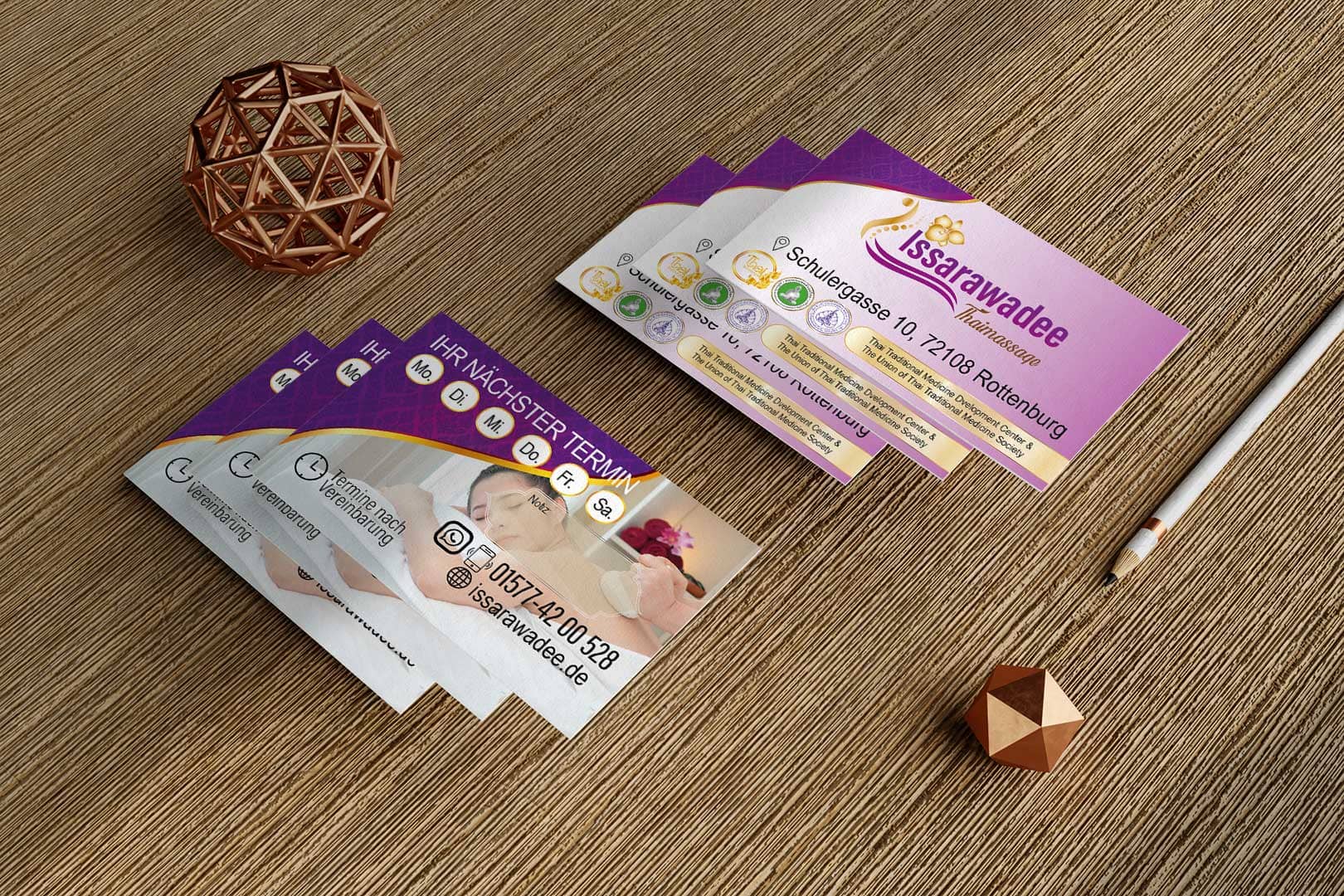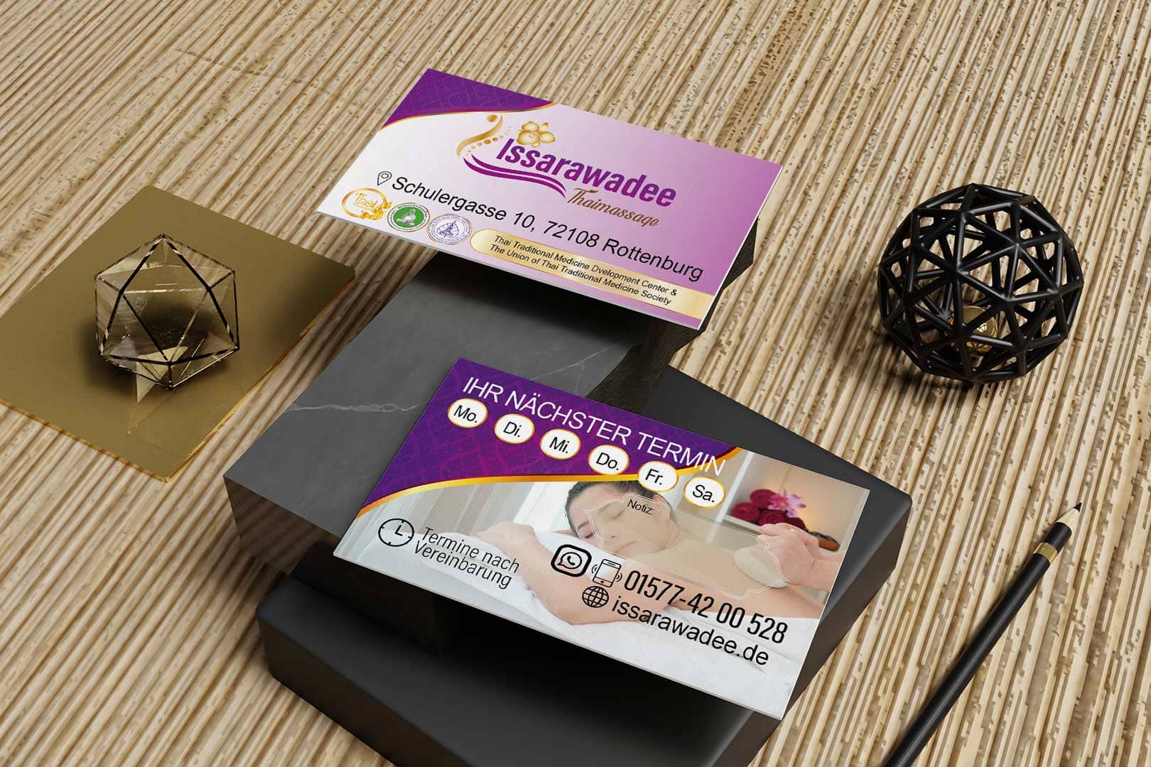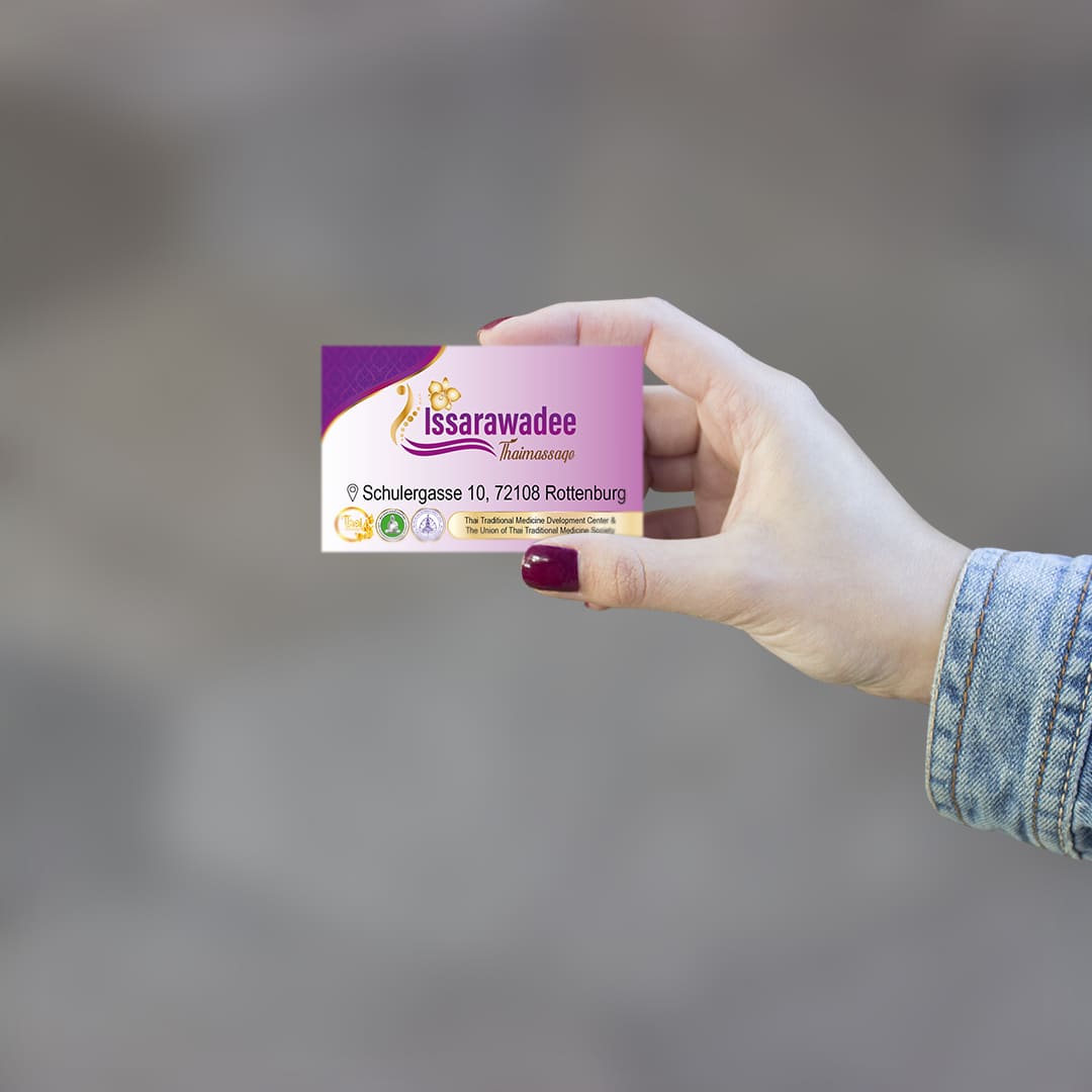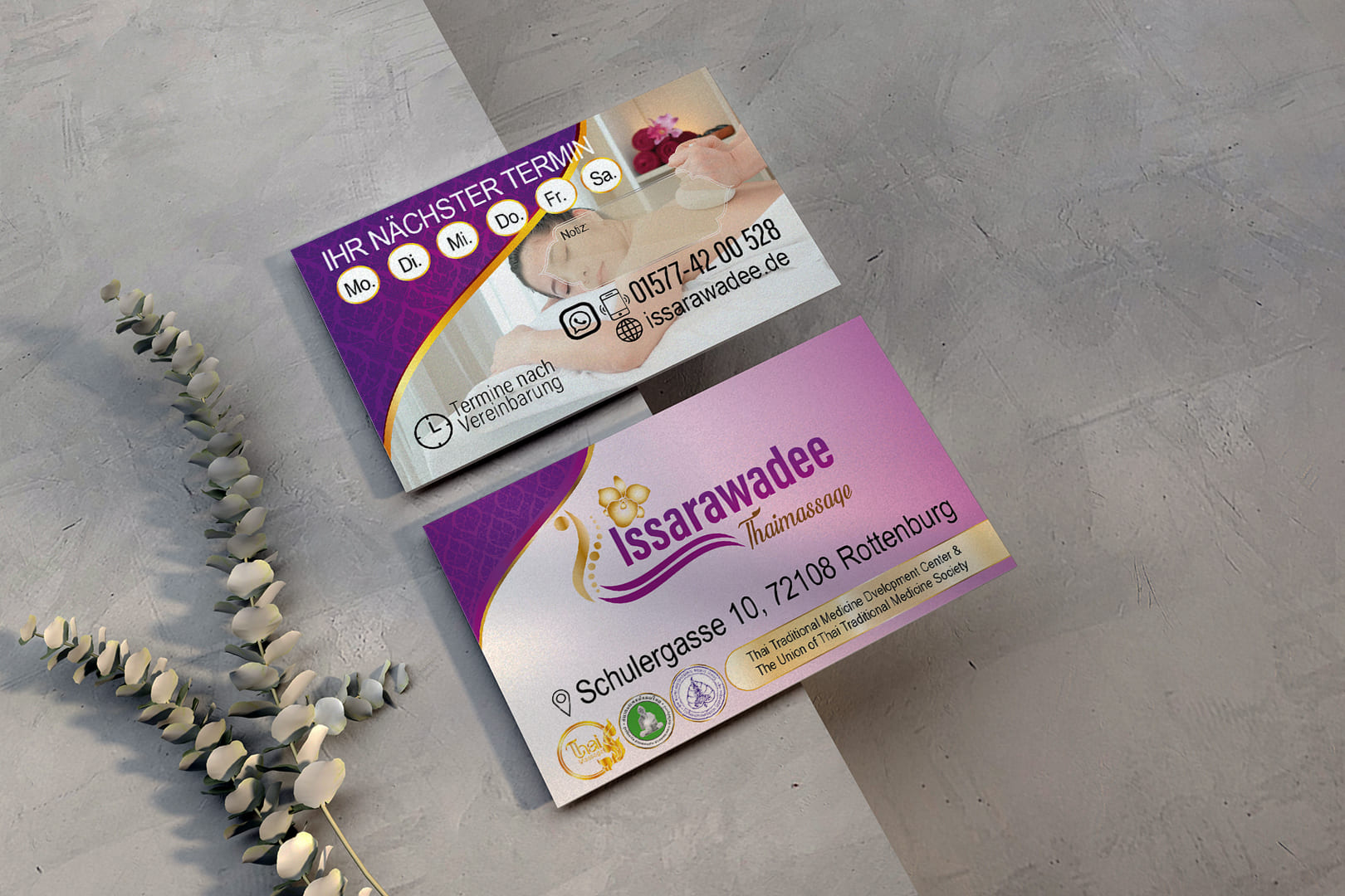 Wir von Thai-Webmaster DE sind Experten in Grafik- und Mediendesign und bieten maßgeschneiderte Visitenkarten für Thai-Massagenpraxen in Deutschland an. Unser kreatives Team hat bereits beeindruckende Designs für die Issarawadee Thai-Massagenpraxis in Rottenburg erstellt, die Sie auf unserer Webseite bewundern können.
