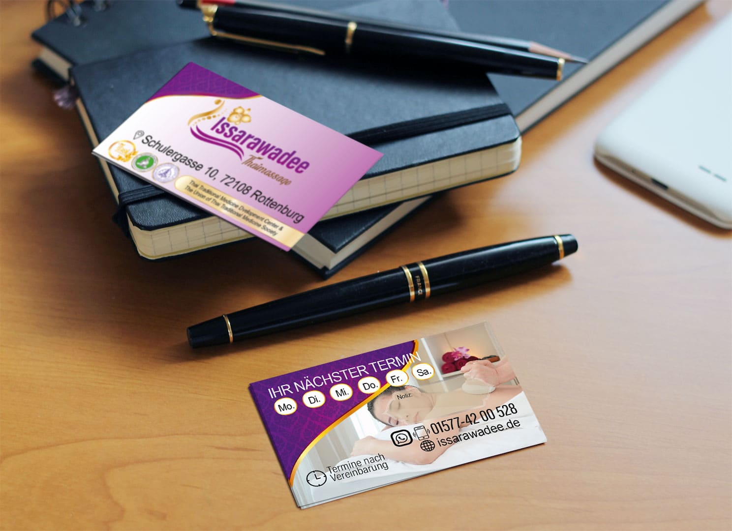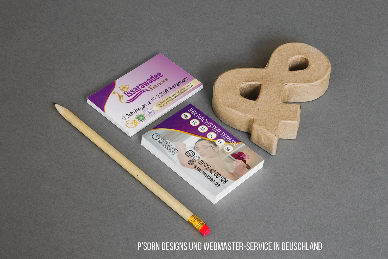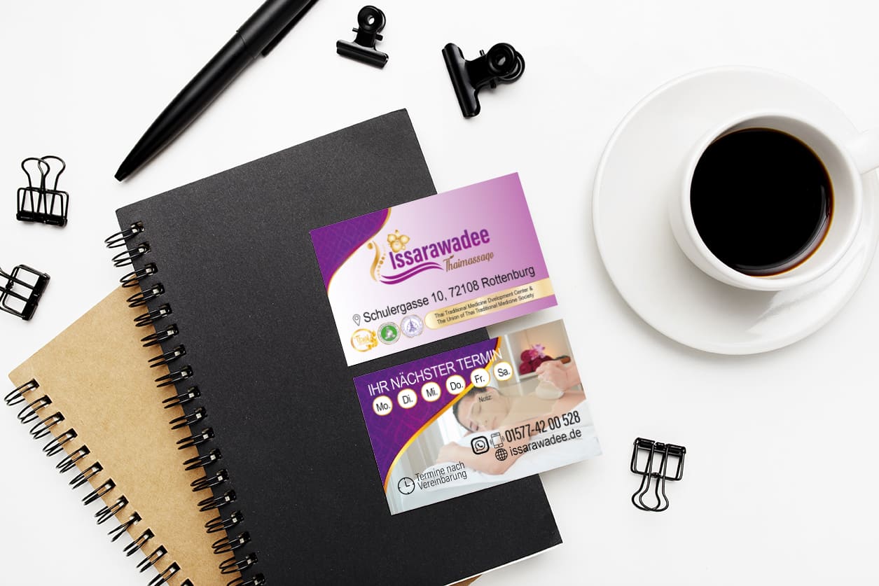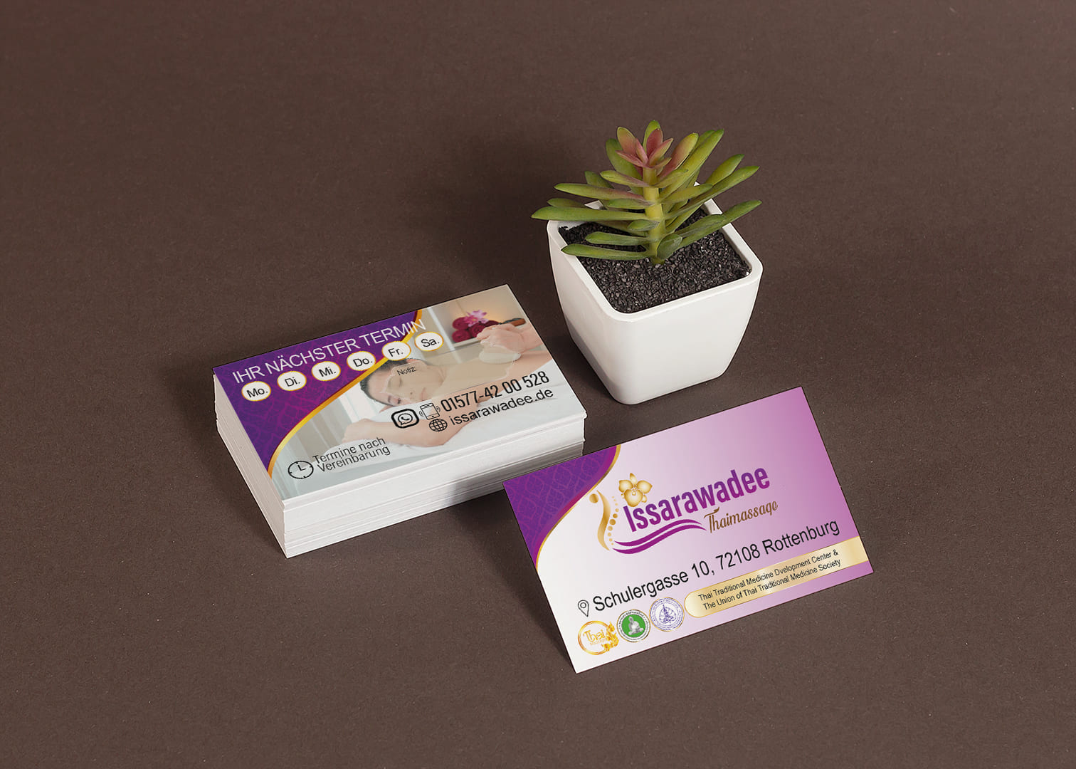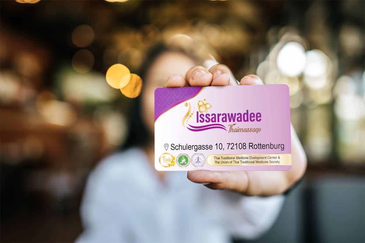 Wir von Thai-Webmaster DE sind Experten in Grafik- und Mediendesign und bieten maßgeschneiderte Visitenkarten für Thai-Massagenpraxen in Deutschland an. Unser kreatives Team hat bereits beeindruckende Designs für die Issarawadee Thai-Massagenpraxis in Rottenburg erstellt, die Sie auf unserer Webseite bewundern können.