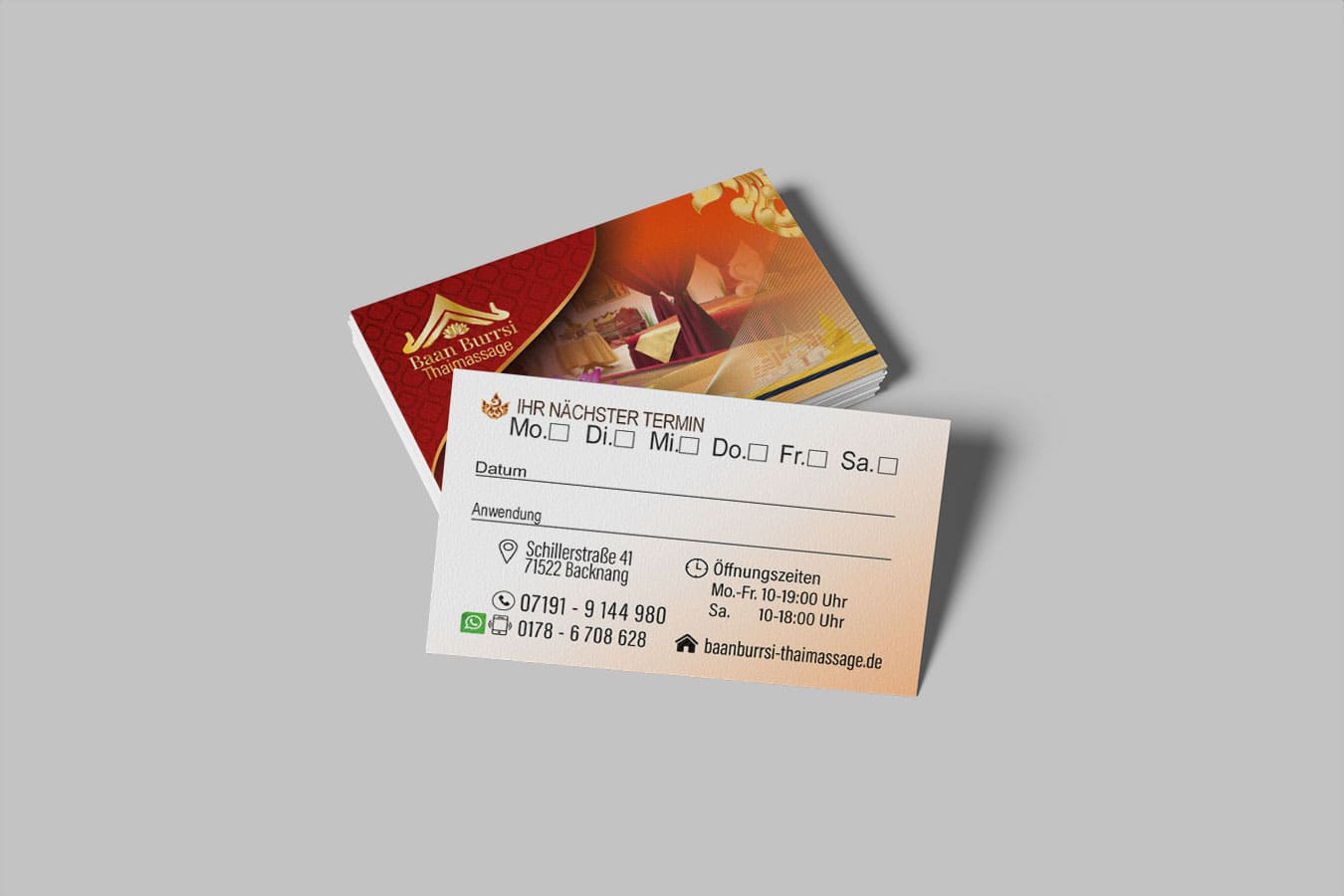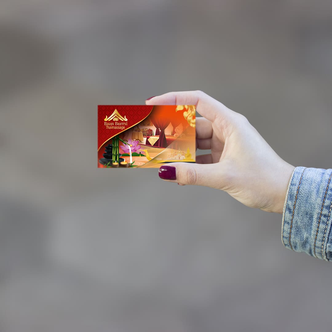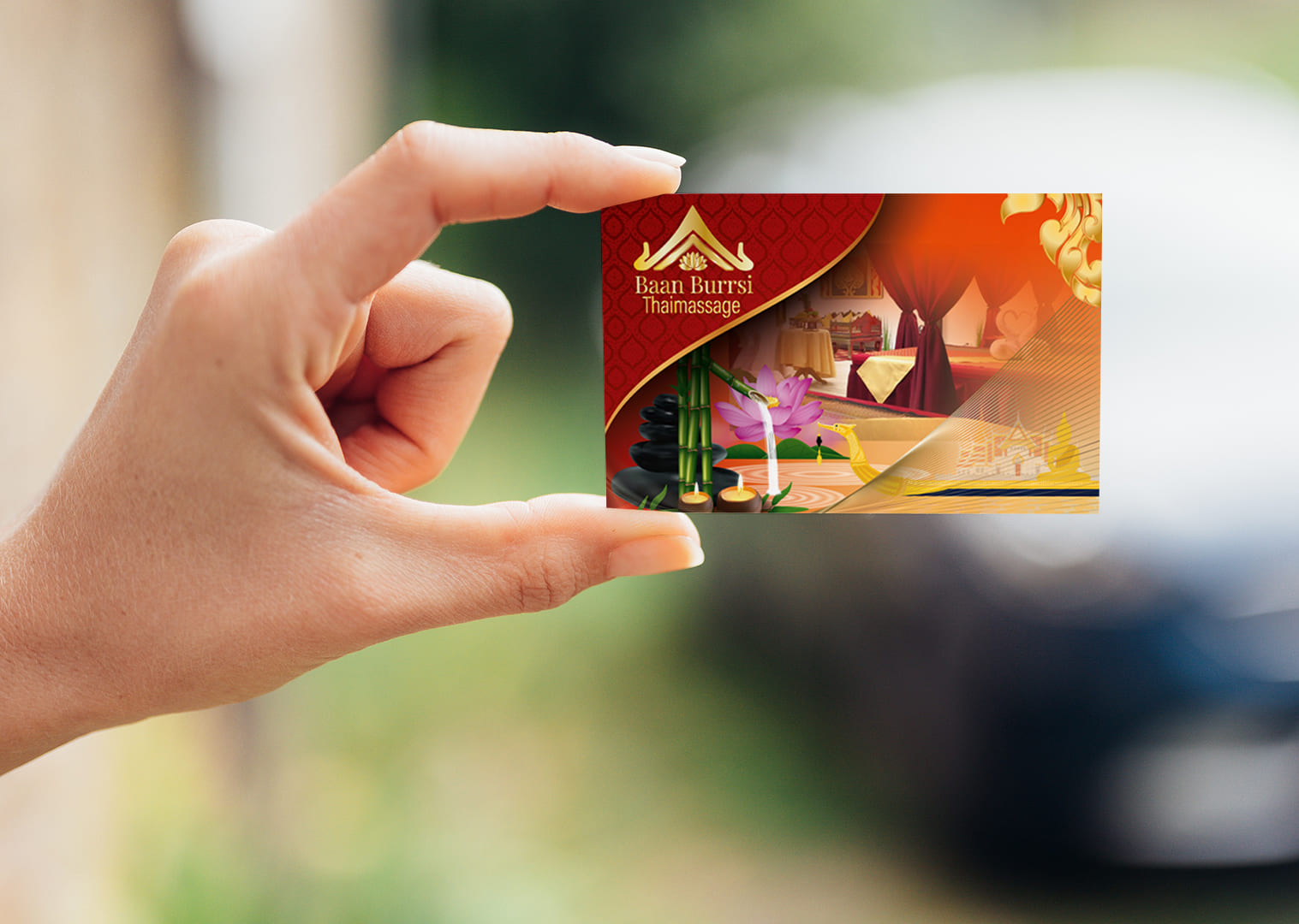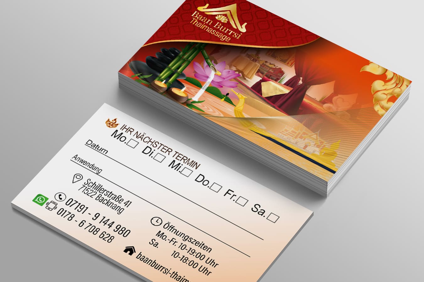 Designs Visitenkarte Baan Burrsi Thai-Massage Mit unserer kreativen Expertise entsteht eine Visitenkarte für Ihre Thai-Massage, die sich von der Masse abhebt und einen bleibenden Eindruck hinterlässt.