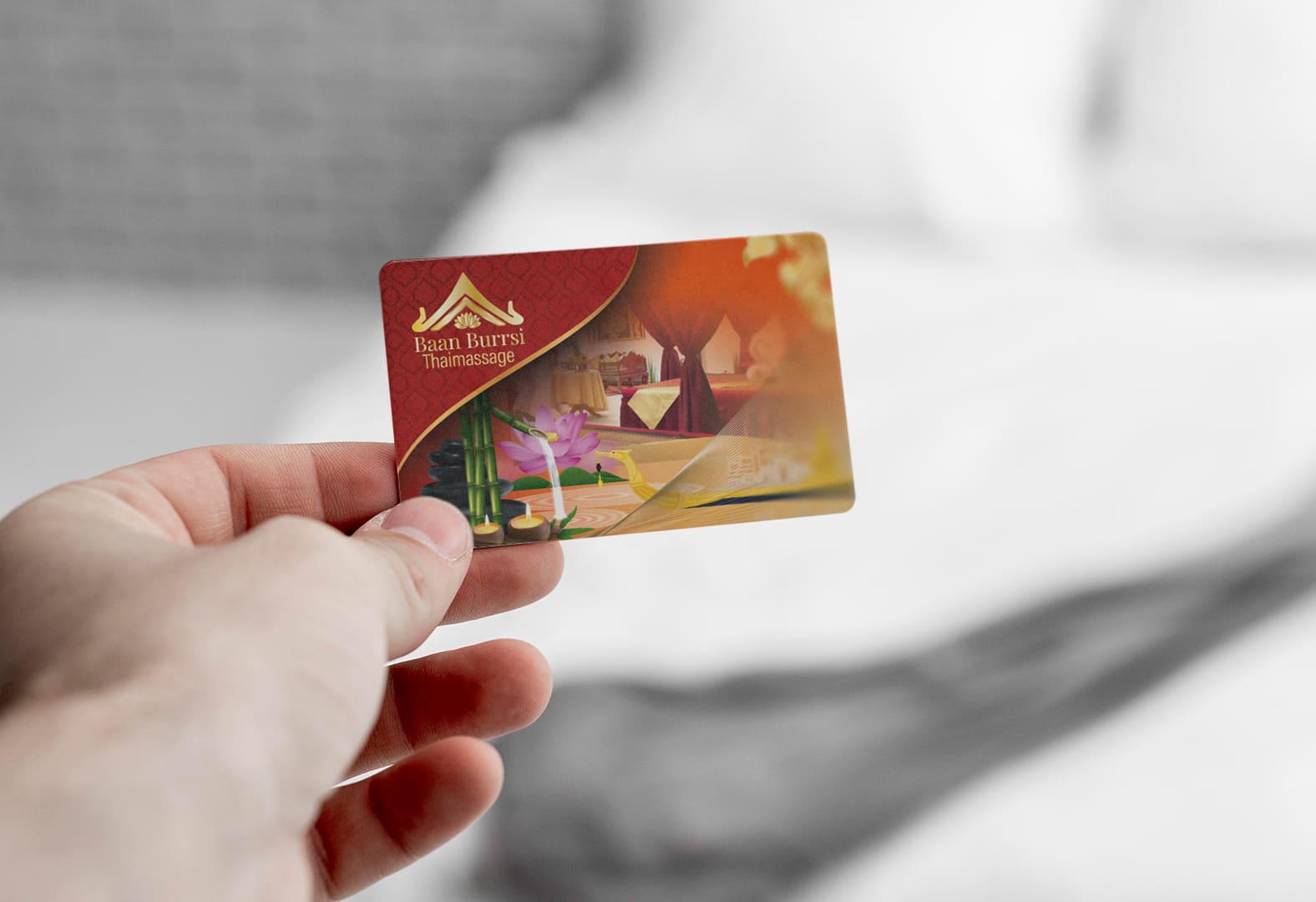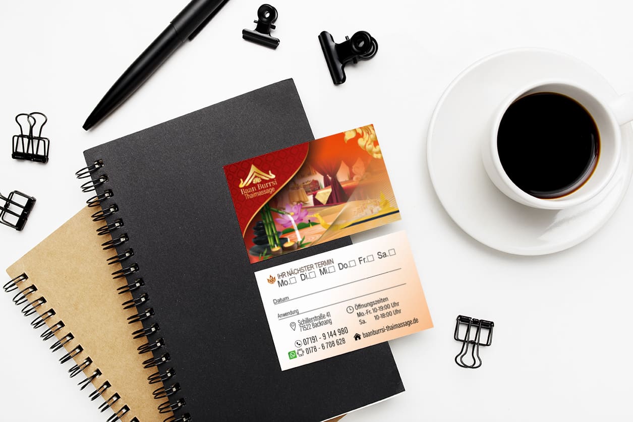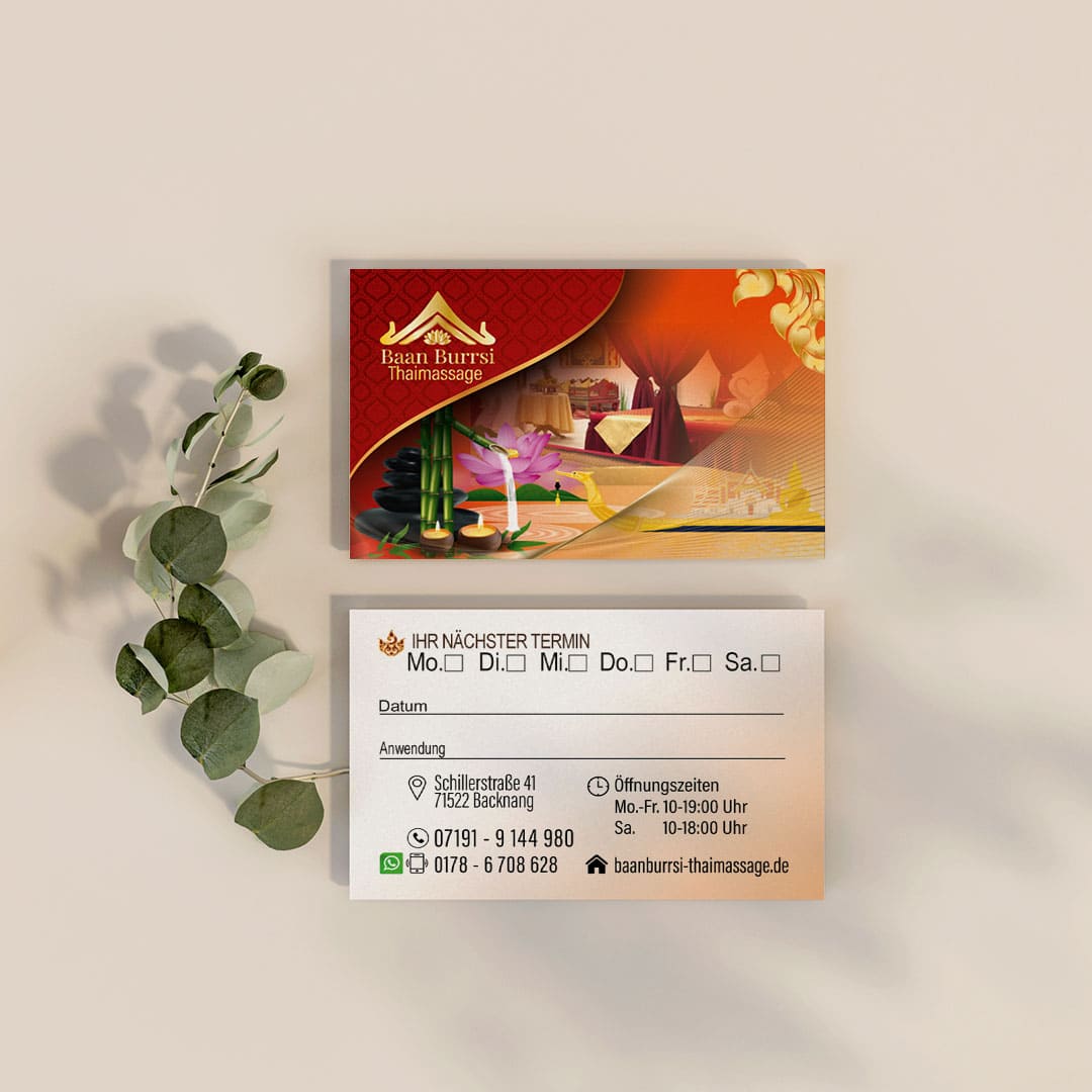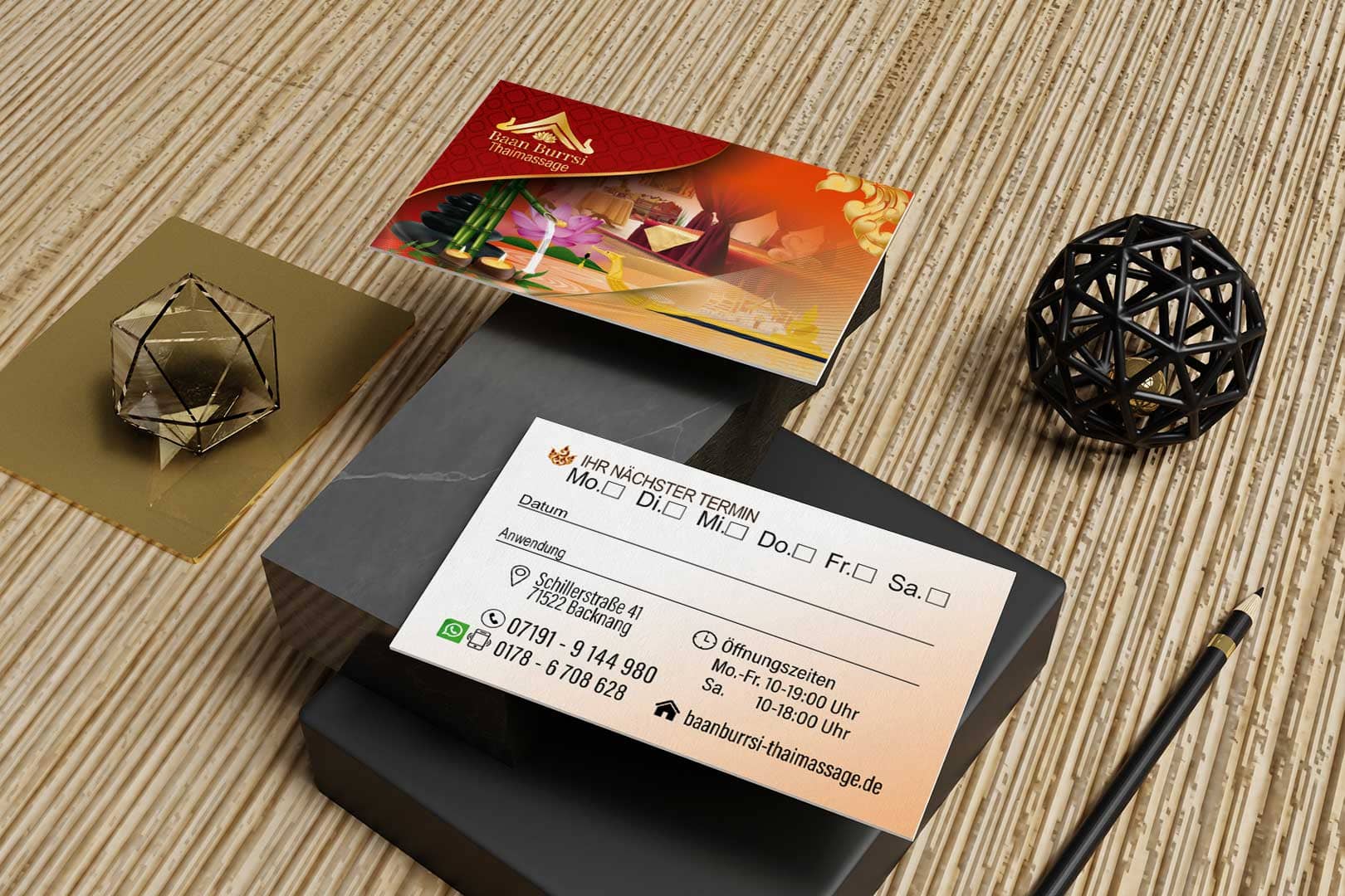 Designs Visitenkarte Baan Burrsi Thai-Massage Mit unserer kreativen Expertise entsteht eine Visitenkarte für Ihre Thai-Massage, die sich von der Masse abhebt und einen bleibenden Eindruck hinterlässt.
