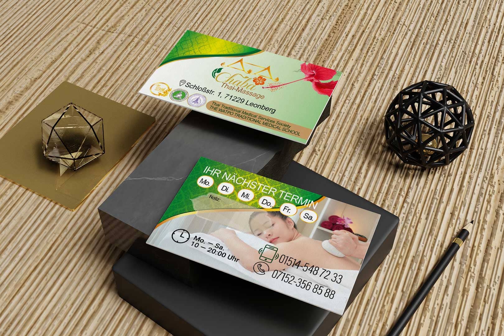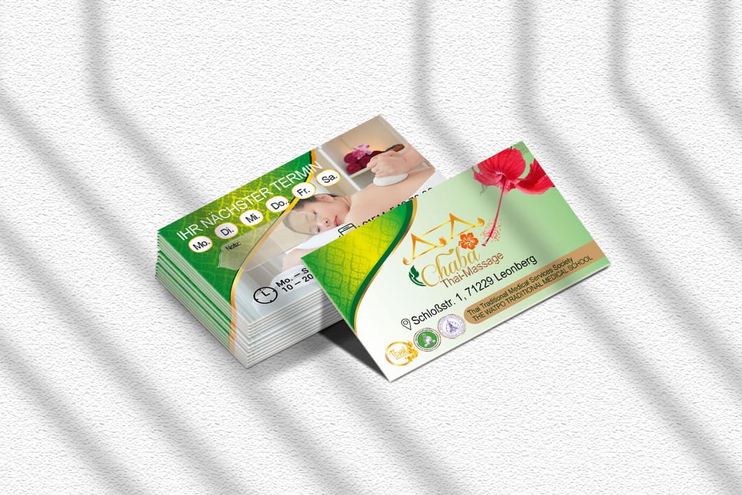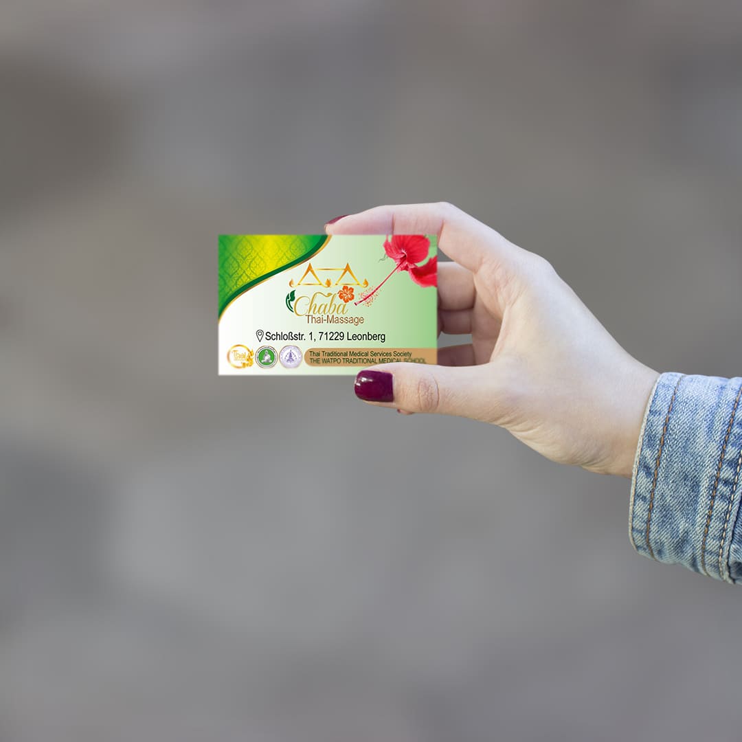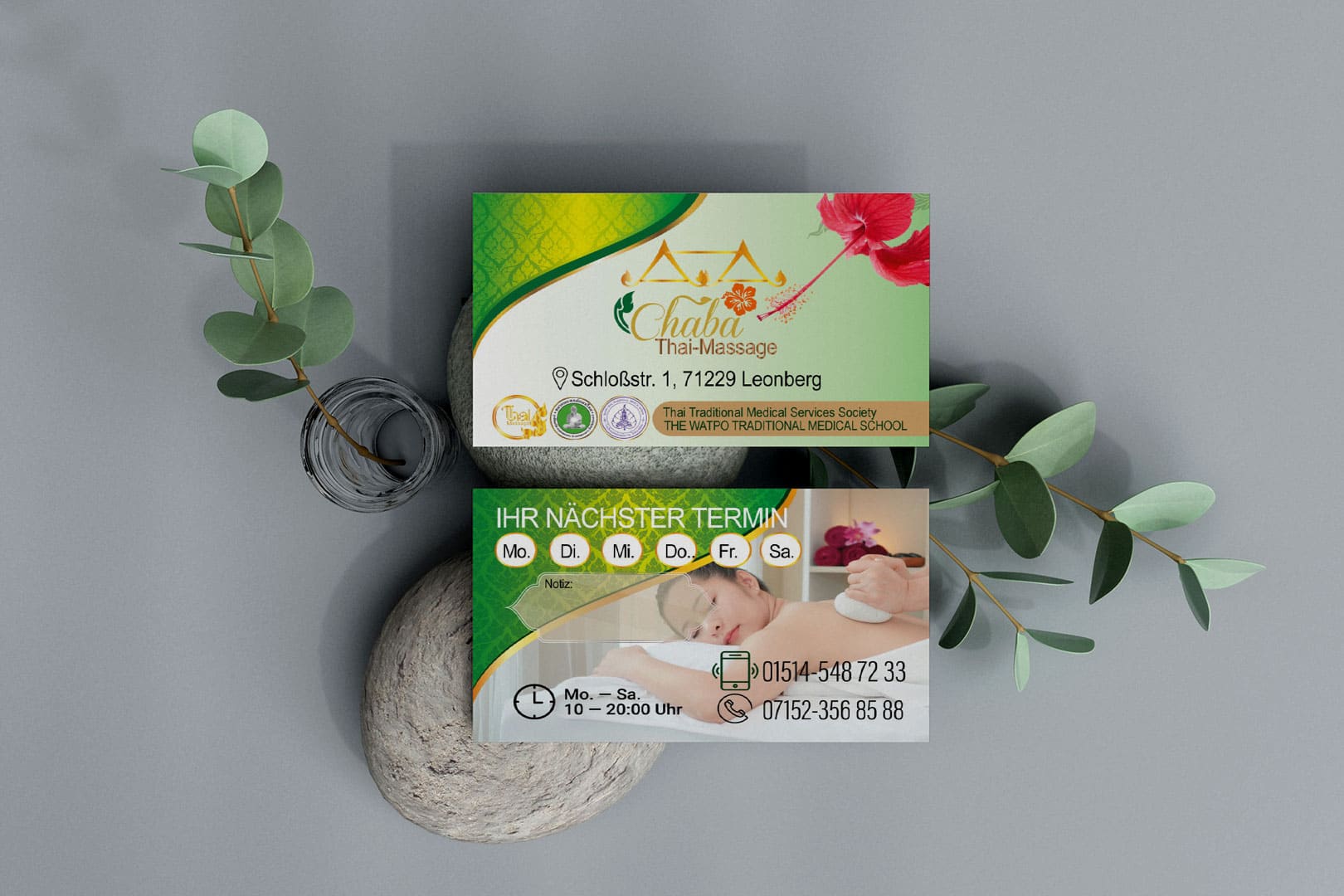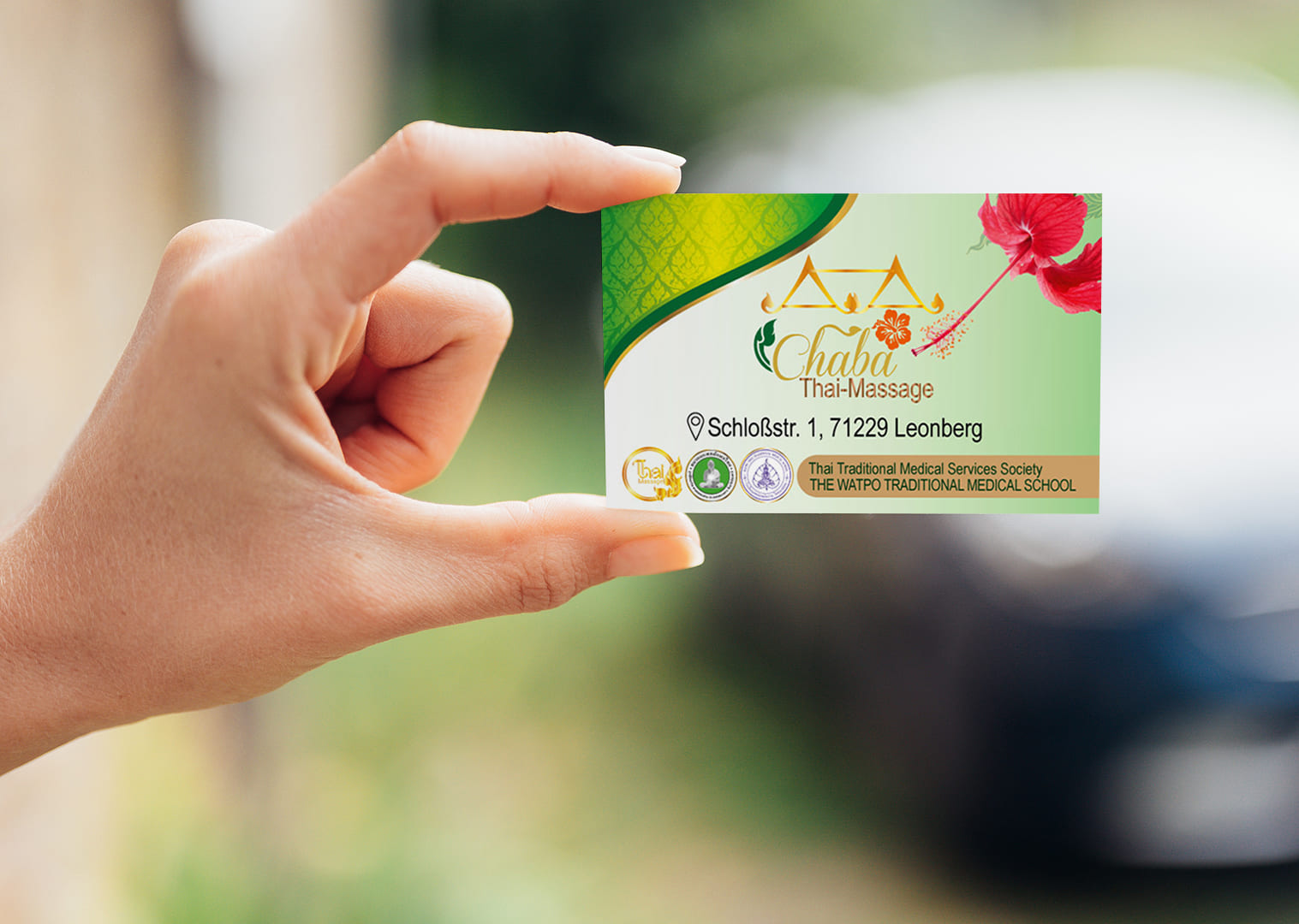 Entdecken Sie das innovative Visitenkarten-Design für die Chaba Thai-Massage in Leonberg bei Thai-Webmaster DE. Lassen Sie sich von unserem talentierten Team inspirieren und erhalten Sie eine individuelle Visitenkarte für Ihr Massagestudio!