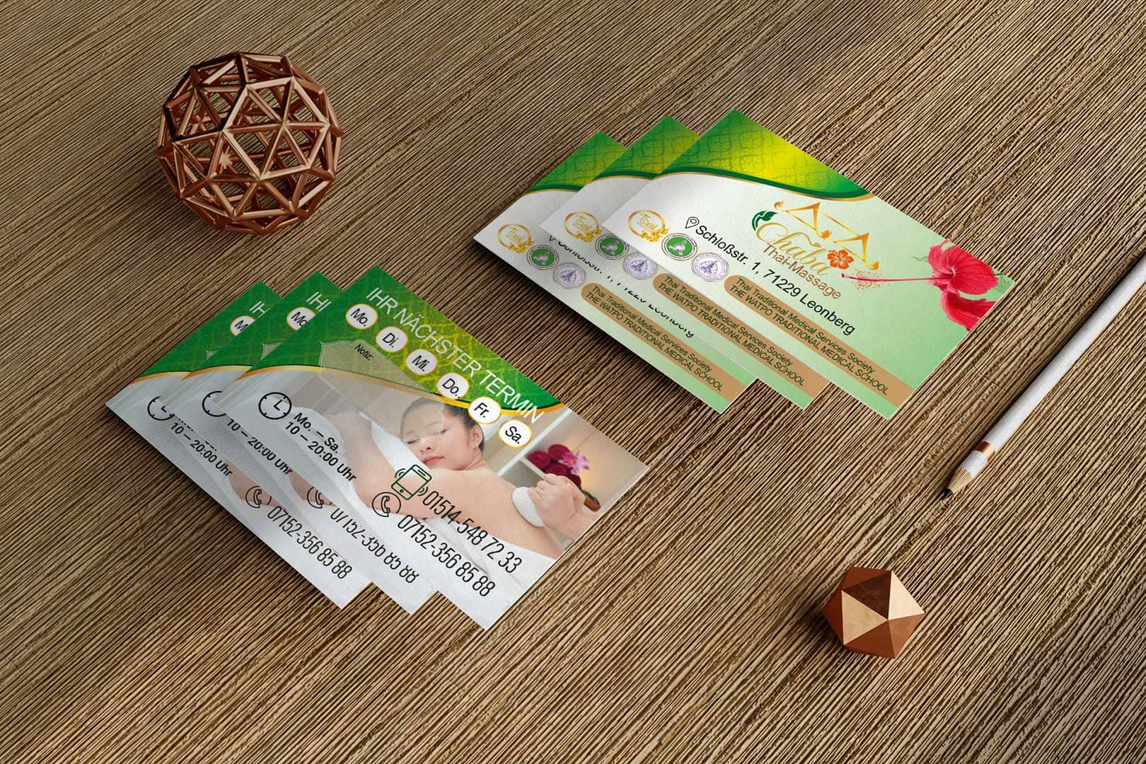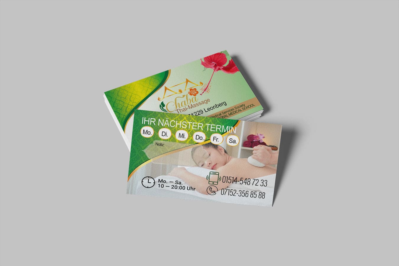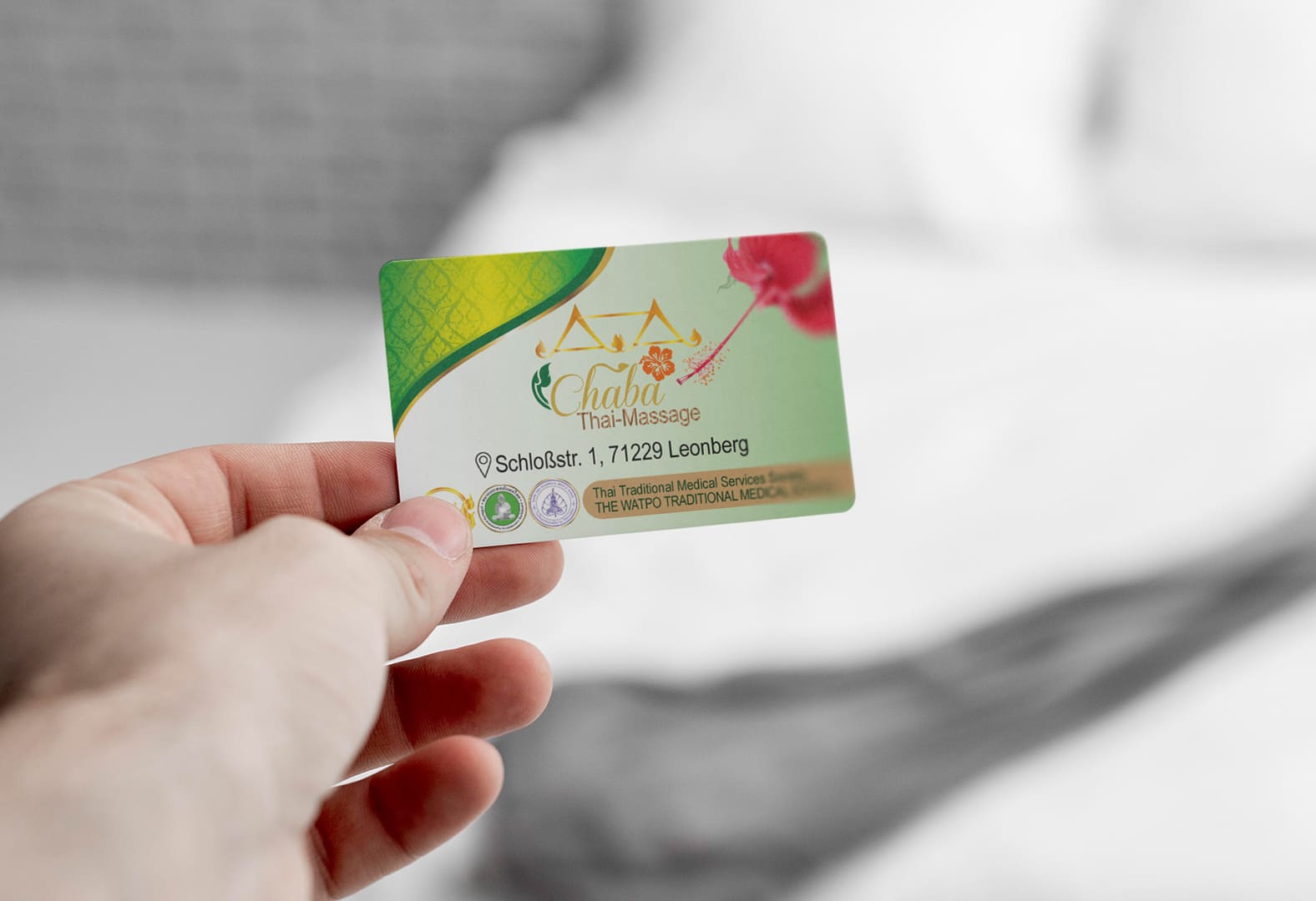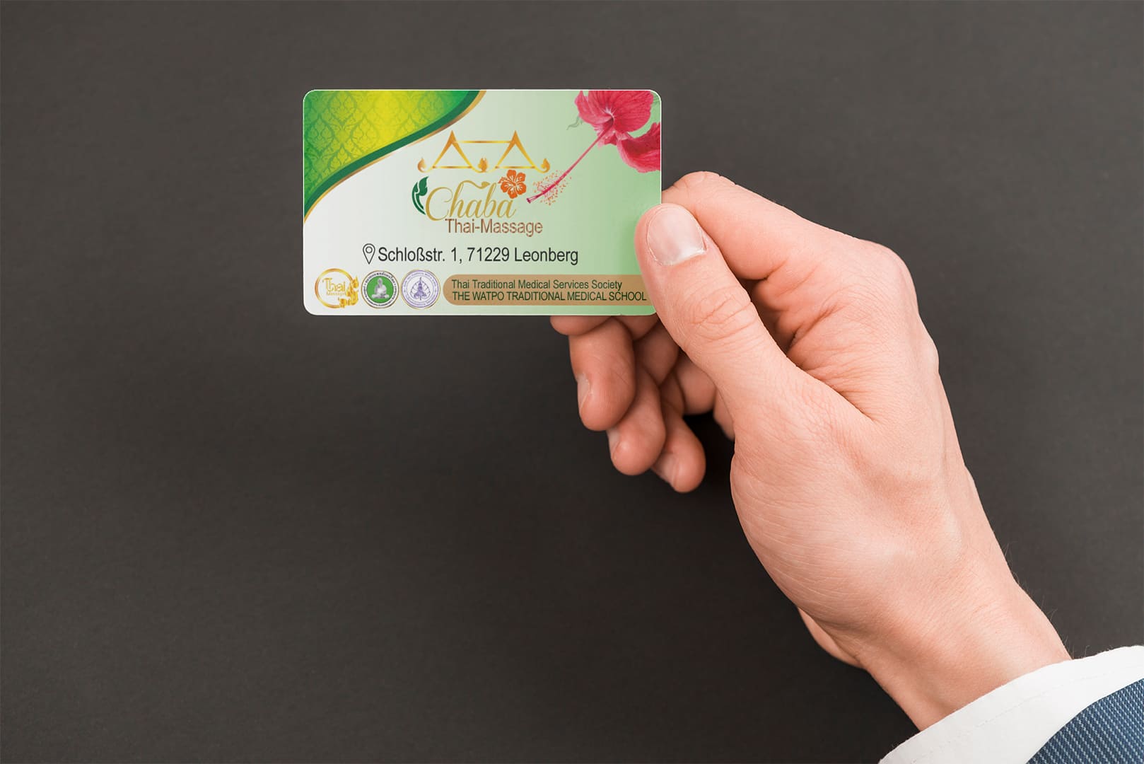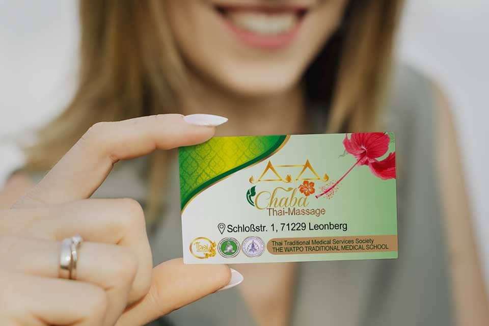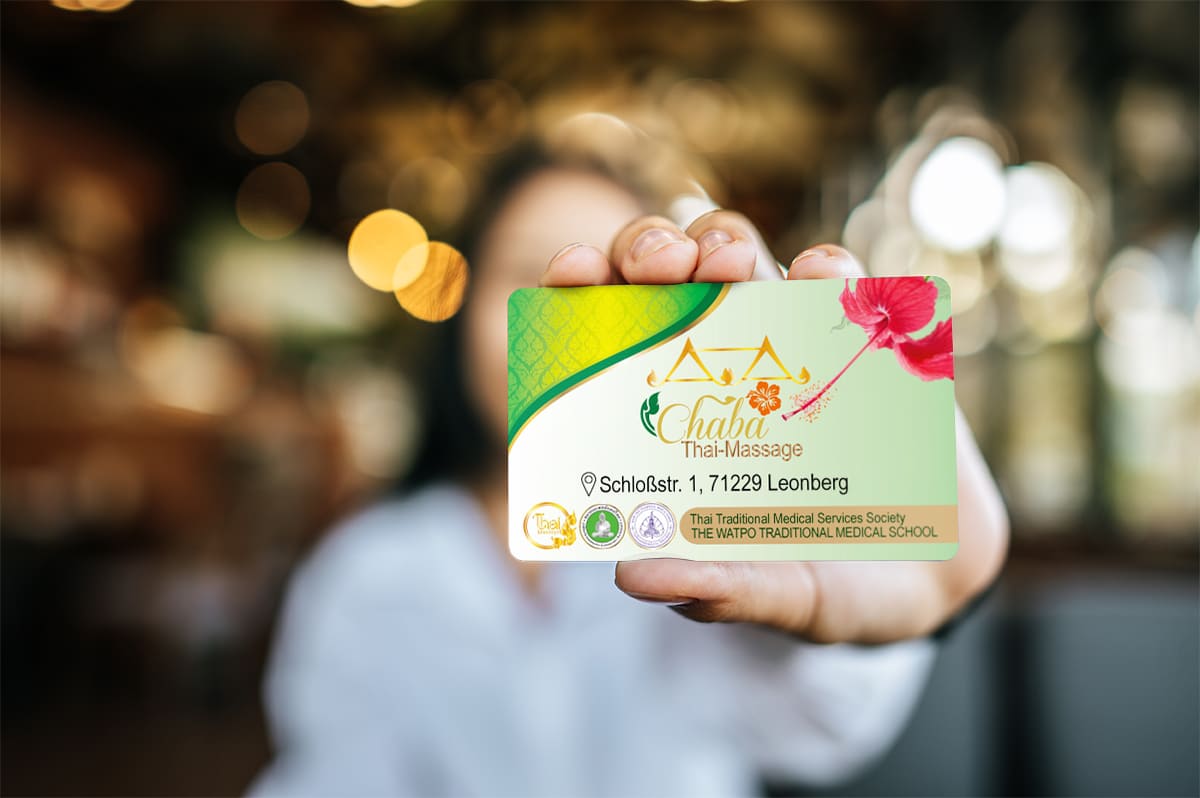 Entdecken Sie das innovative Visitenkarten-Design für die Chaba Thai-Massage in Leonberg bei Thai-Webmaster DE. Lassen Sie sich von unserem talentierten Team inspirieren und erhalten Sie eine individuelle Visitenkarte für Ihr Massagestudio!