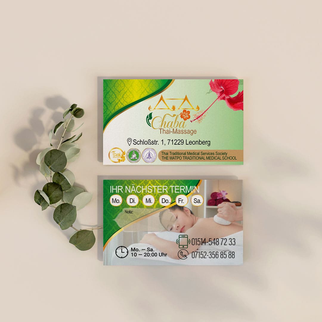 Ihrer Anlaufstelle für kreatives Grafikdesign, speziell für die Branche der thailändischen Massagen. Wir stellen Ihnen unser neuestes Referenzdesign für die Visitenkarte der Chaba Thai-Massage in Leonberg vor. Unser Ziel ist es, unsere Besucher mit inspirierenden und innovativen Designs zu begeistern, die die Kreativität und Professionalität unseres talentierten Teams widerspiegeln.