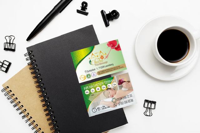 Entdecken Sie das innovative Visitenkarten-Design für die Chaba Thai-Massage in Leonberg bei Thai-Webmaster DE. Lassen Sie sich von unserem talentierten Team inspirieren und erhalten Sie eine individuelle Visitenkarte für Ihr Massagestudio!