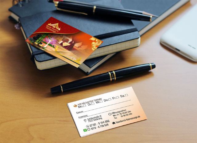 Entdecken Sie kreative Visitenkarten-Designs für Ihr Massagestudio bei Thai-Webmaster DE. Lassen Sie sich inspirieren und erhalten Sie eine individuell gestaltete Visitenkarte, die einen bleibenden Eindruck hinterlässt.