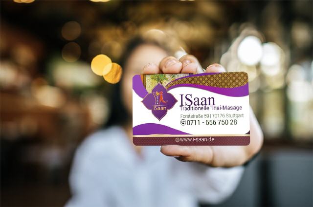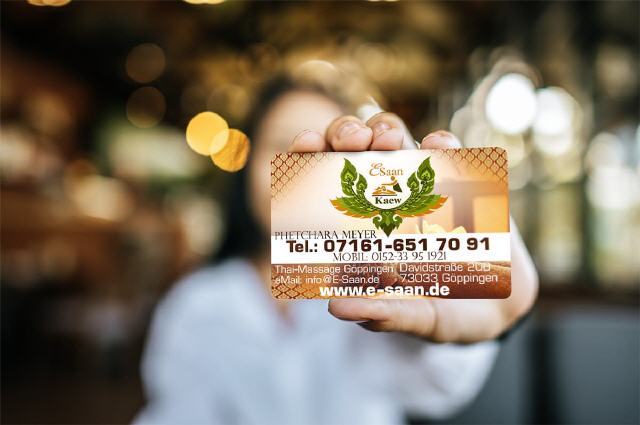 Entdecken Sie hochwertige Visitenkarten für E-Saan Thai-Massage in Göppingen. Thai-Webmaster DE entwirft, druckt und versendet Ihre Visitenkarten in Top-Qualität. Kontaktieren Sie uns für eine kostenlose Beratung!