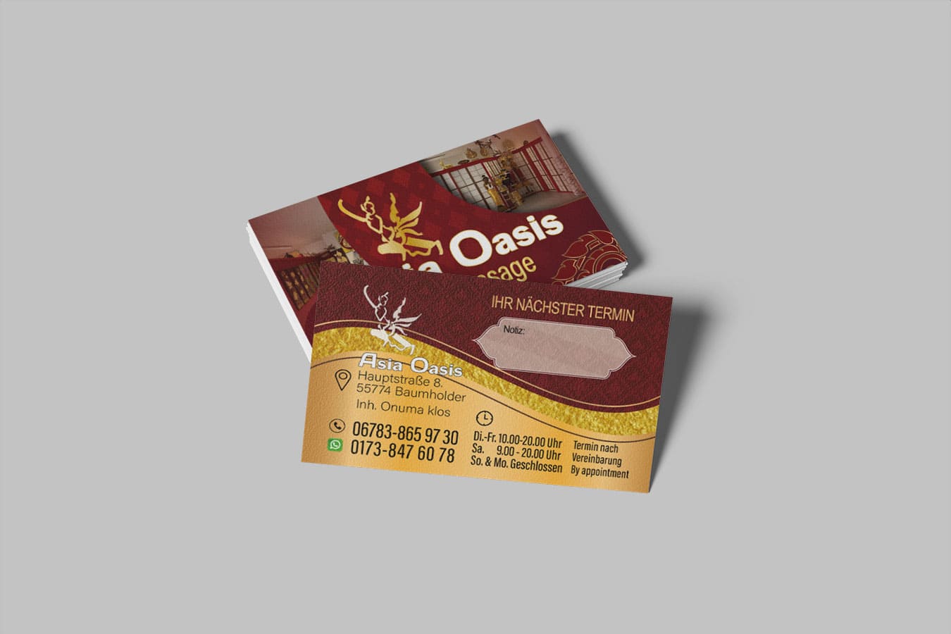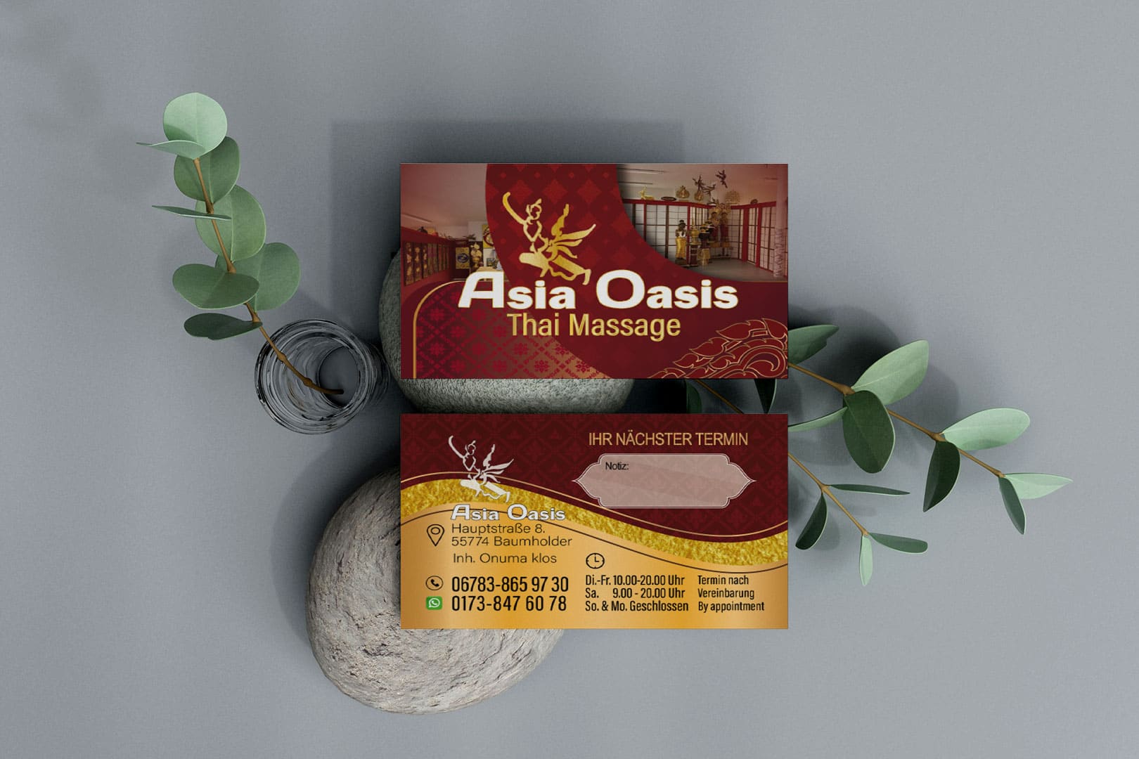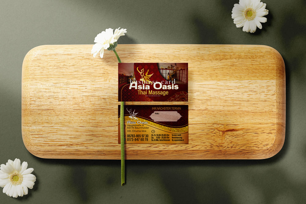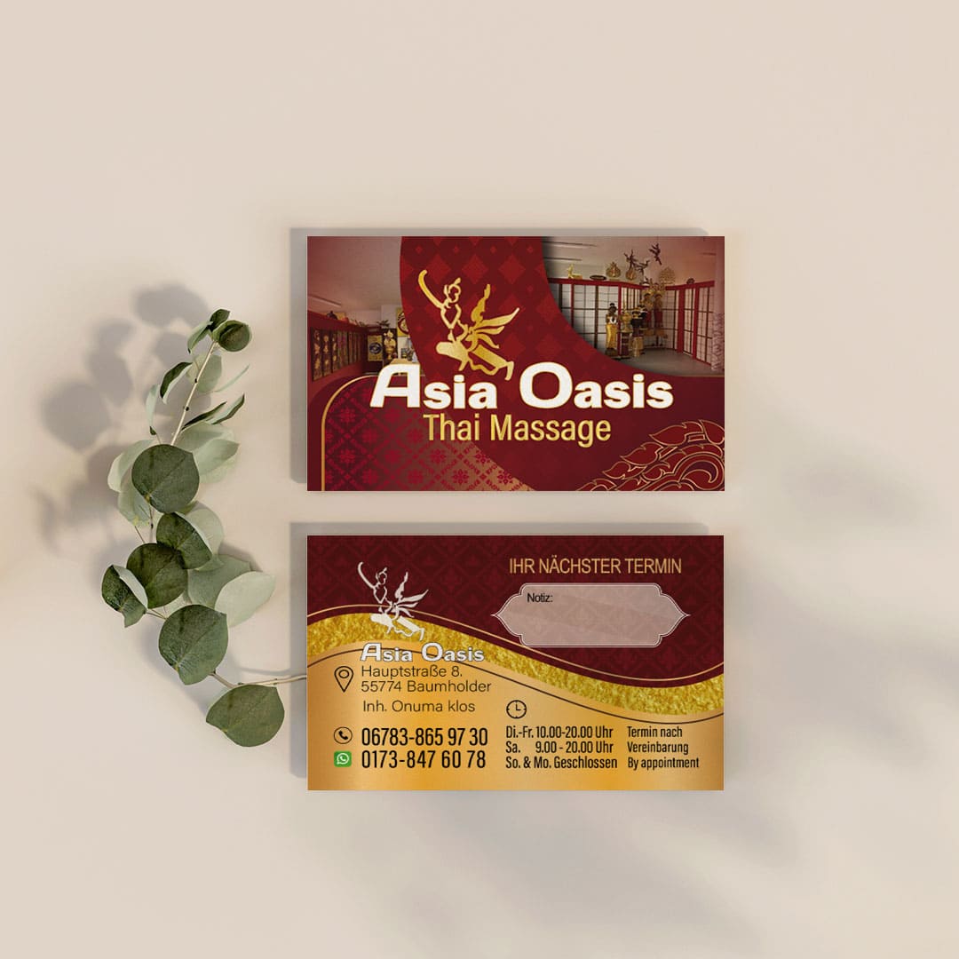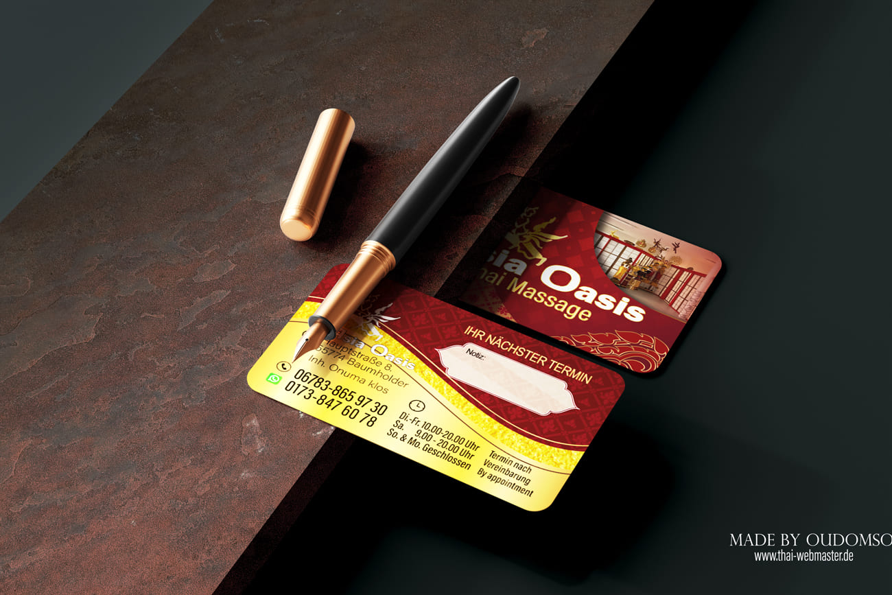 Visitenkarte Asia-Oasis Baumholder-Design Mit unserem Know-how im Thai Mediendesign bringen wir deine Visitenkarte auf das nächste Level - ideal für deine Massage-Praxis in Deutschland.