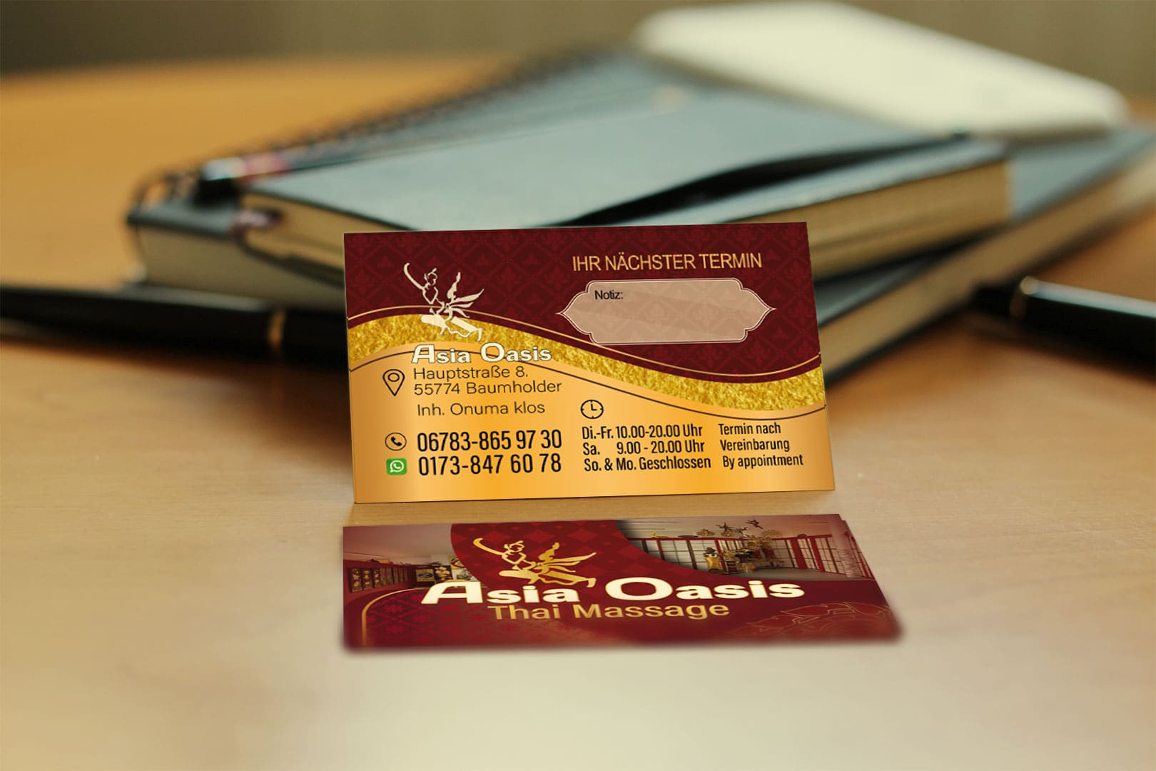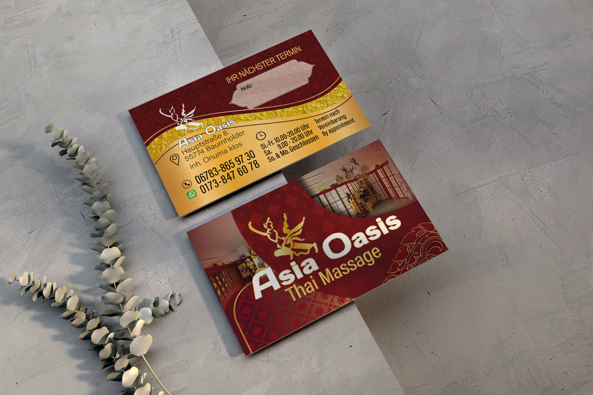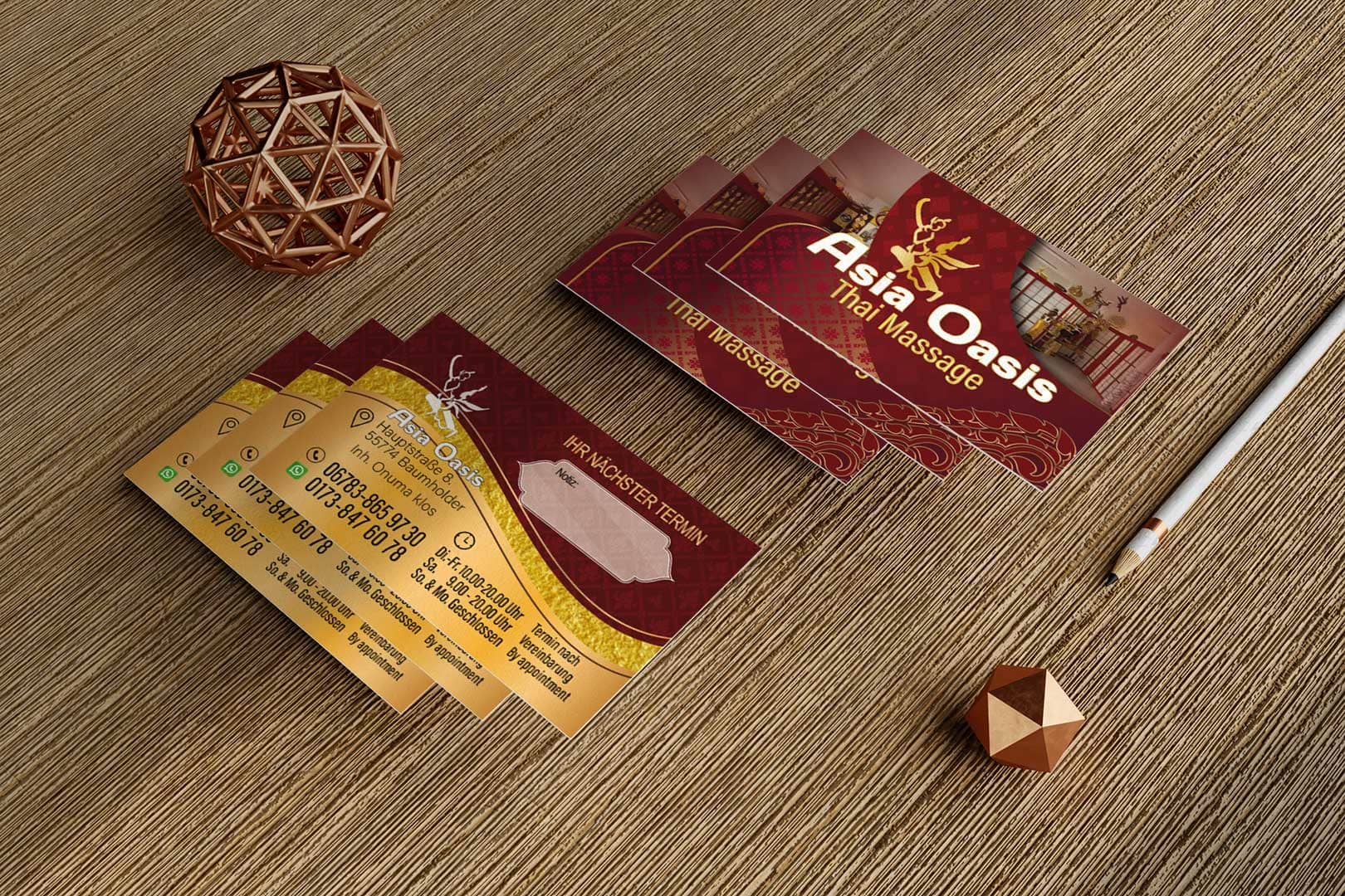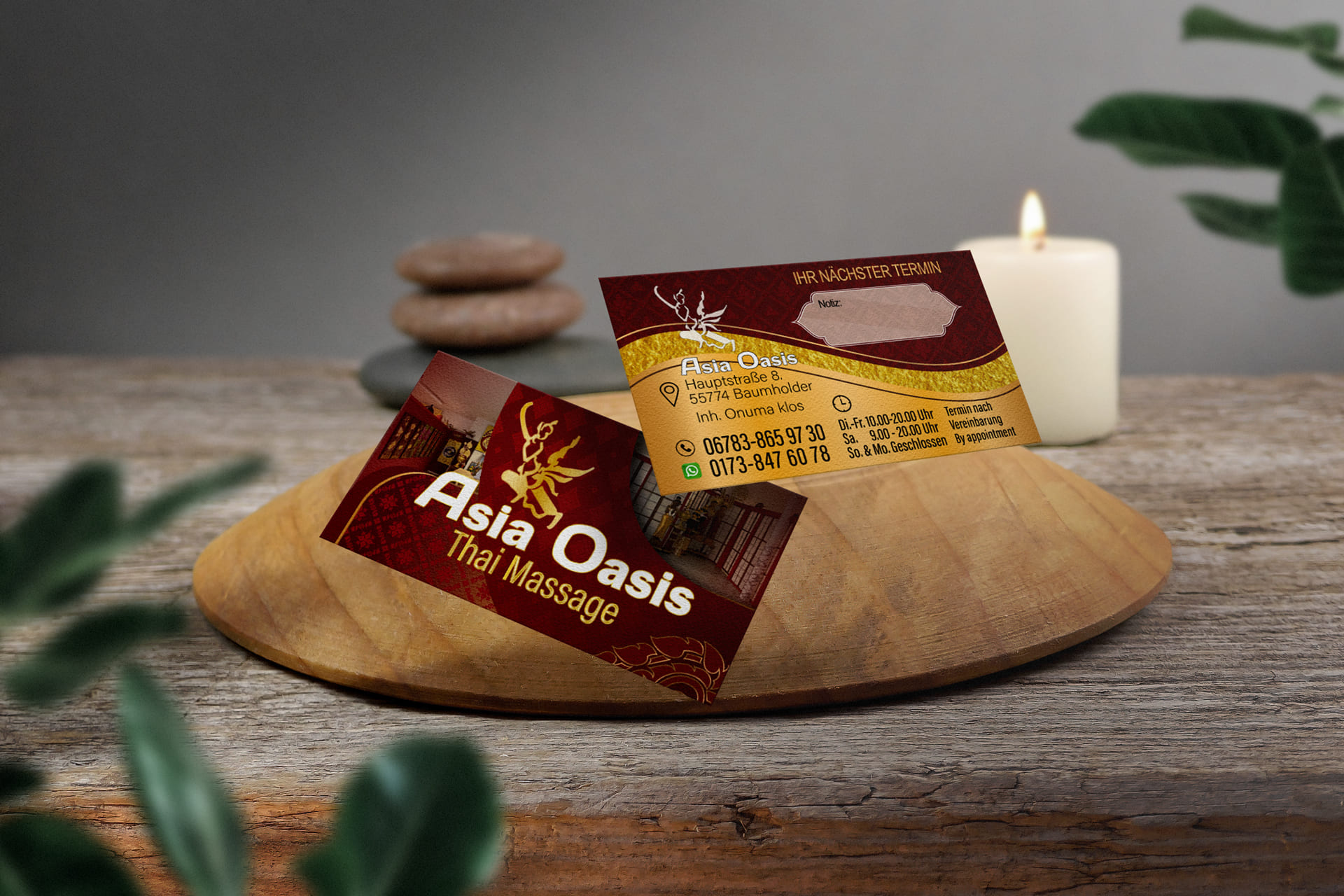 Visitenkarte Asia-Oasis Baumholder-Design Mit unserem Know-how im Thai Mediendesign bringen wir deine Visitenkarte auf das nächste Level - ideal für deine Massage-Praxis in Deutschland.