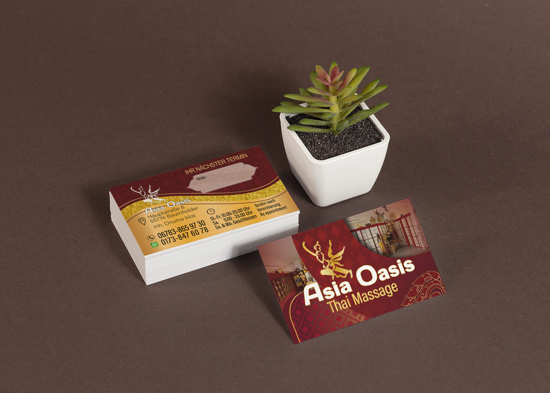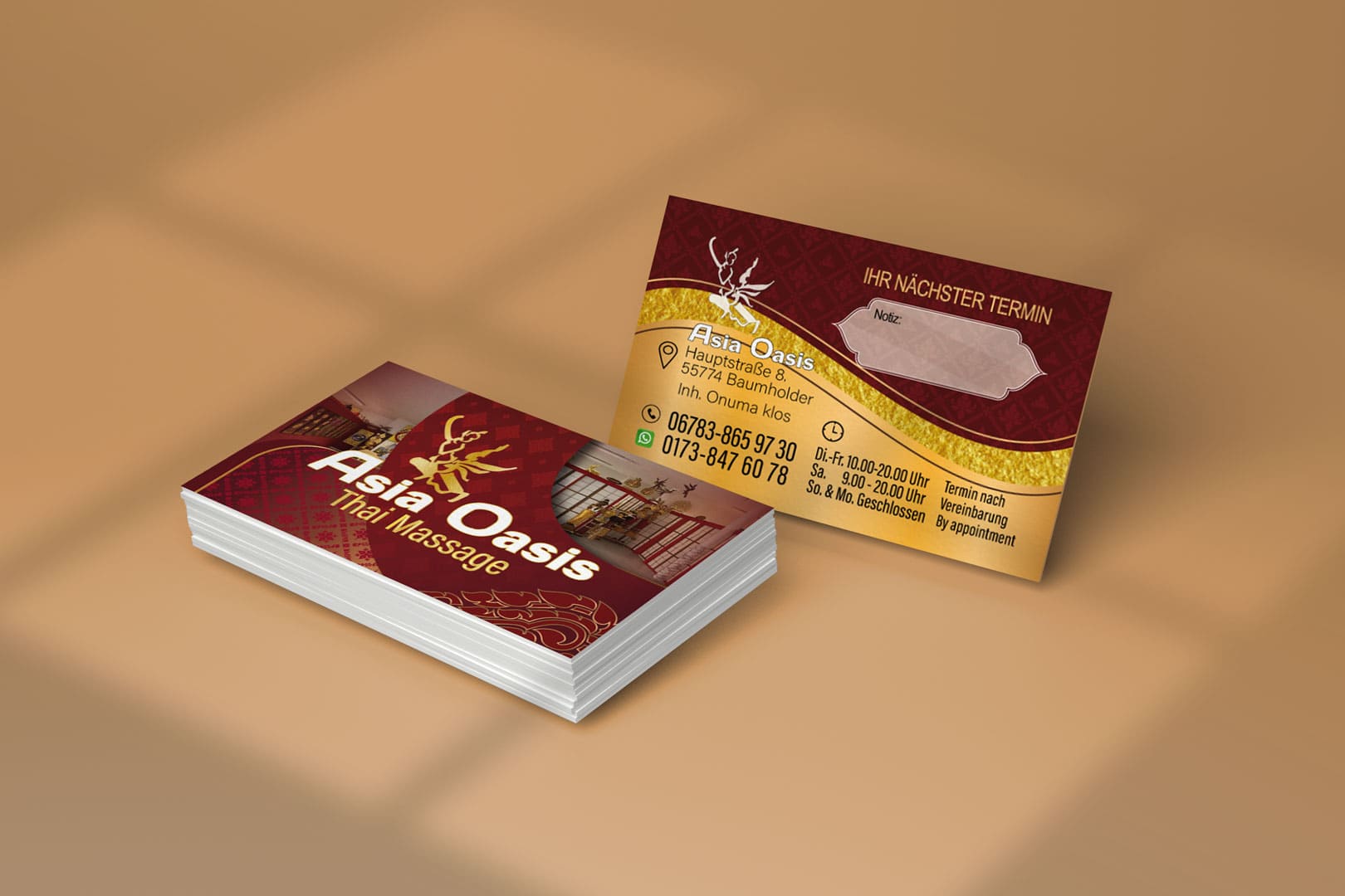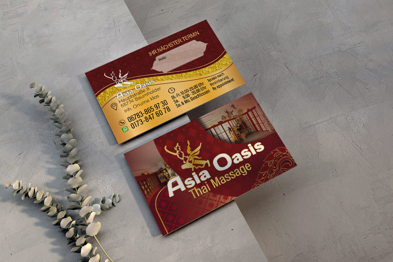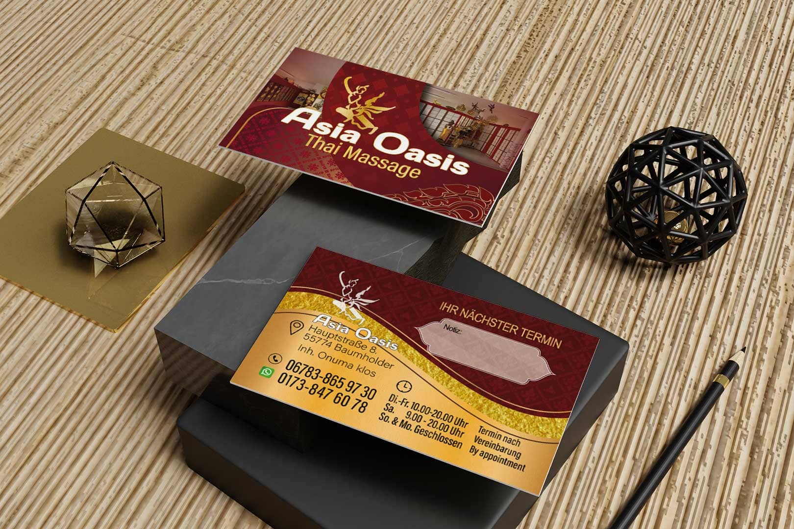 Visitenkarte Asia-Oasis Baumholder-Design Mit unserem Know-how im Thai Mediendesign bringen wir deine Visitenkarte auf das nächste Level - ideal für deine Massage-Praxis in Deutschland.