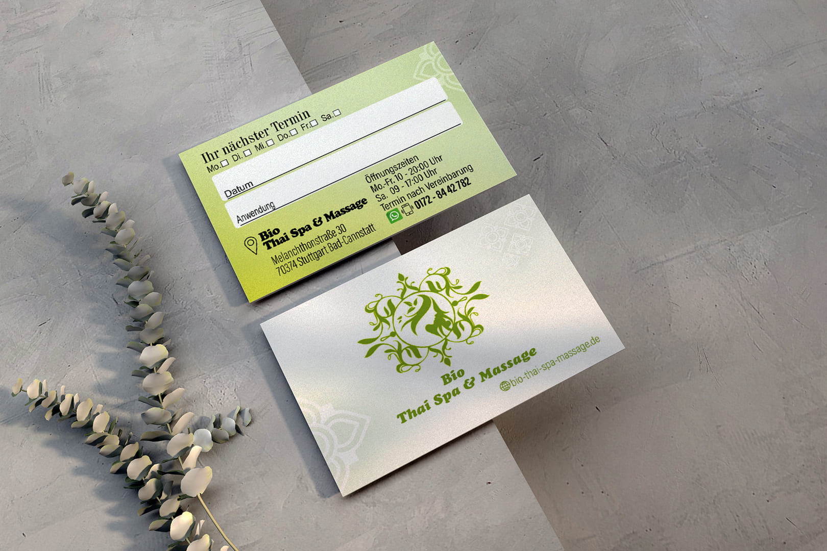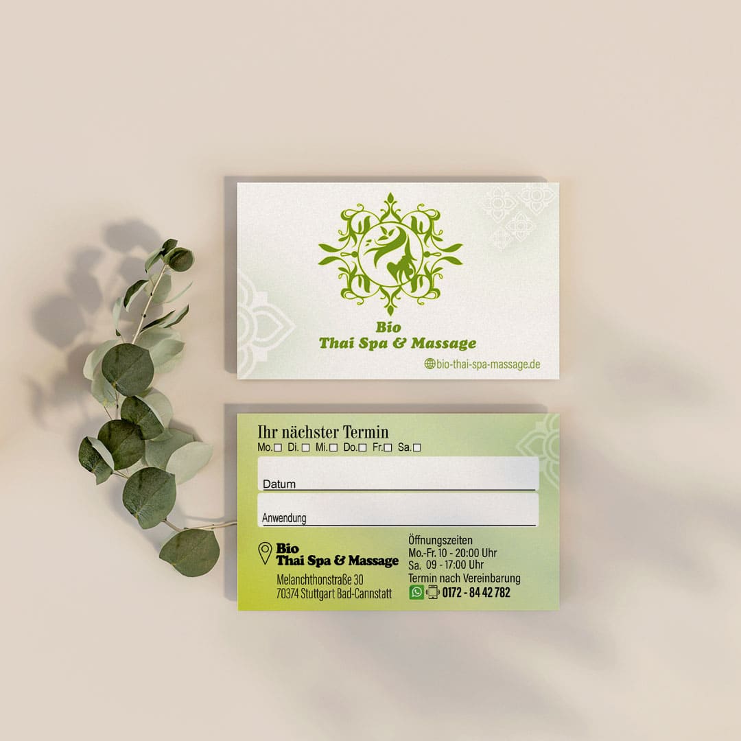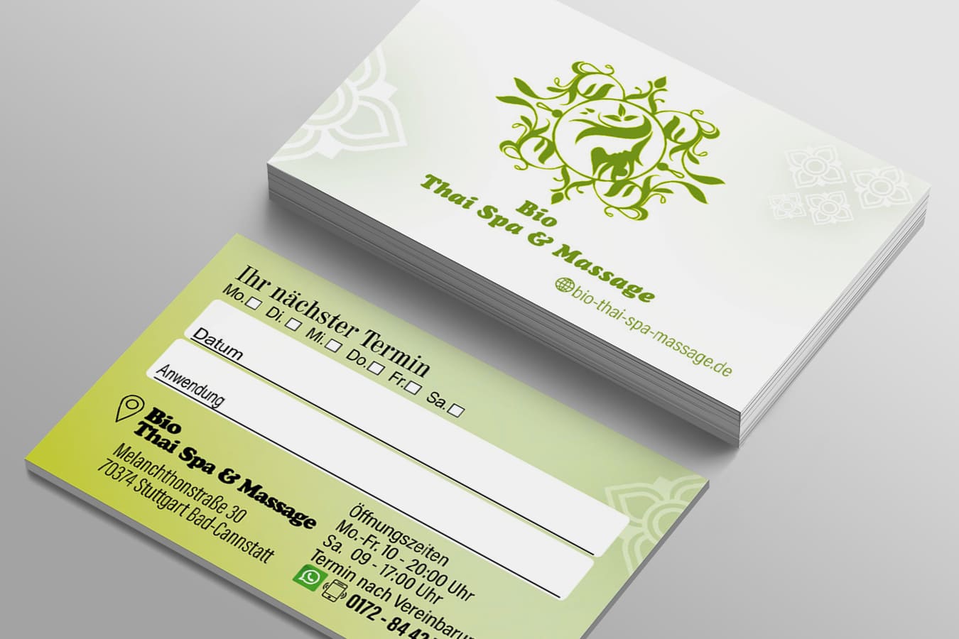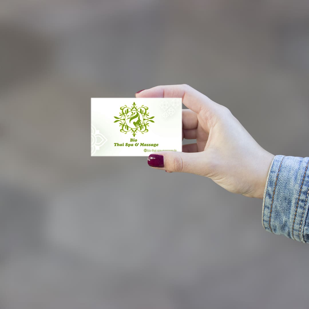 Entdecken Sie das kreative Visitenkarten-Design für Ihr Bio Spa bei Thai-Webmaster DE. Lassen Sie sich von unseren erfahrenen Grafikdesignern inspirieren und erhalten Sie eine maßgeschneiderte Gestaltung!