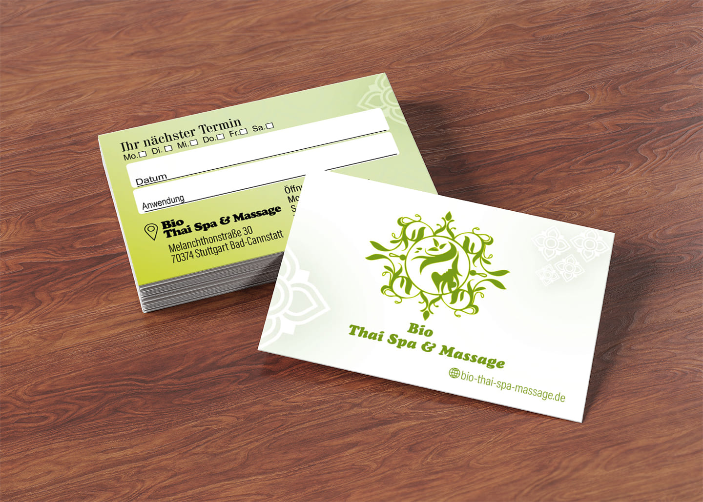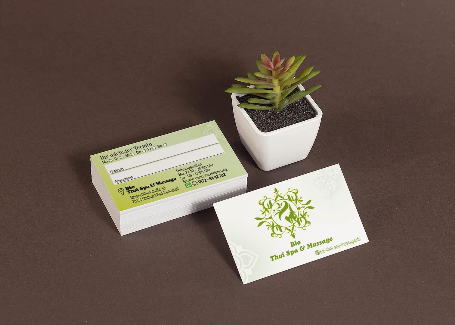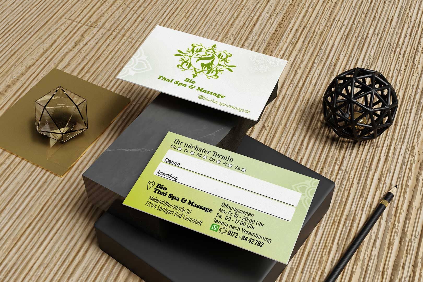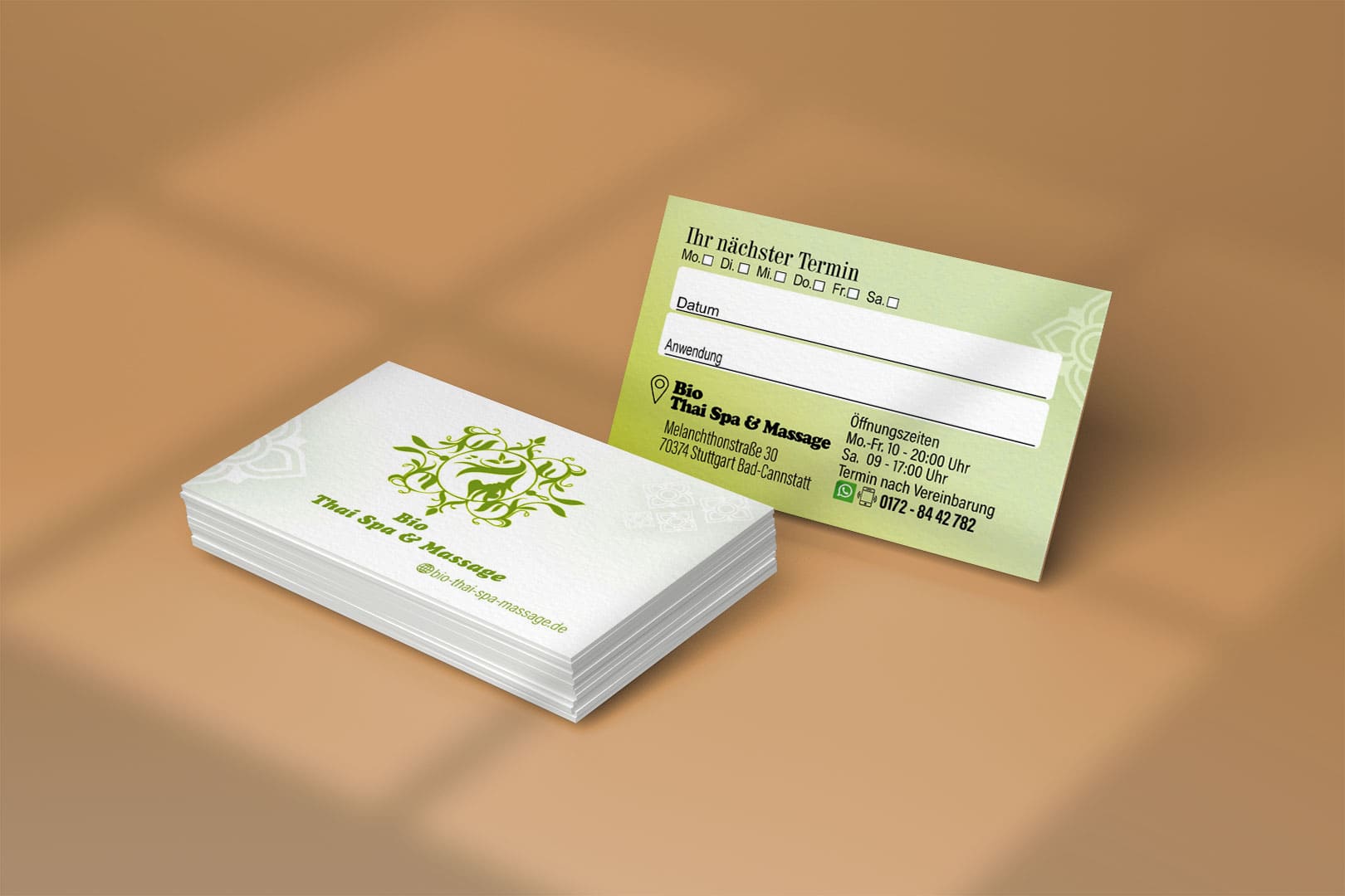 Entdecken Sie das kreative Visitenkarten-Design für Ihr Bio Spa bei Thai-Webmaster DE. Lassen Sie sich von unseren erfahrenen Grafikdesignern inspirieren und erhalten Sie eine maßgeschneiderte Gestaltung!