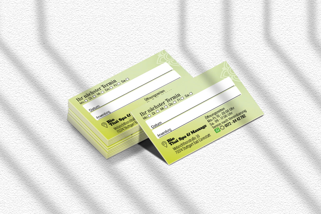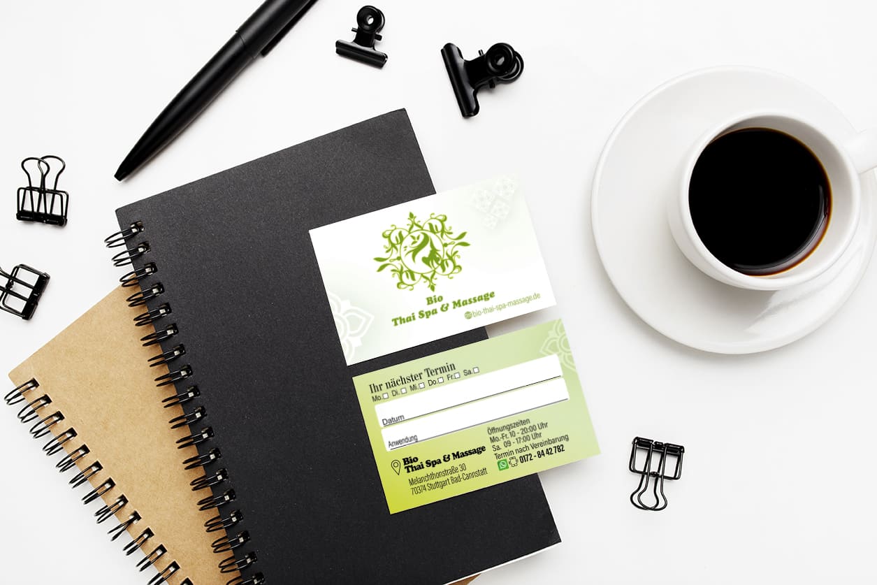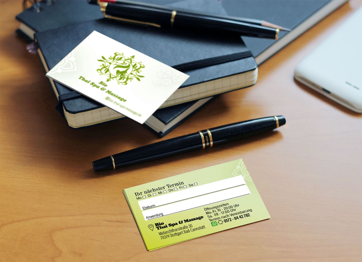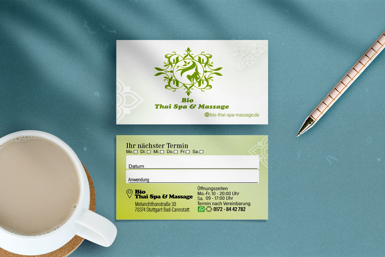 Entdecken Sie das kreative Visitenkarten-Design für Ihr Bio Spa bei Thai-Webmaster DE. Lassen Sie sich von unseren erfahrenen Grafikdesignern inspirieren und erhalten Sie eine maßgeschneiderte Gestaltung!