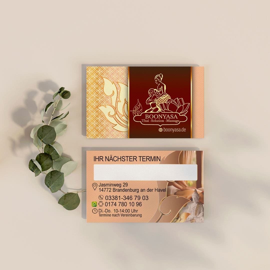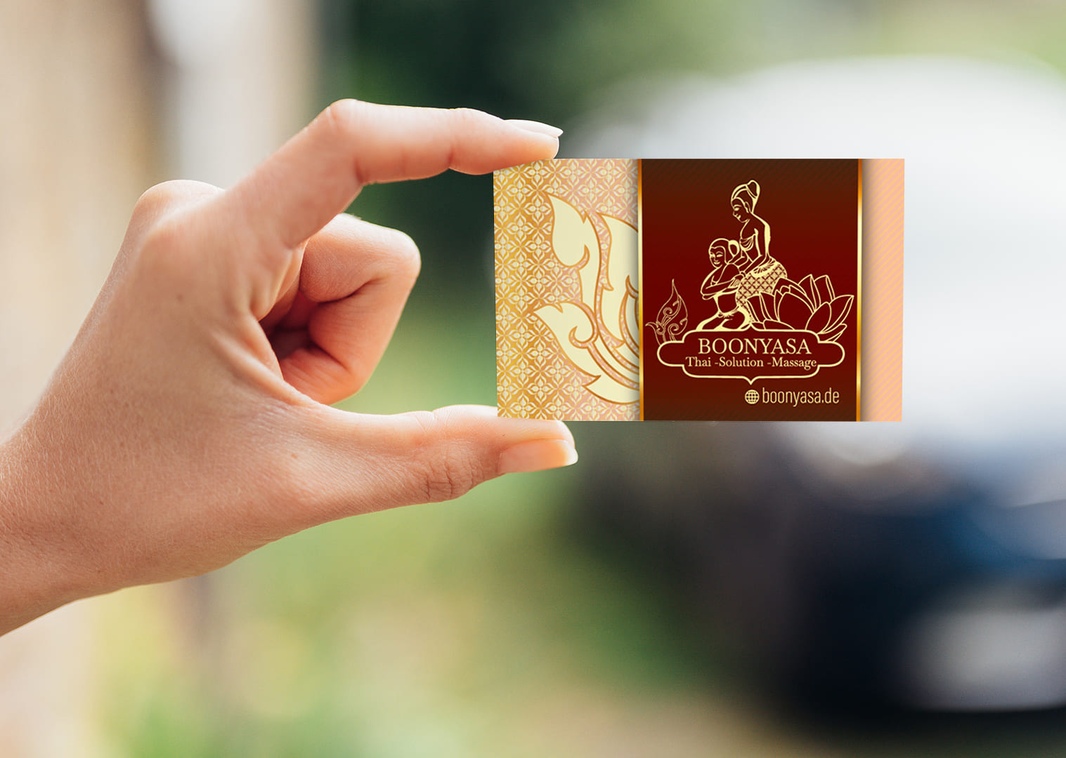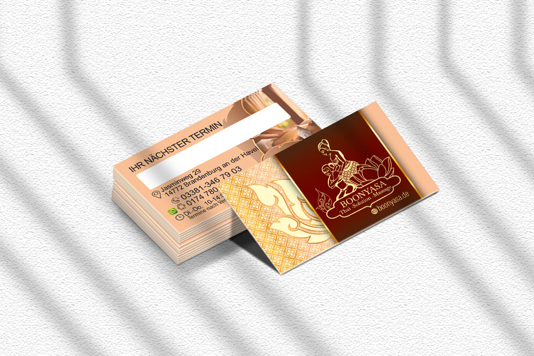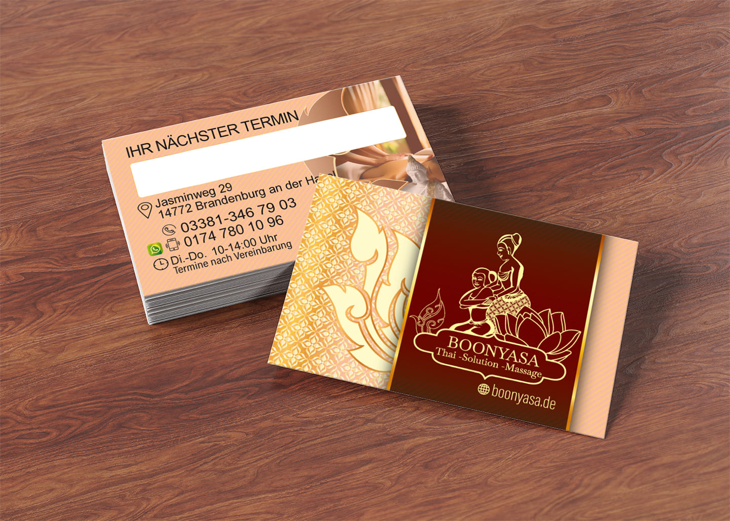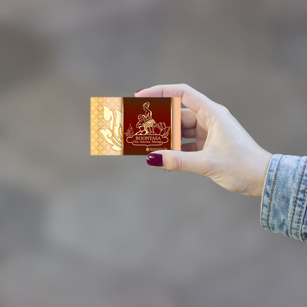 Visitenkarte Design Boonyasa Thai-Massage Lassen Sie sich von unseren thailändischen Grafikdesignern inspirieren und erhalten Sie eine individuell gestaltete Visitenkarte, die Ihr Massagestudio optimal repräsentiert.