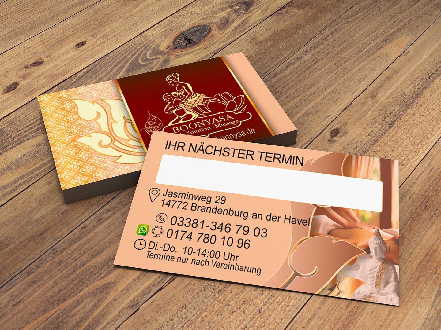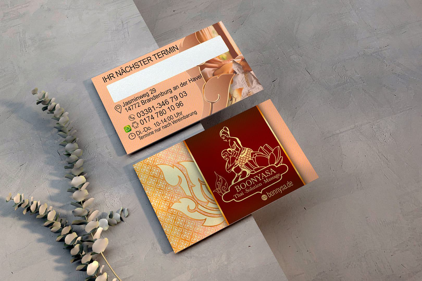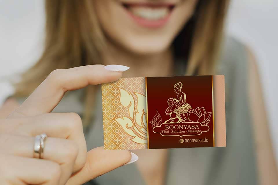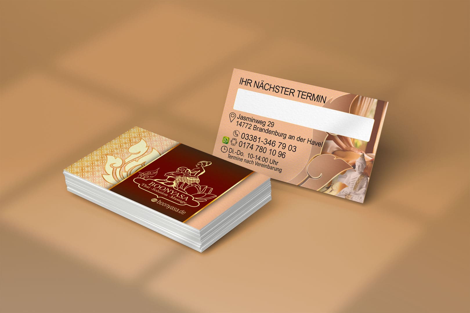 Visitenkarte Design Boonyasa Thai-Massage Lassen Sie sich von unseren thailändischen Grafikdesignern inspirieren und erhalten Sie eine individuell gestaltete Visitenkarte, die Ihr Massagestudio optimal repräsentiert.