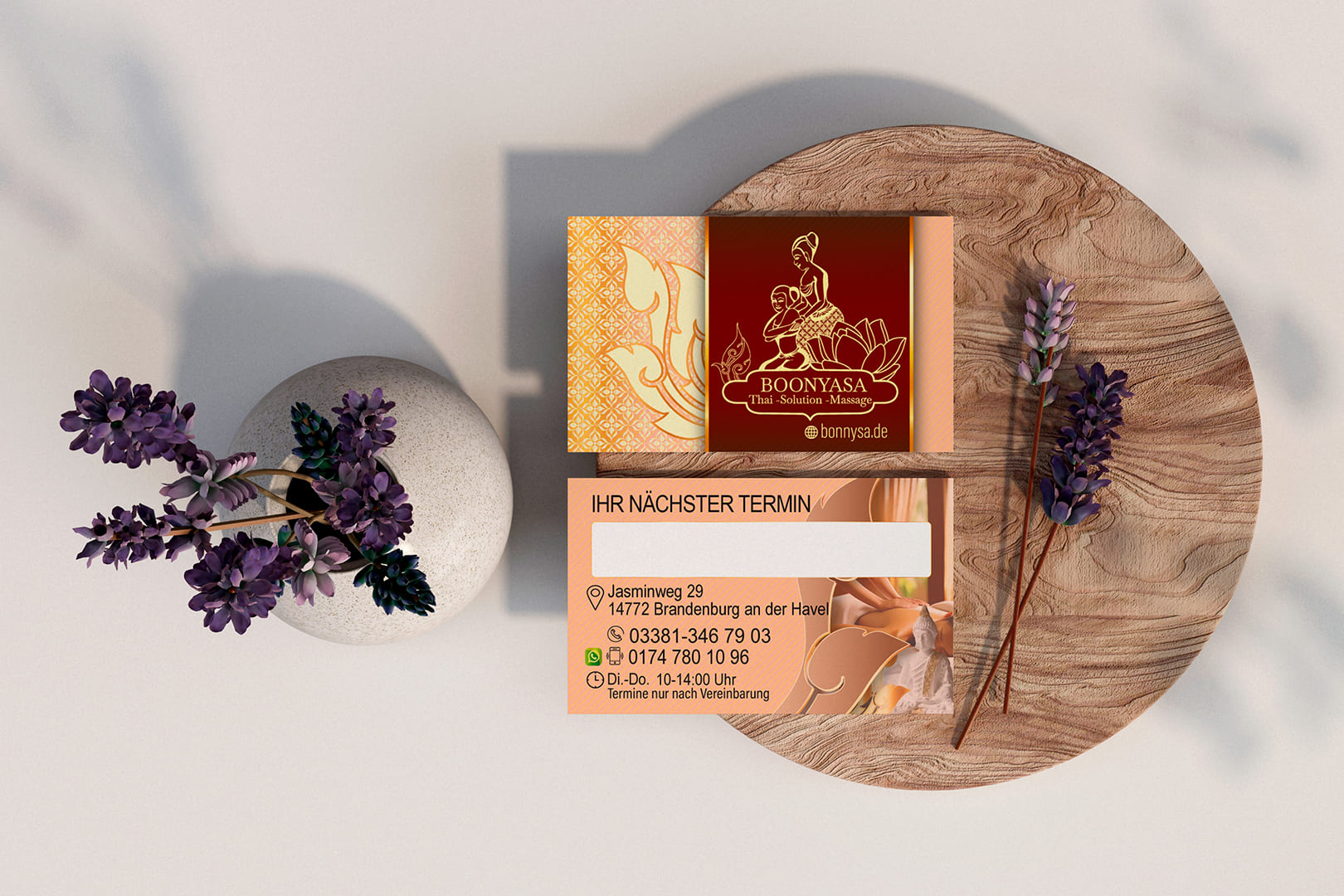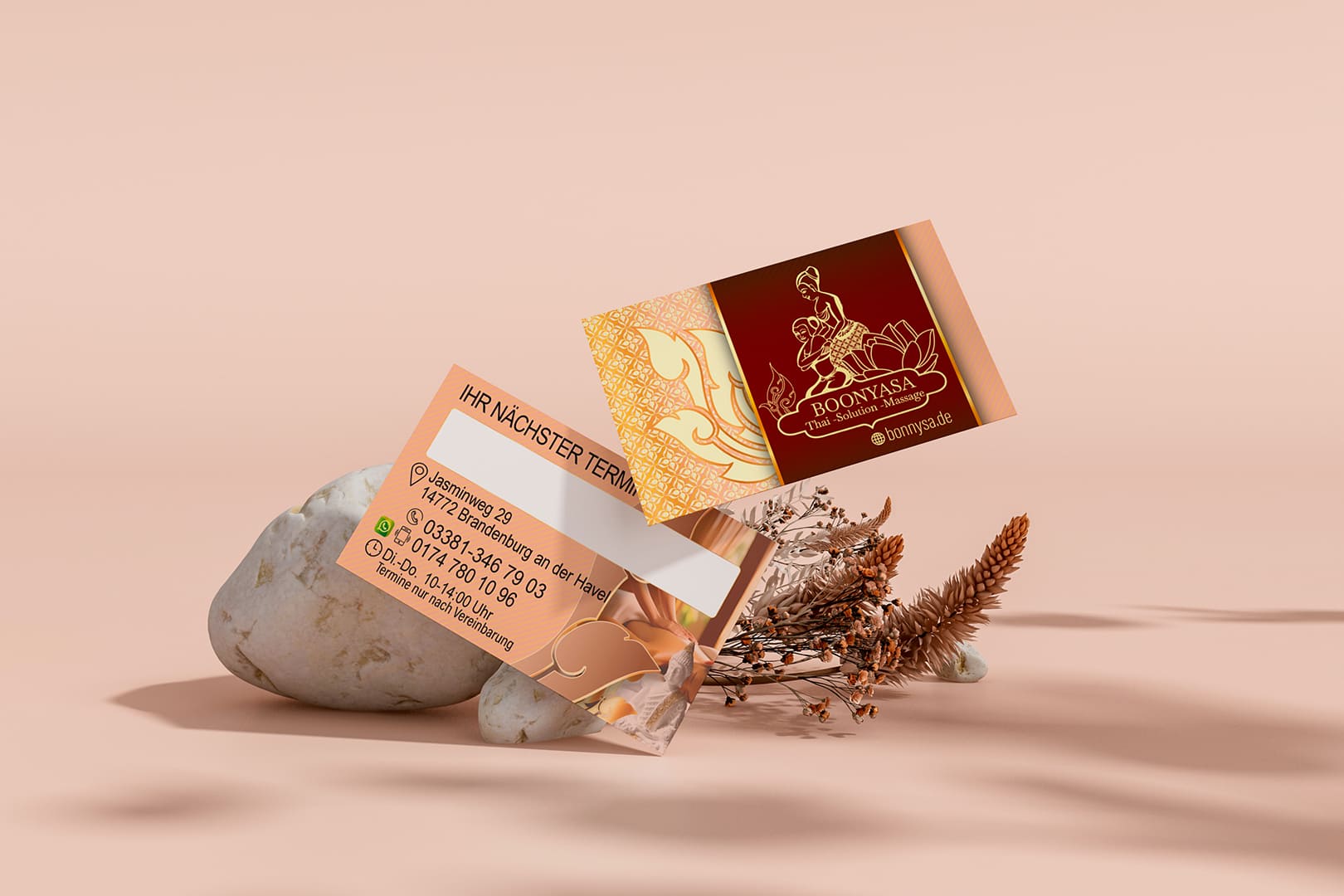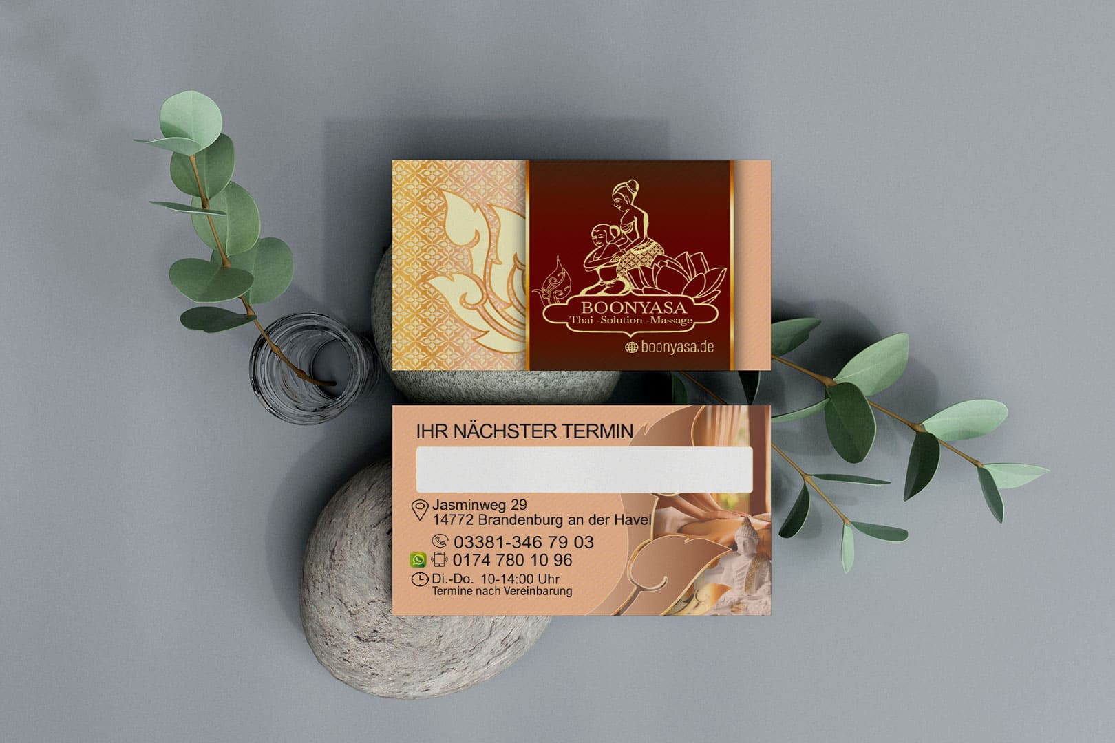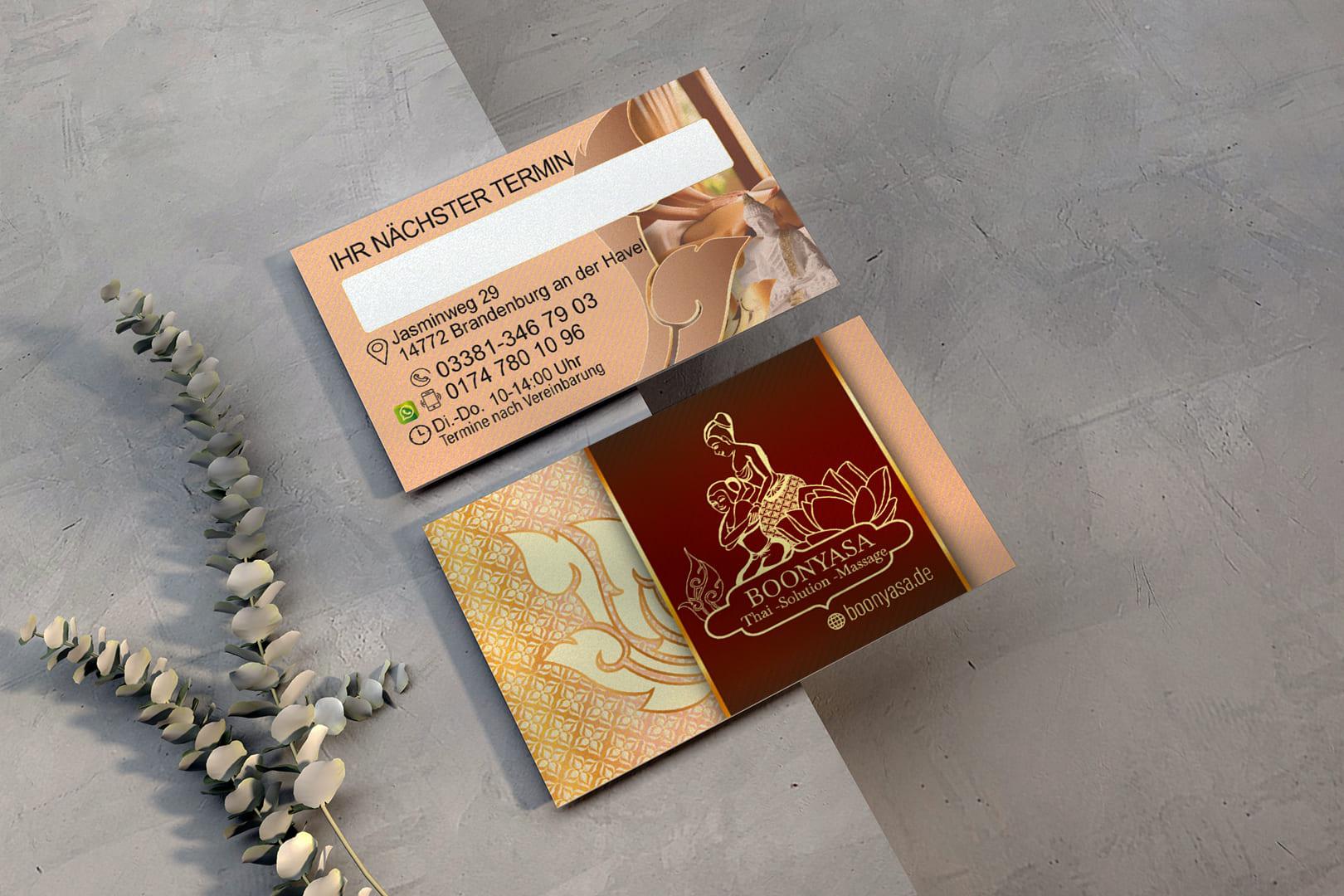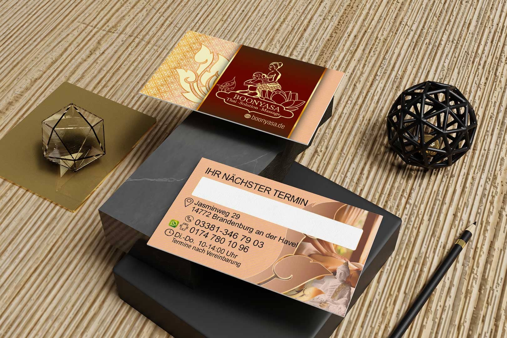 Visitenkarte Design Boonyasa Thai-Massage Lassen Sie sich von unseren thailändischen Grafikdesignern inspirieren und erhalten Sie eine individuell gestaltete Visitenkarte, die Ihr Massagestudio optimal repräsentiert.