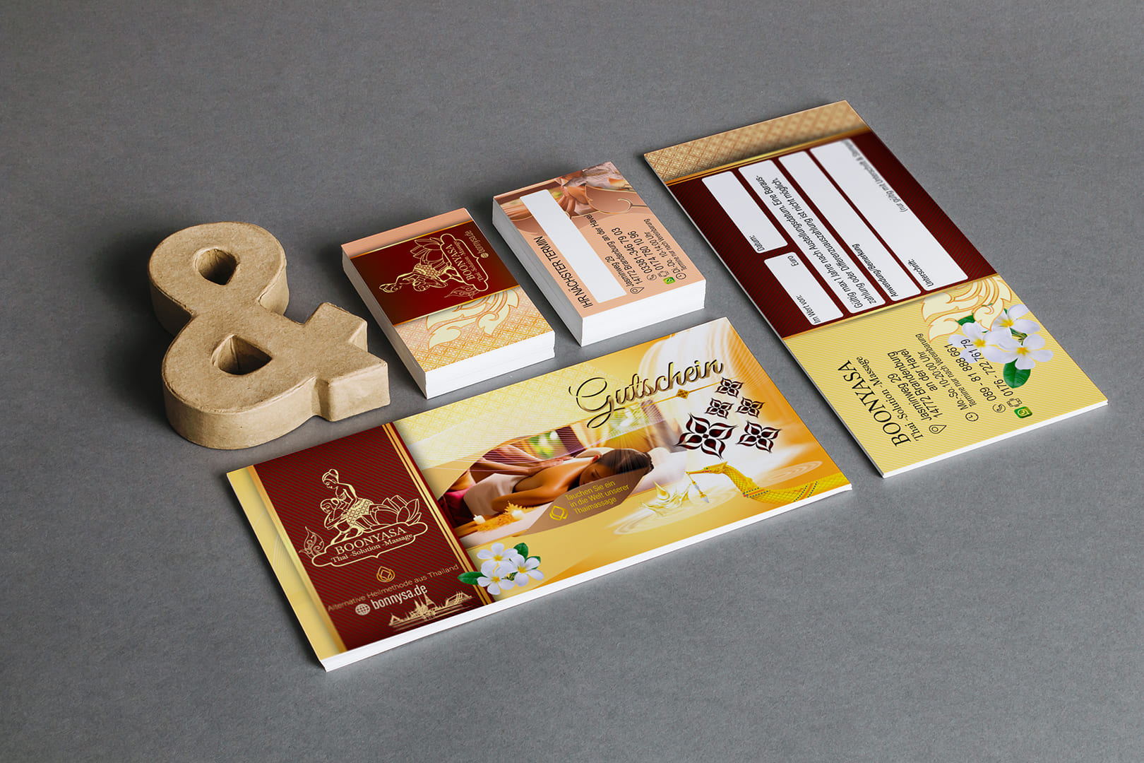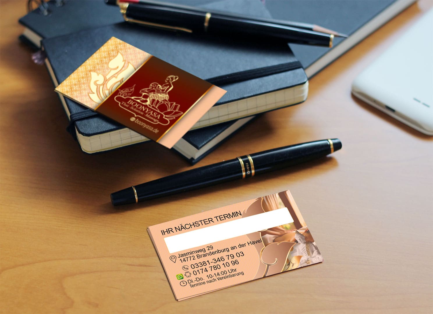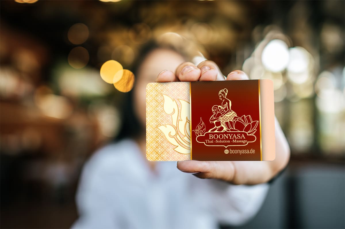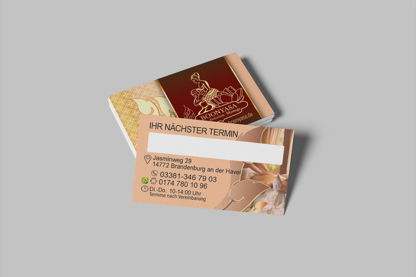 Visitenkarte Design Boonyasa Thai-Massage Lassen Sie sich von unseren thailändischen Grafikdesignern inspirieren und erhalten Sie eine individuell gestaltete Visitenkarte, die Ihr Massagestudio optimal repräsentiert.
