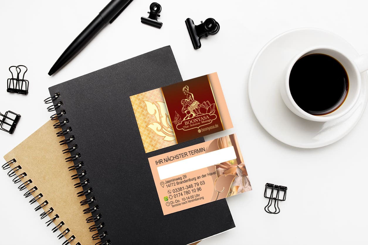Entdecken Sie kreative Visitenkarten-Designs für Ihr Massagestudio bei Thai-Webmaster DE. Lassen Sie sich inspirieren und erhalten Sie eine individuell gestaltete Visitenkarte, die einen bleibenden Eindruck hinterlässt.