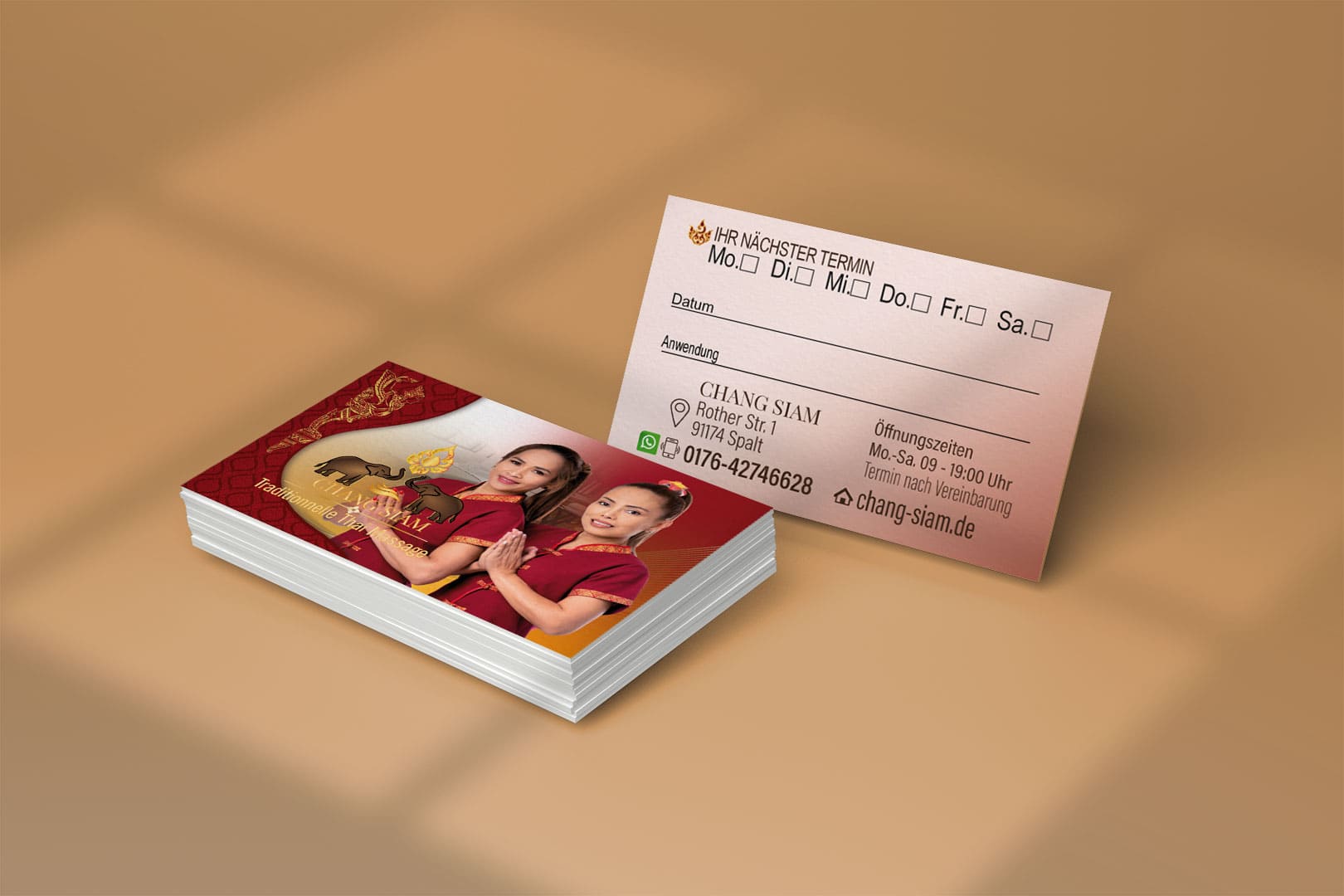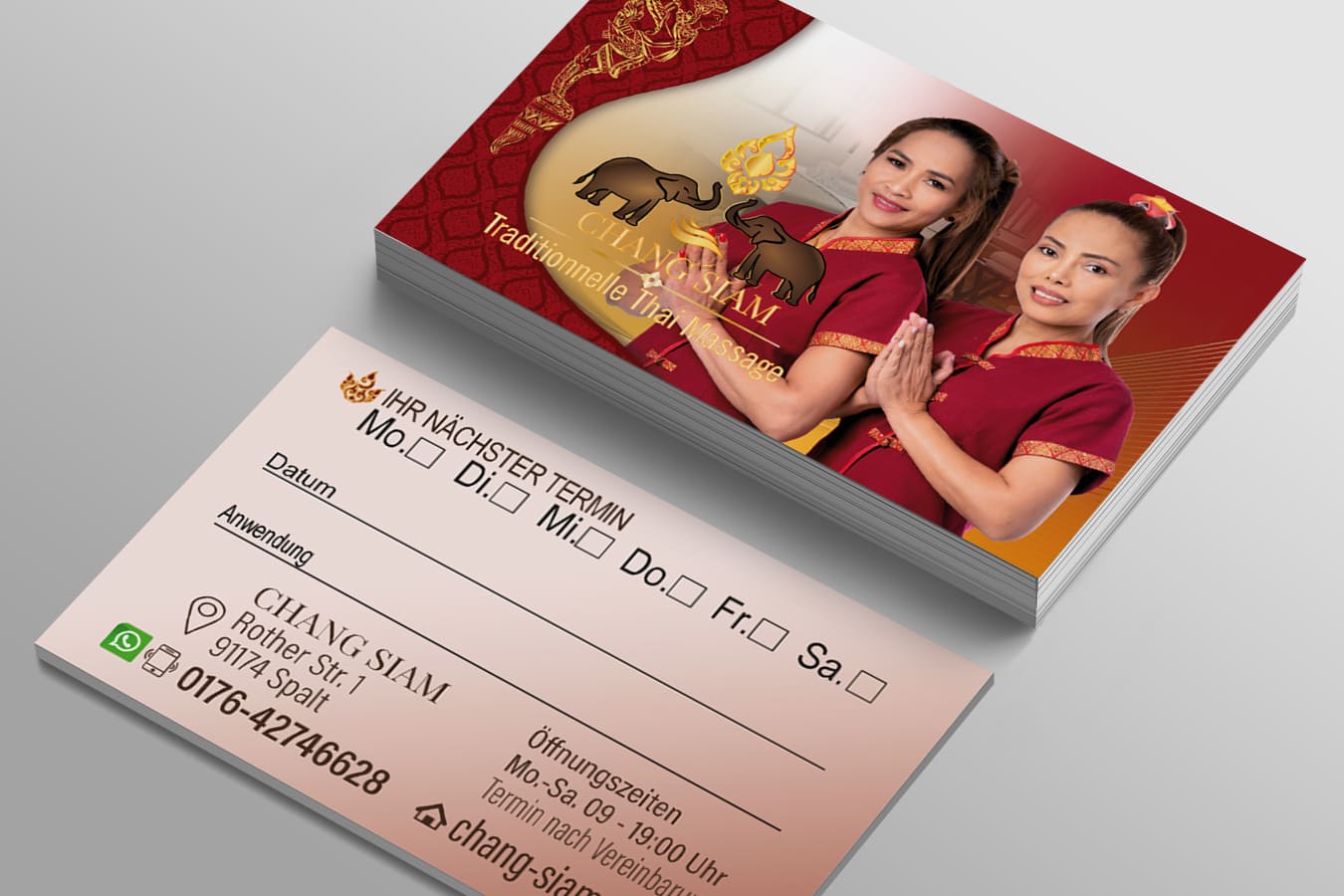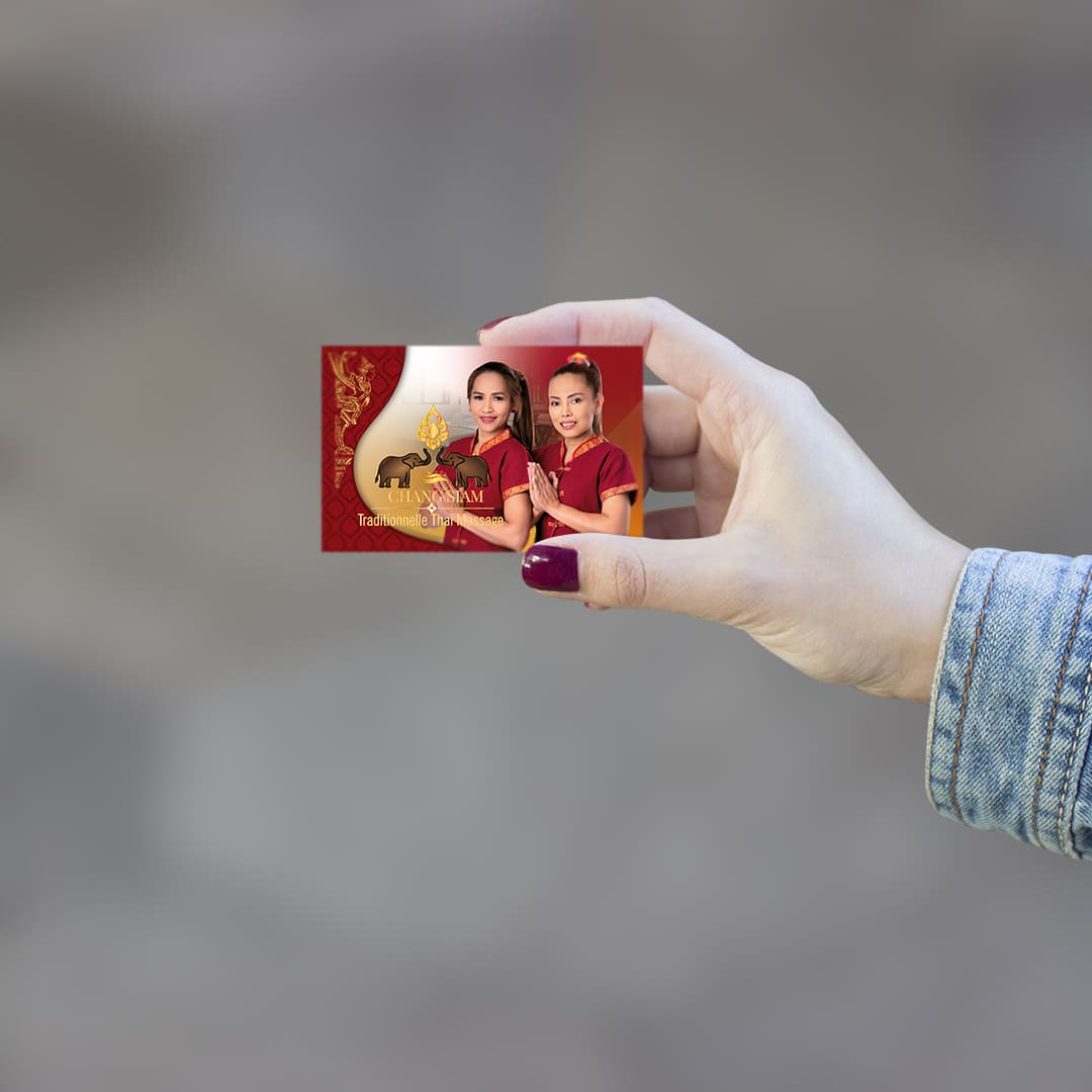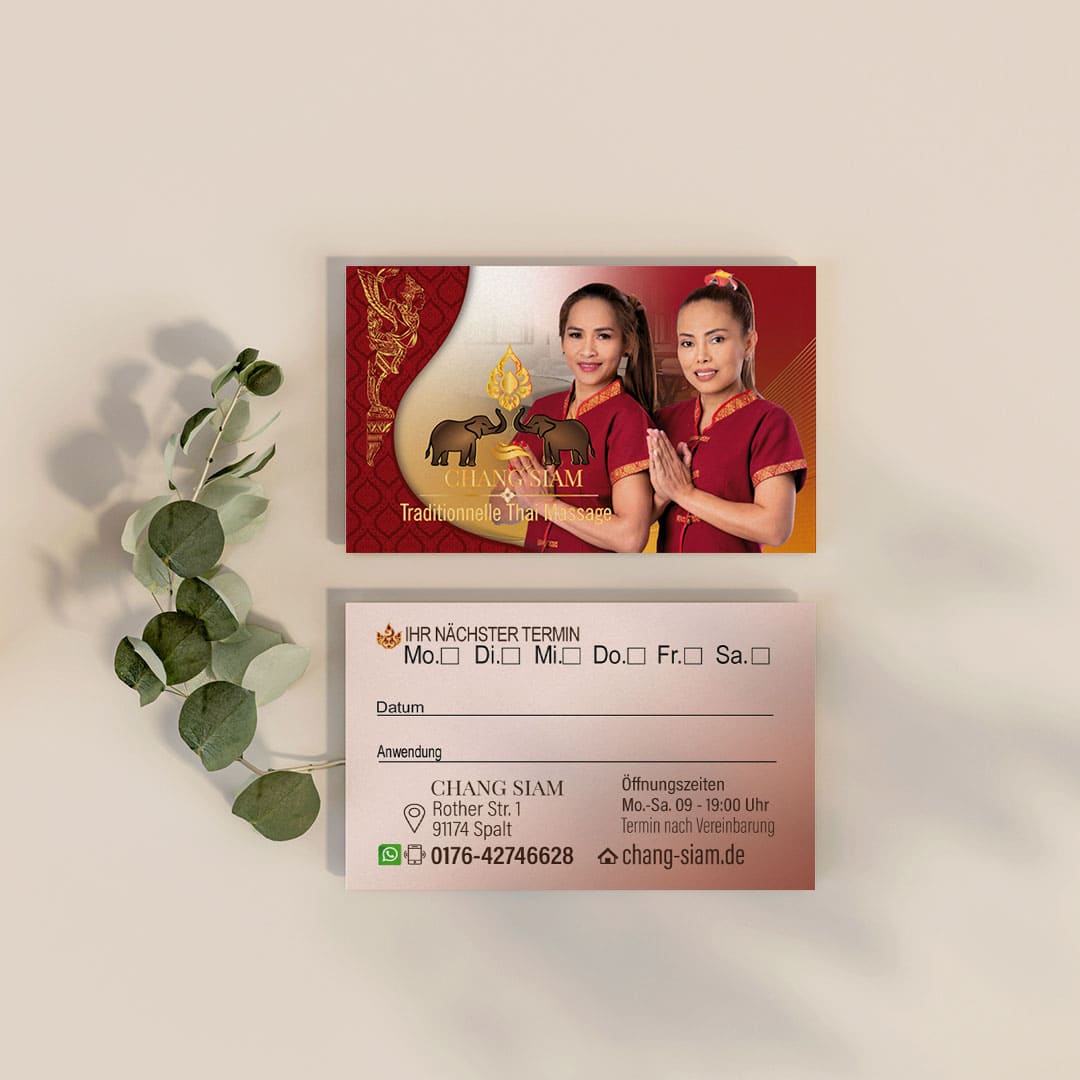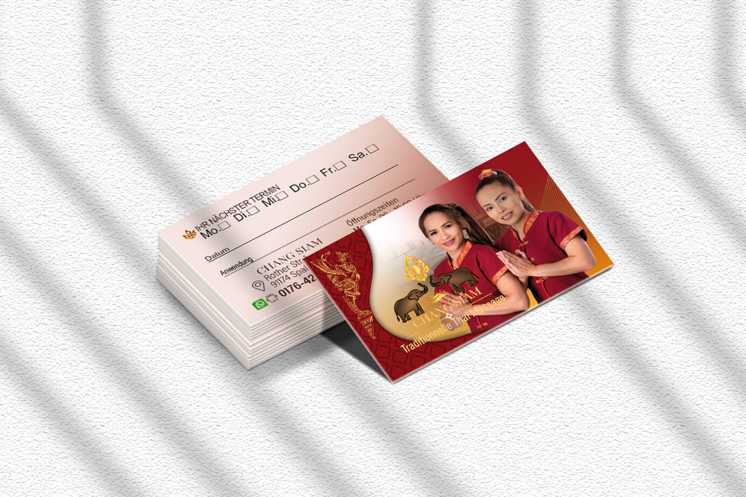 Visitenkarte Desing Chang Siam Mit unserem professionellen Design für Ihre Thai-Massage Praxis Visitenkarte hinterlassen Sie einen bleibenden Eindruck bei Ihren Kunden.