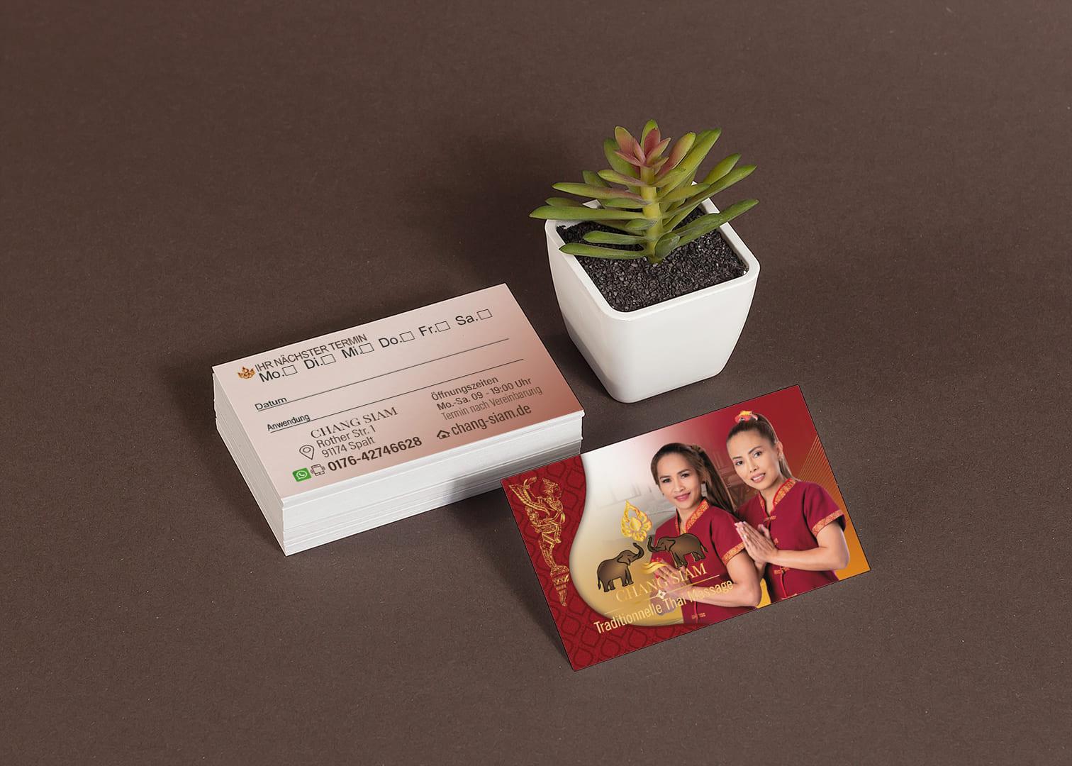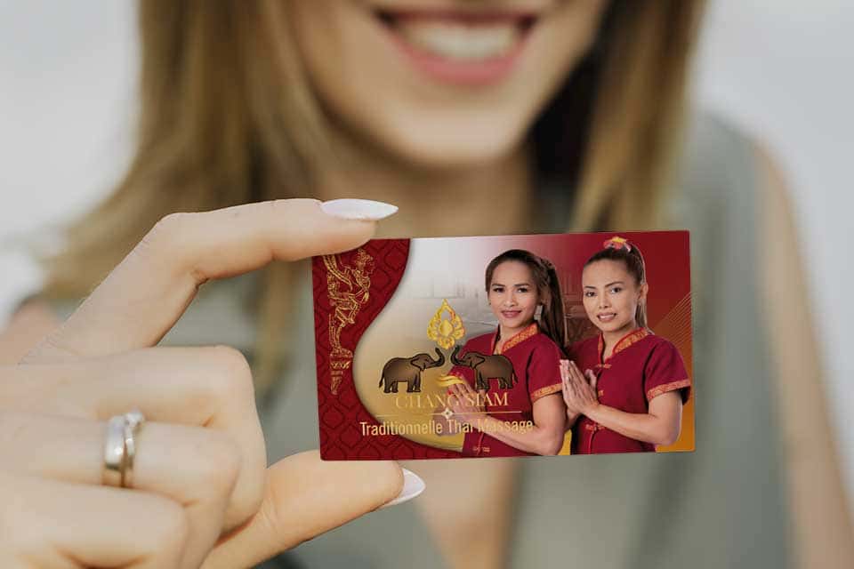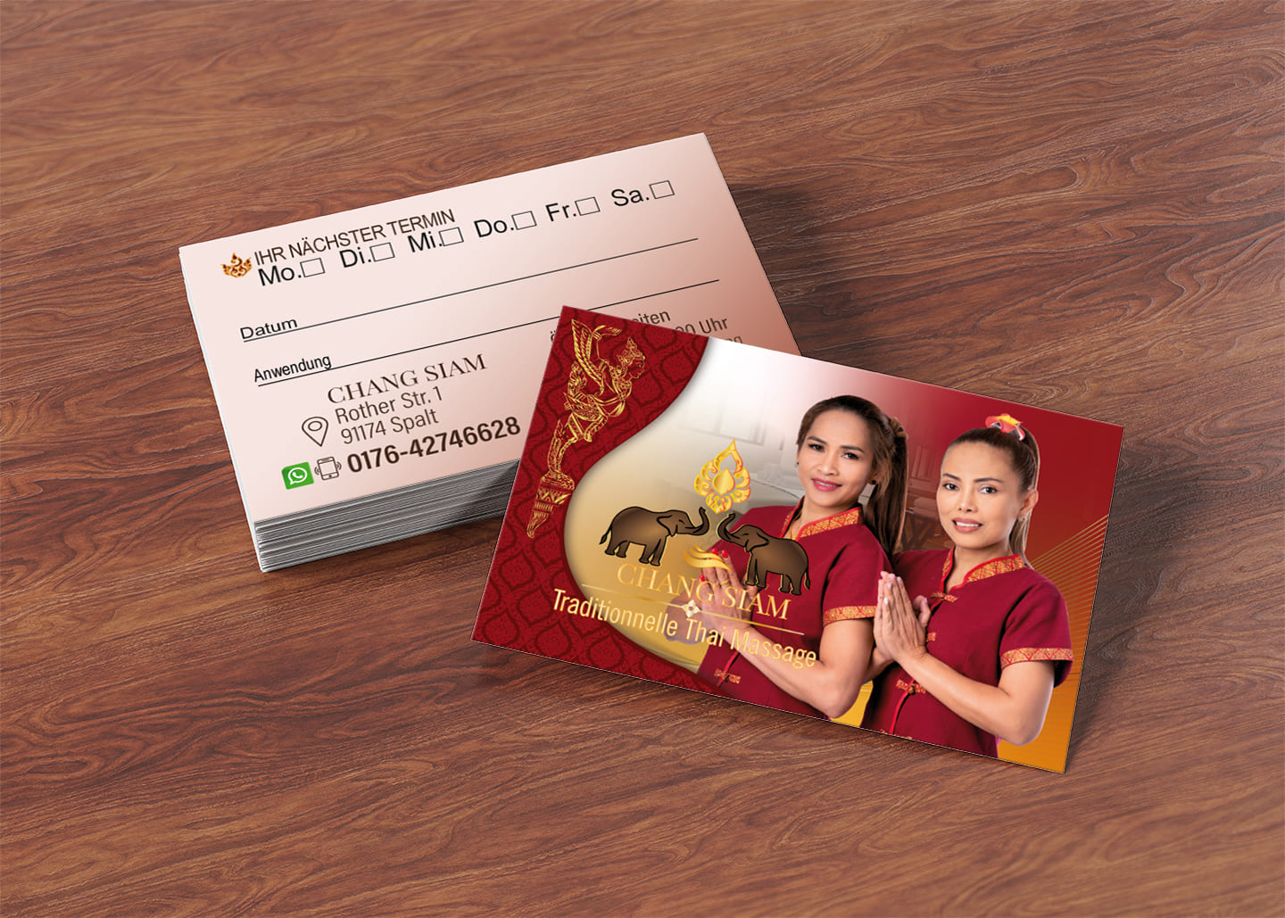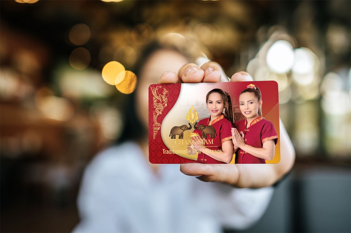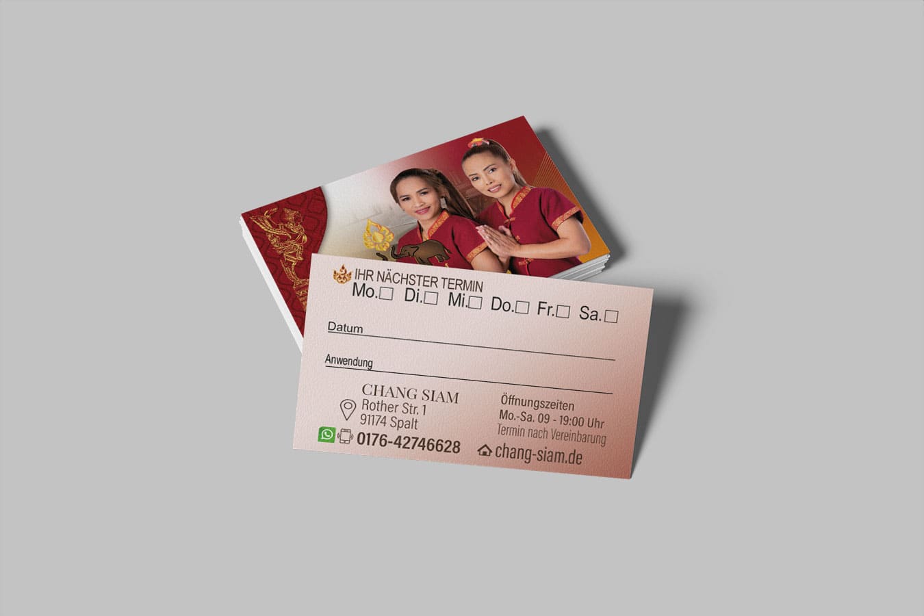 Visitenkarte Desing Chang Siam Mit unserem professionellen Design für Ihre Thai-Massage Praxis Visitenkarte hinterlassen Sie einen bleibenden Eindruck bei Ihren Kunden.