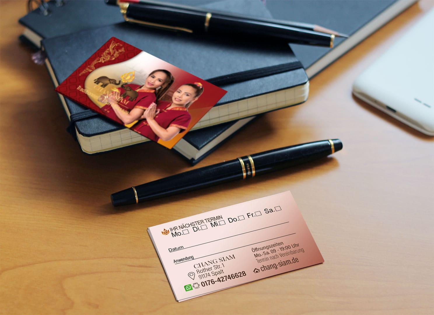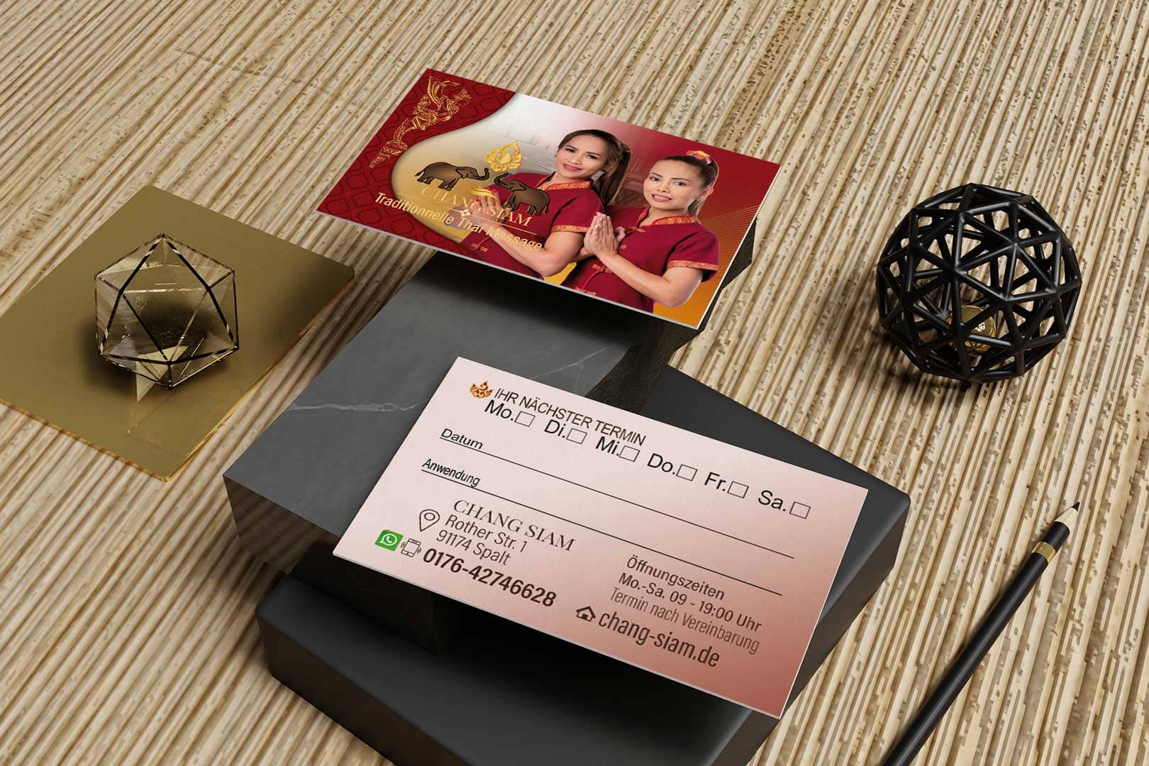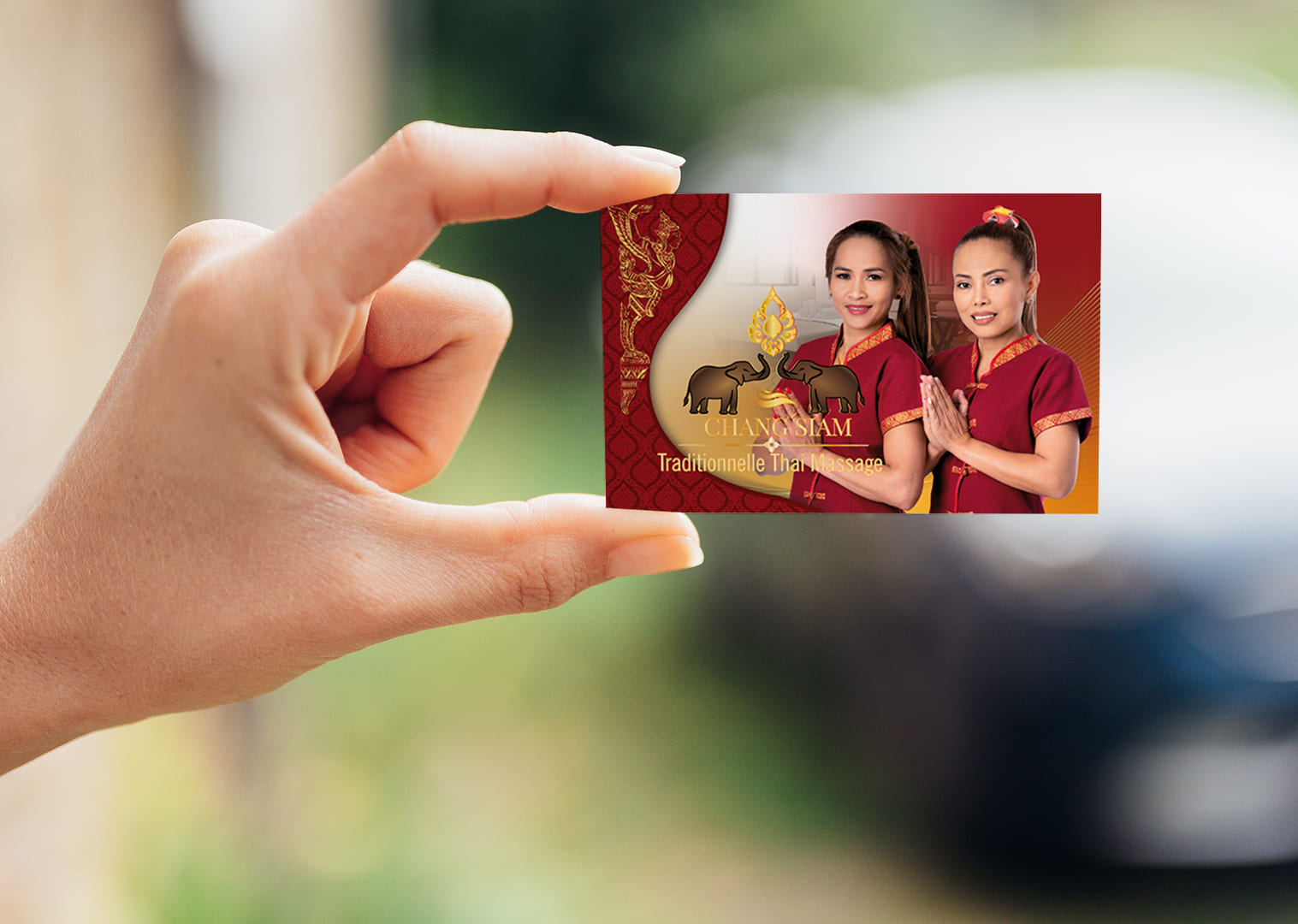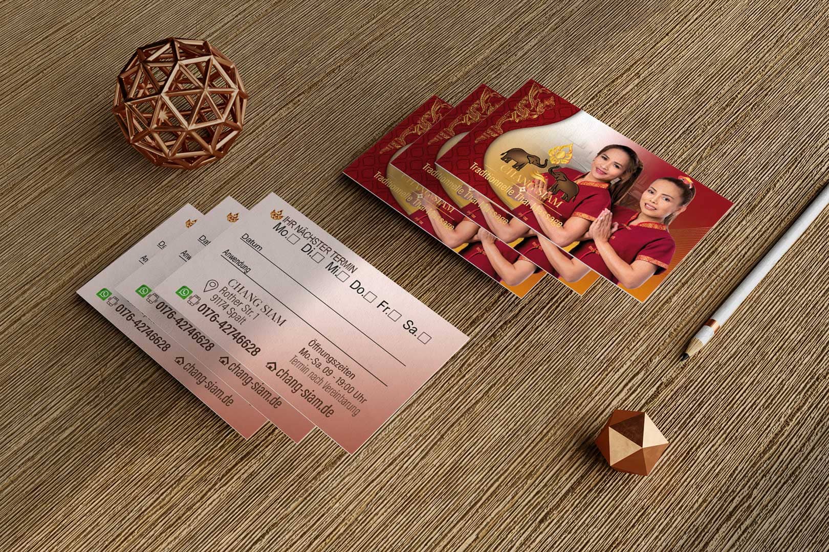 Visitenkarte Desing Chang Siam Mit unserem professionellen Design für Ihre Thai-Massage Praxis Visitenkarte hinterlassen Sie einen bleibenden Eindruck bei Ihren Kunden.