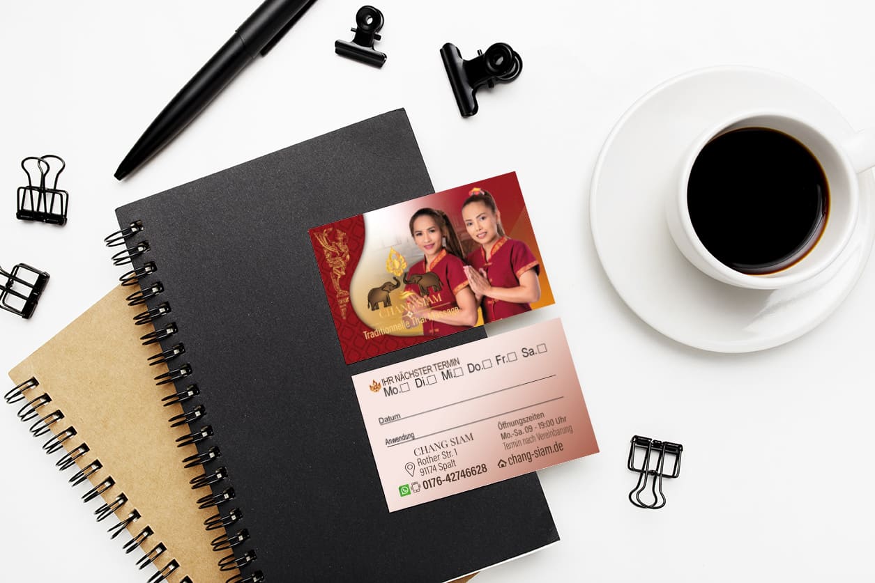 Unsere erfahrenen thailändischen Grafikdesigner sind darauf spezialisiert, individuell gestaltete Visitenkarten zu entwerfen, die Ihr Massagestudio optimal repräsentieren. Mit unserem kreativen Know-how helfen wir Ihnen, eine Visitenkarte zu kreieren, die sich von der Konkurrenz abhebt und einen bleibenden Eindruck bei Ihren Kunden hinterlässt.
