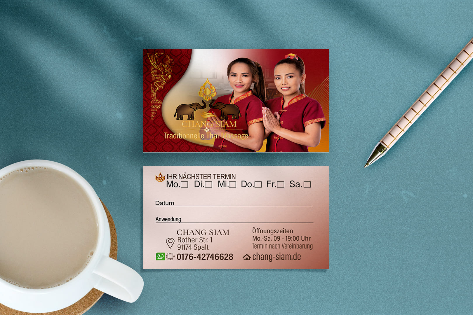 Willkommen auf Thai-Webmaster DE, Ihrer ersten Adresse für kreatives Grafikdesign im Bereich der thailändischen Massage. Auf unserer Website stellen wir Ihnen das neueste Referenzdesign für die Visitenkarte der Chang Siam Thai-Massage in Spalt vor. Unser Ziel ist es, Sie zu inspirieren und zu informieren, indem wir Ihnen ein innovatives und ansprechendes Design präsentieren, das die Kreativität und das handwerkliche Geschick unseres talentierten Teams widerspiegelt.