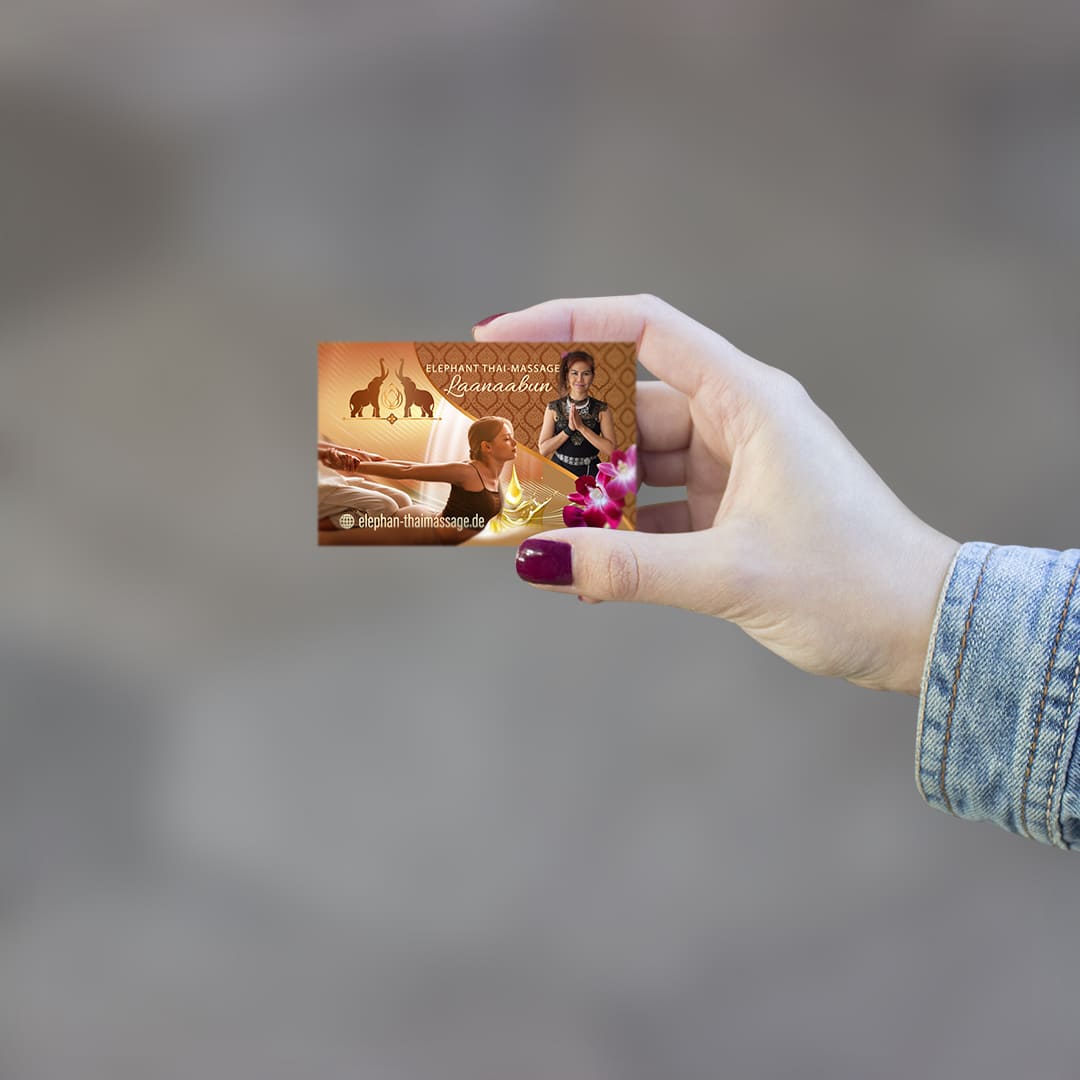 Visitenkarten Design Elephnt Thai-Massage Lassen Sie sich von unseren erfahrenen Thai Webmastern eine maßgeschneiderte Visitenkarte für Ihre Massagepraxis gestalten - Made in Germany.