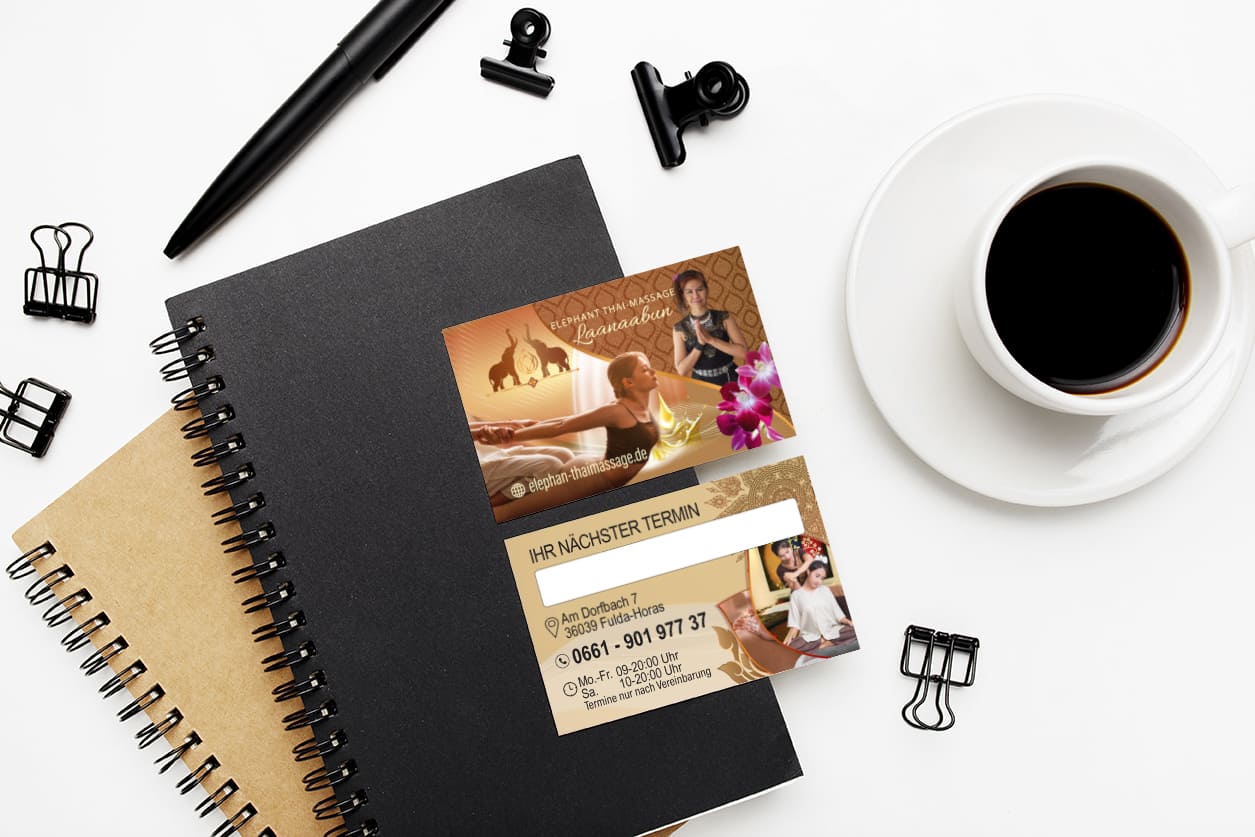 Entdecken Sie kreative Visitenkarten-Designs für Ihr Massagestudio bei Thai-Webmaster DE. Lassen Sie sich inspirieren und erhalten Sie eine individuell gestaltete Visitenkarte, die einen bleibenden Eindruck hinterlässt.