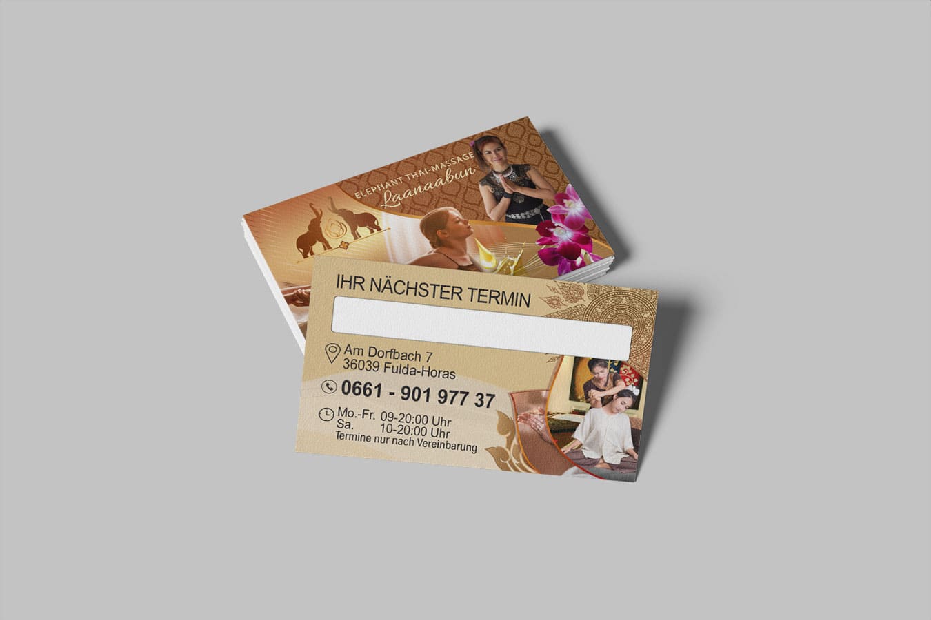 Entdecken Sie kreative Visitenkarten-Designs für Ihr Thai-Massage-Studio bei Thai-Webmaster DE. Lassen Sie sich inspirieren und kontaktieren Sie uns für eine individuelle Gestaltung!