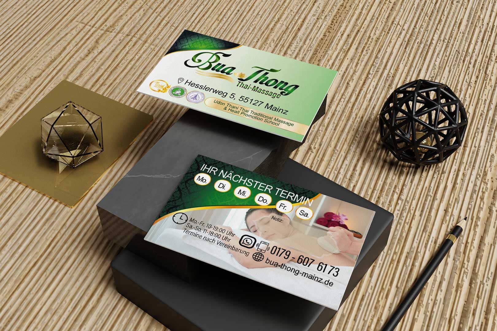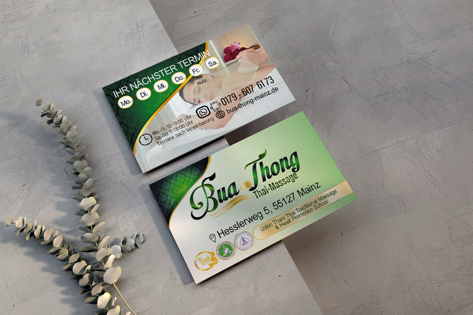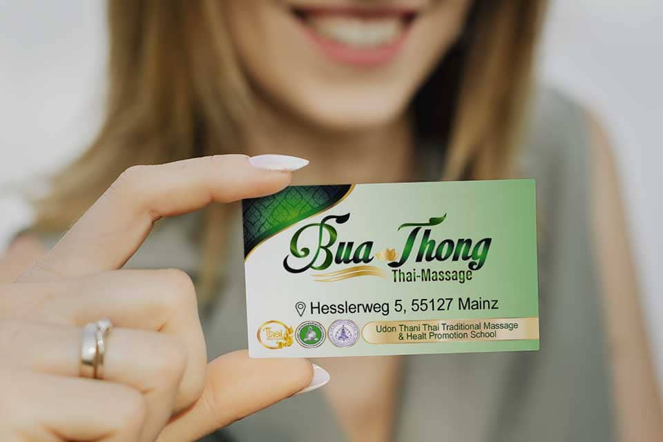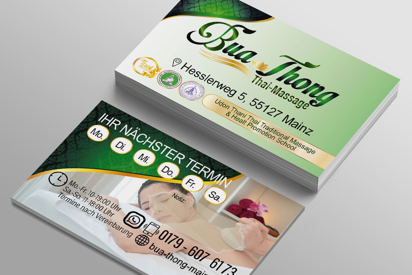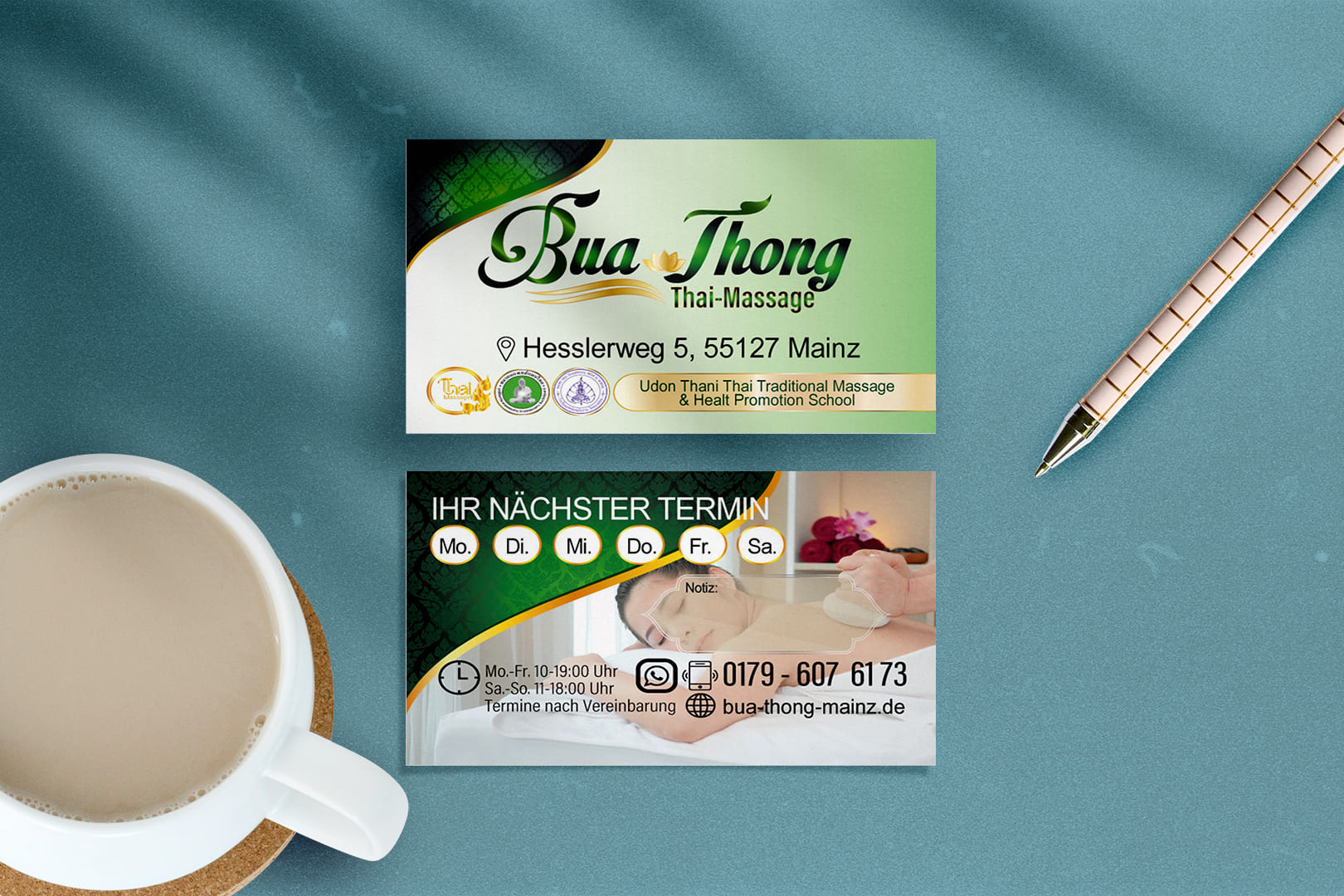 Willkommen auf Thai-Webmaster DE! Hier präsentieren wir Ihnen unser einzigartiges Referenzdesign für die Visitenkarte der Bua Thong Thai-Massage in Mainz. Unser Ziel ist es, Sie zu inspirieren und Ihnen neue Möglichkeiten im Grafikdesign aufzuzeigen. Unser innovatives Design-Projekt verkörpert die Kreativität und Expertise unseres talentierten Teams von Grafikdesignern.