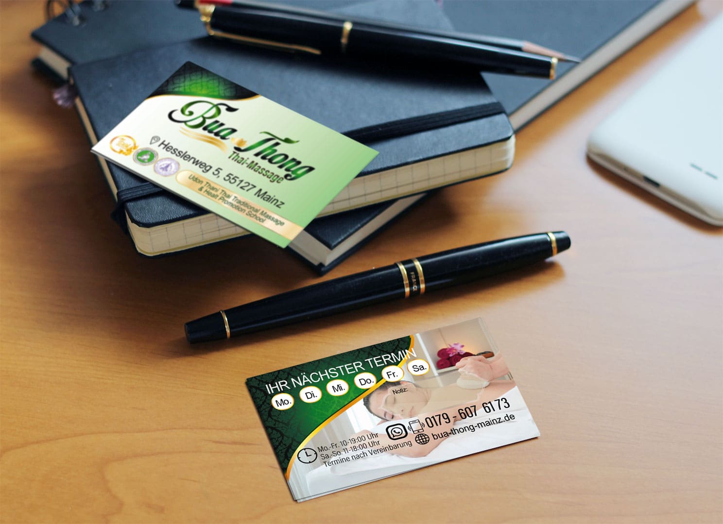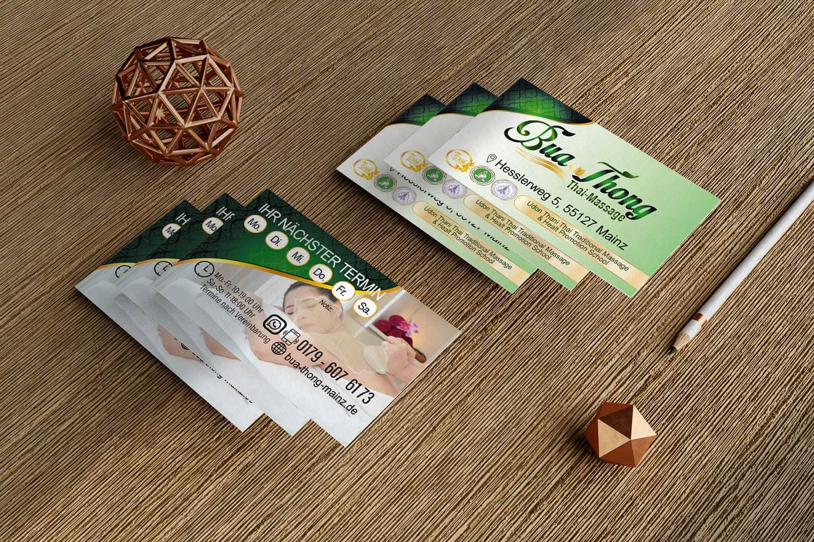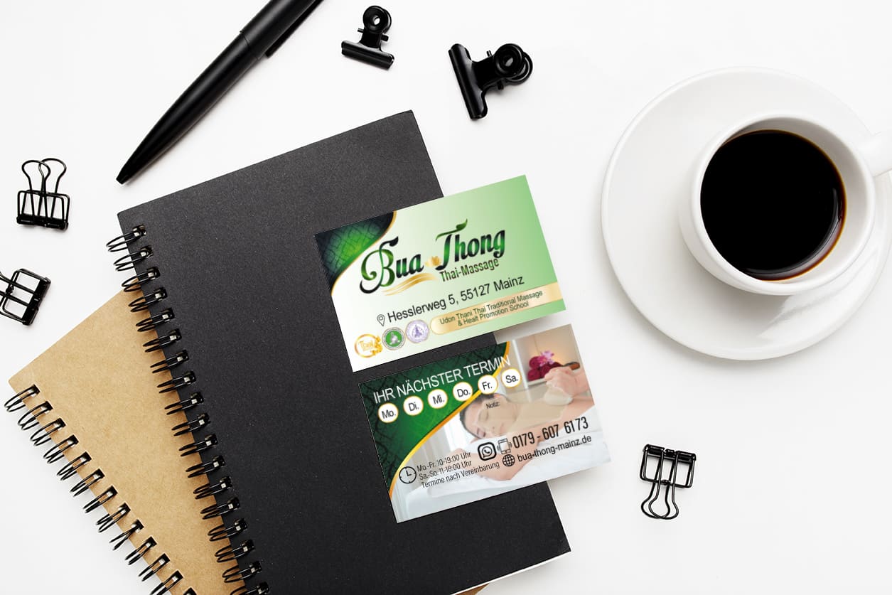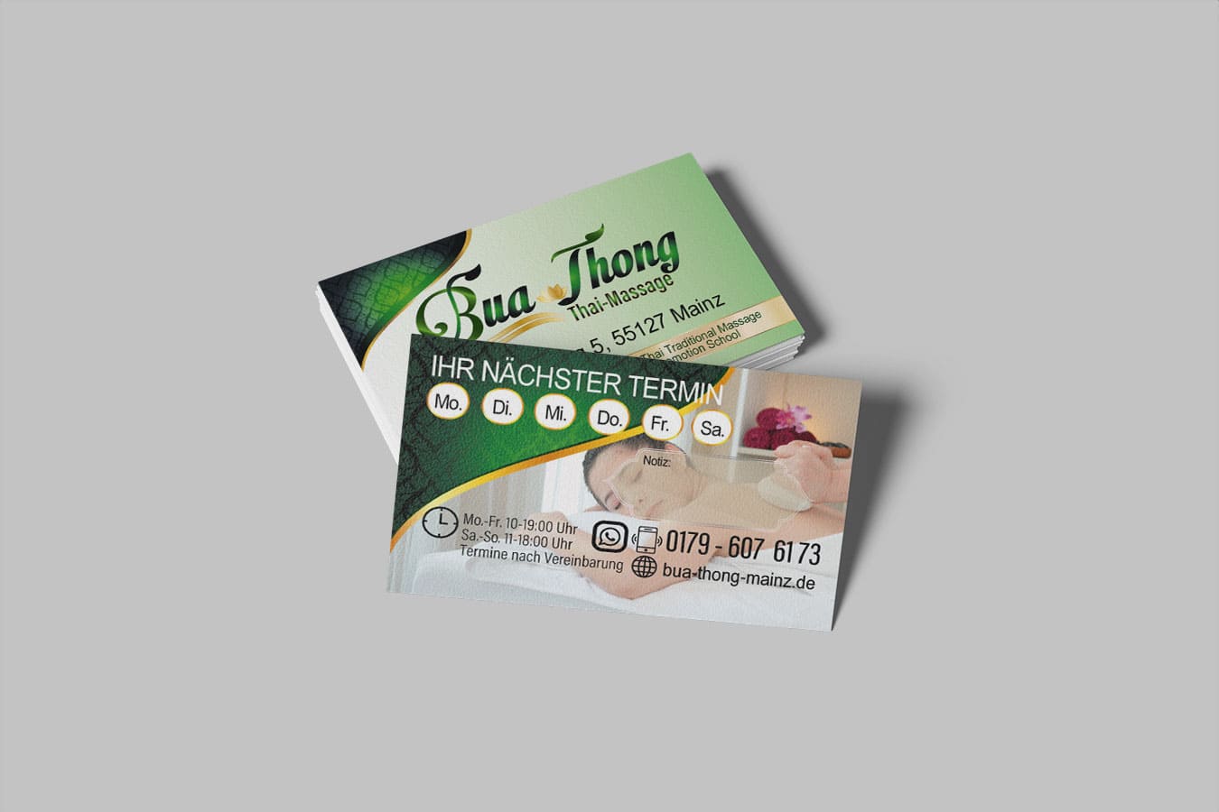 Willkommen auf Thai-Webmaster DE! Hier präsentieren wir Ihnen unser einzigartiges Referenzdesign für die Visitenkarte der Bua Thong Thai-Massage in Mainz. Unser Ziel ist es, Sie zu inspirieren und Ihnen neue Möglichkeiten im Grafikdesign aufzuzeigen. Unser innovatives Design-Projekt verkörpert die Kreativität und Expertise unseres talentierten Teams von Grafikdesignern.