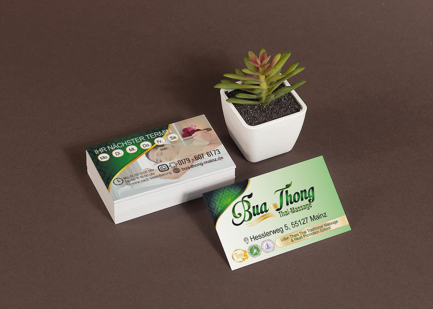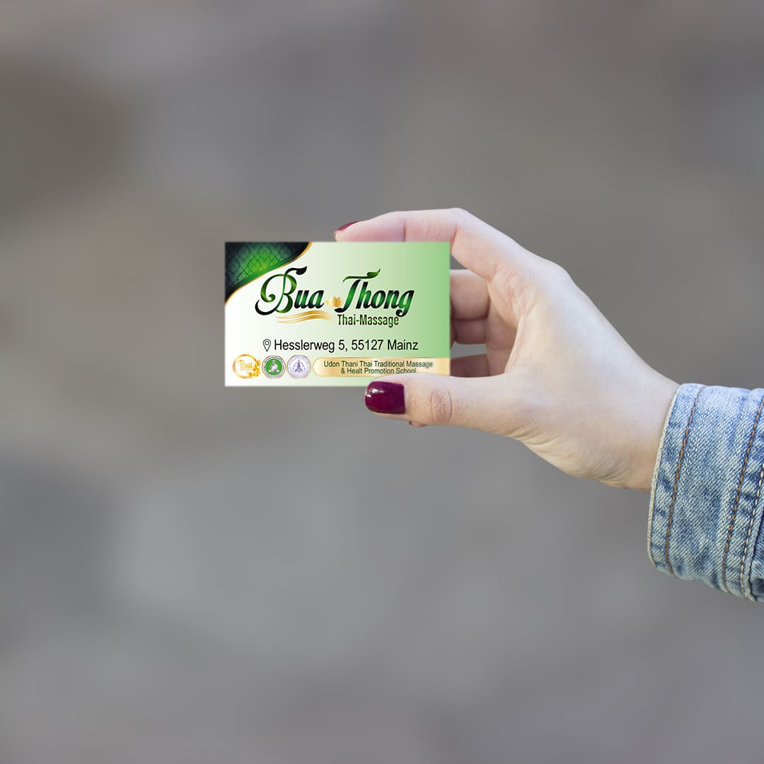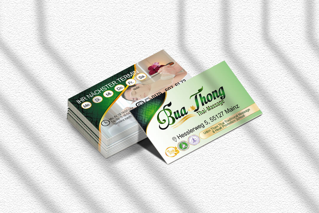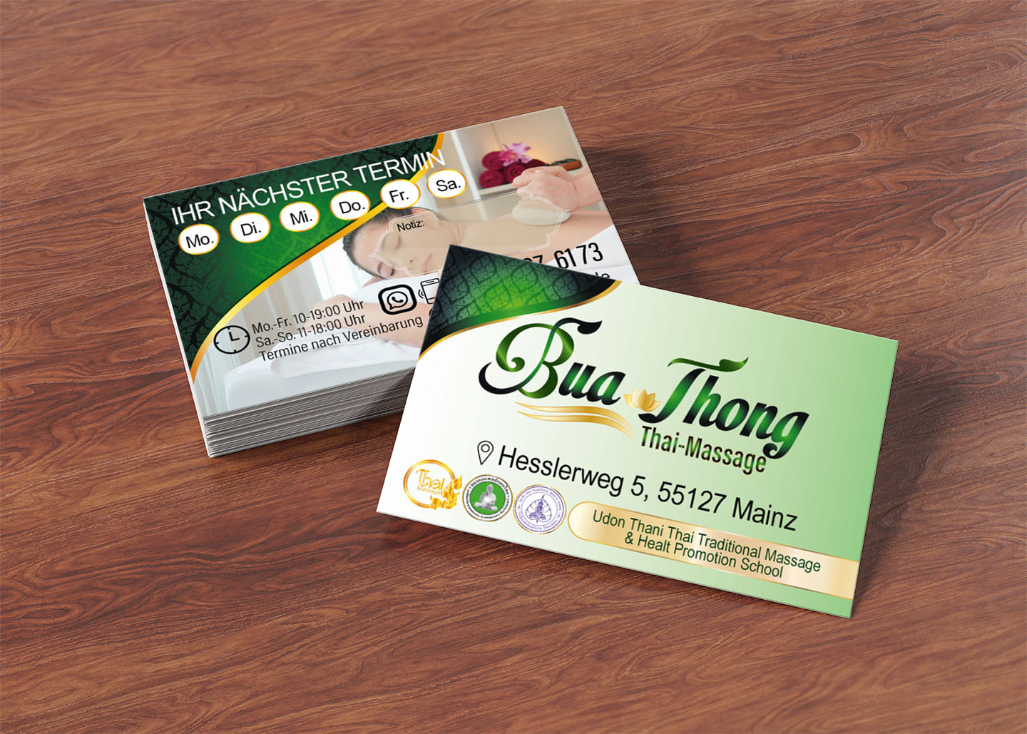 Visitenkarten Designs Buathong Thai-Massage Mainz Lassen Sie sich von unseren thailändischen Grafikdesignern inspirieren und erhalten Sie eine individuell gestaltete Visitenkarte, die Ihr Massagestudio optimal repräsentiert.